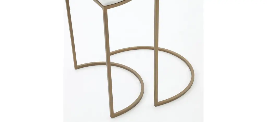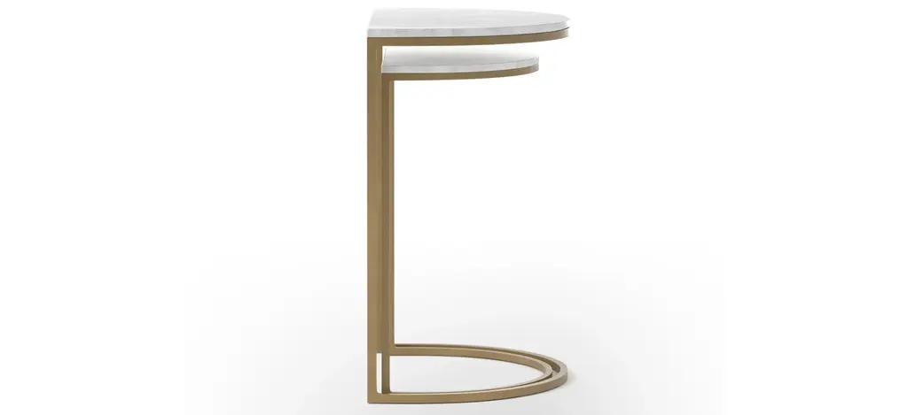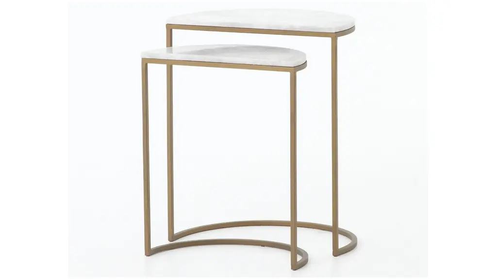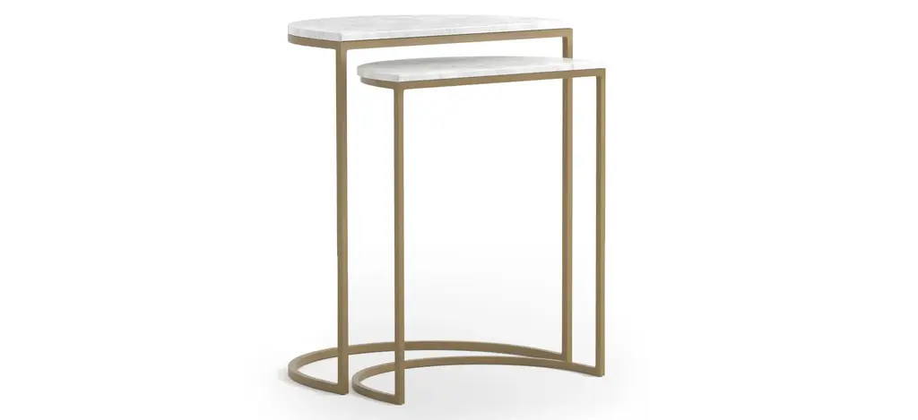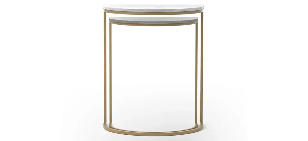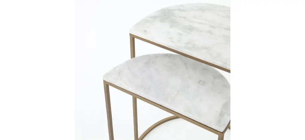 The Denni Nesting Tables exude style with a side of practicality. Slim brass-finished iron legs support semicircle tabletops of classic white marble. Nesting feature offers a handy extra surface when it's needed, tucking away with ease when it's not.