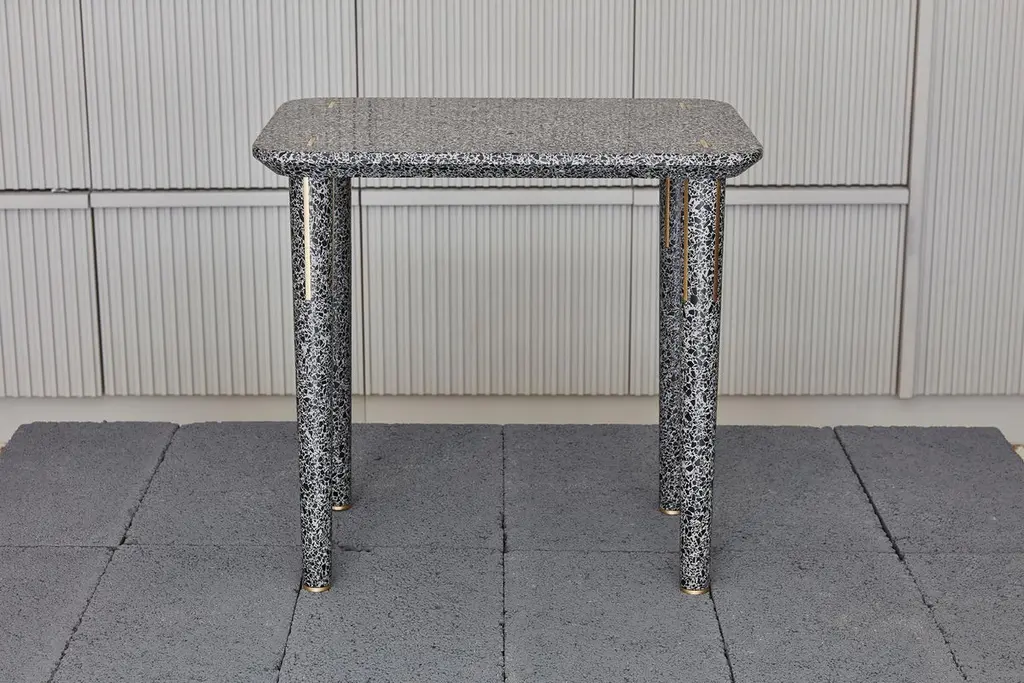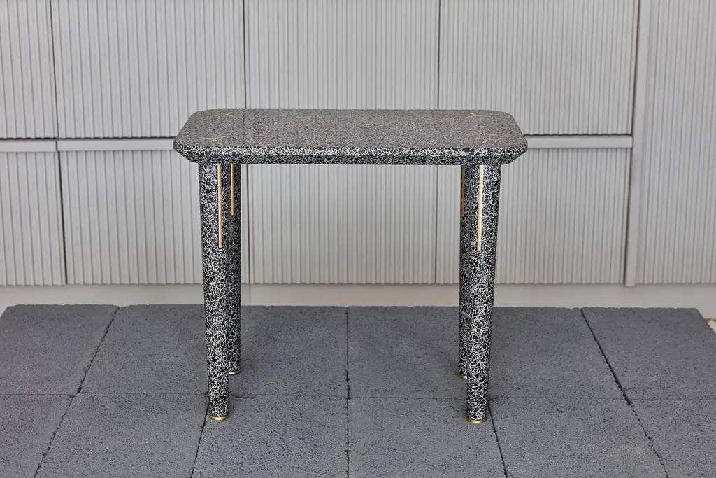 This unique design is one of two nesting tables that are part of the Flint collection. Crafted of terrazzo, a mix of cement and marble chips, its simple silhouette is adorned with metal inserts along the legs and on the top to mark the connections between the structural elements of the piece. The sophisticated juxtaposition of contrasting colors and finishes will complement a modern living space and the materials are suitable for both indoor and outdoor use. This table is designed to be food-safe and was entirely handcrafted.Dimensions (in): W 19.69 x D 11.81 x H 16.34 (TALL)Dimensions (in): W 19.69 x D 11.81 x H 18.31 (SHORT)