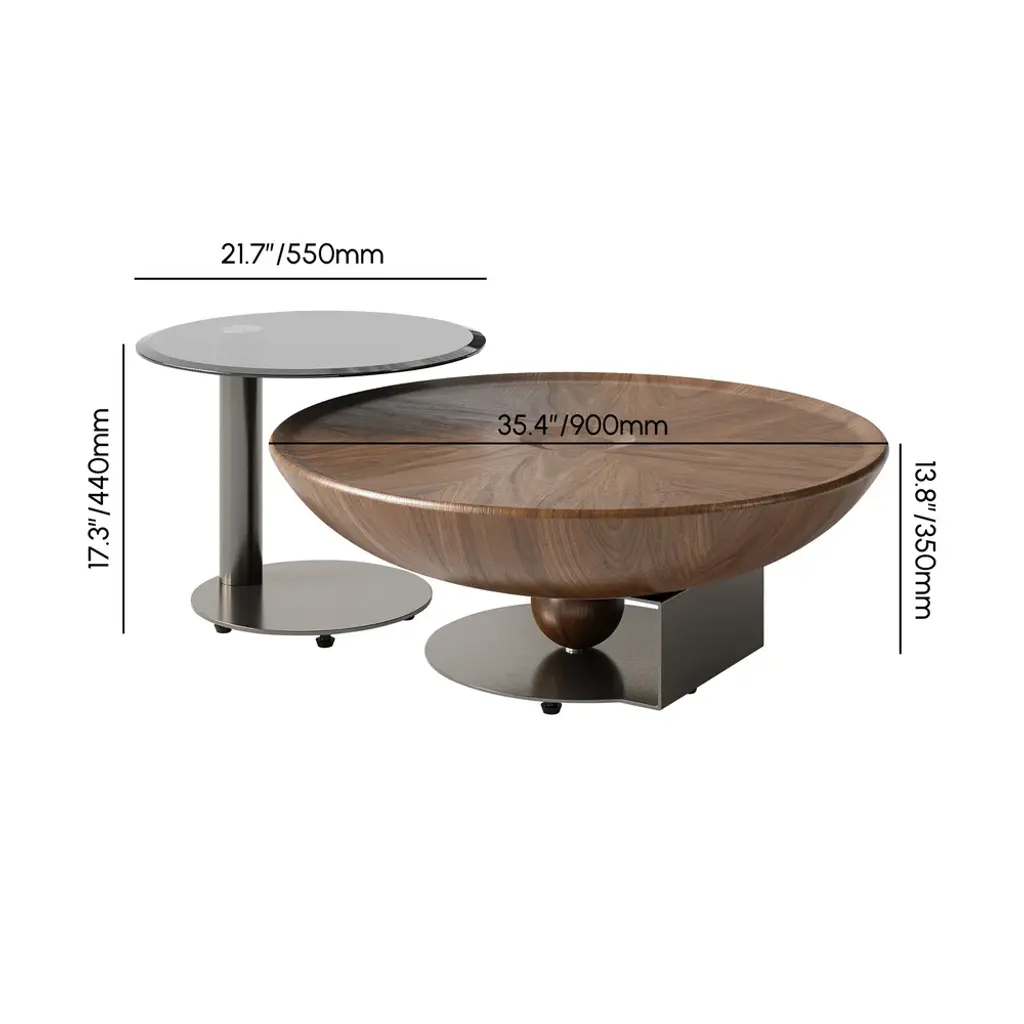 This elegant nesting set features two glass-top tables with walnut finish and textured steel legs. The smaller table nests under the larger for space savings, while raised edges prevent slips. Perfect for modern living spaces seeking style and function.