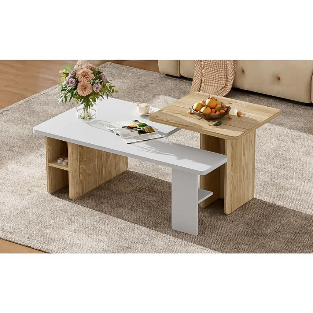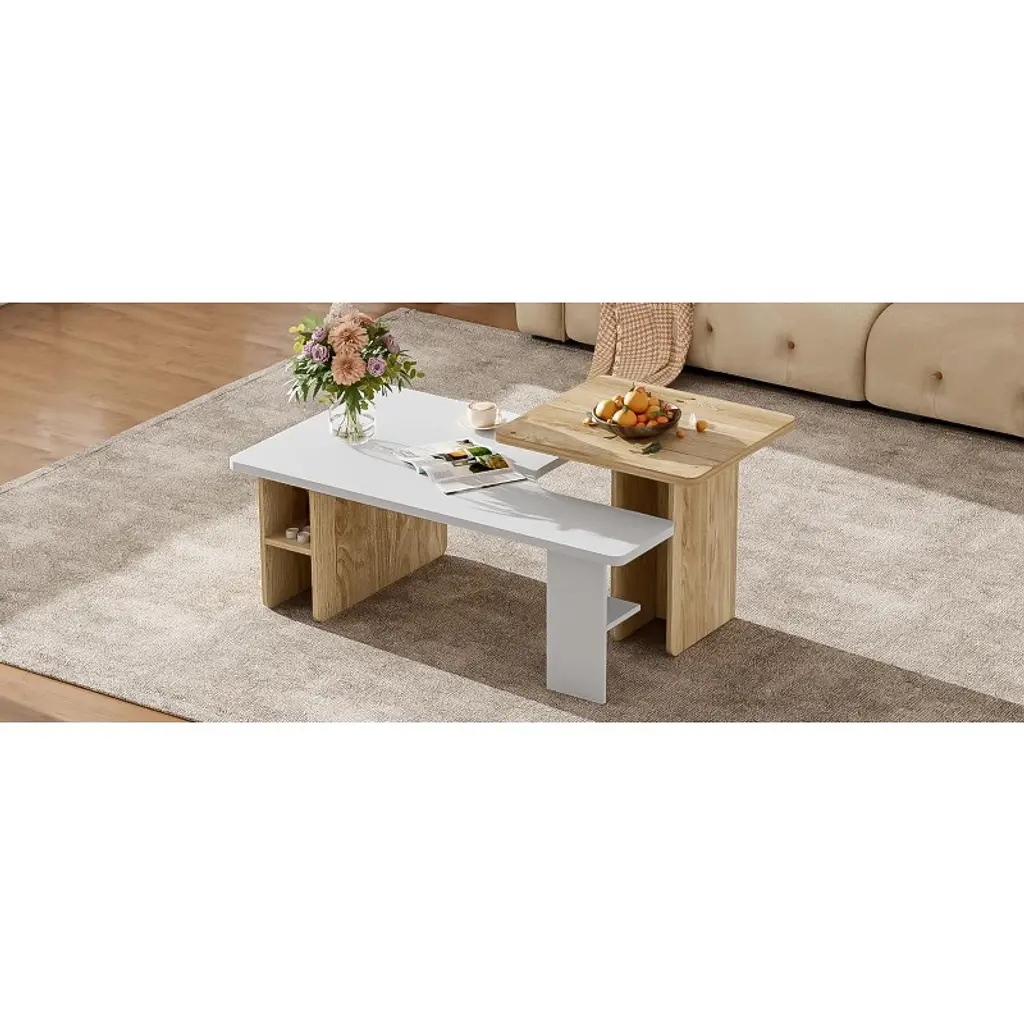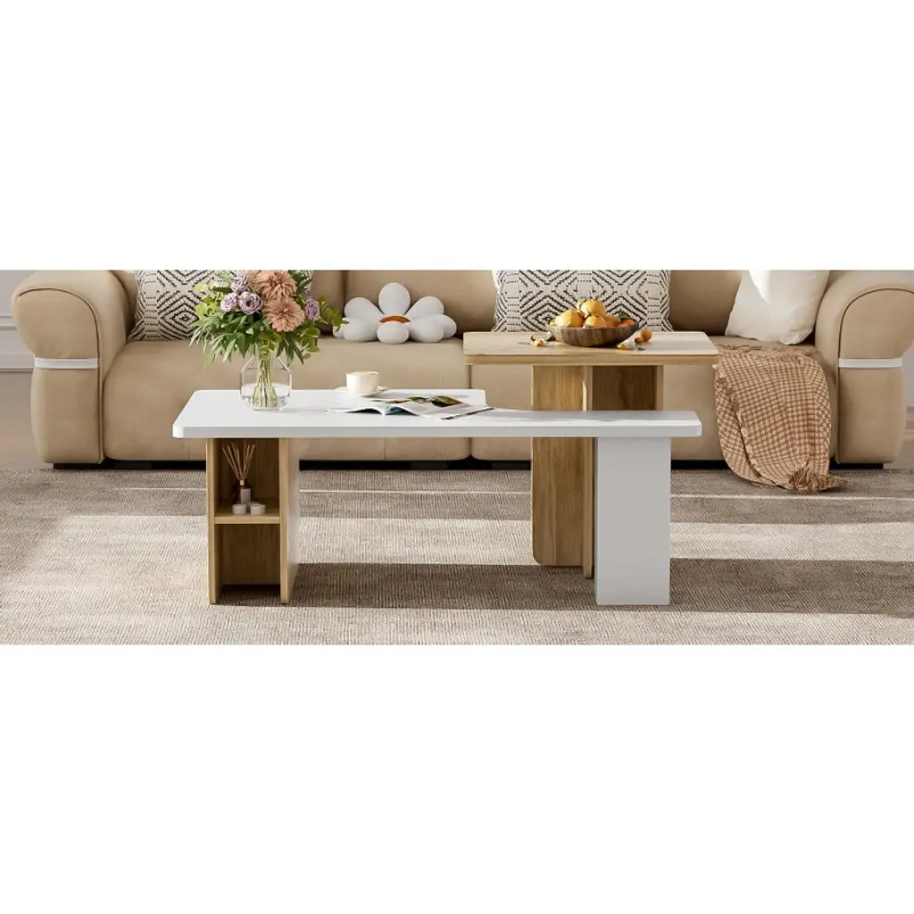 Gulches 2-piece nesting coffee table set brings flexibility and farmhouse charm to your living room. The two distinct tables can be nested to save space, arranged together for a layered look, or separated for different uses¡ªletting you customize your space to fit needs. It features elegant wood-grain details that add warmth and natural beauty, plus rounded corners and beveled edges for safety and a minimalist silhouette. Sturdy build ensures strong weight capacity for long use, and it assembles quickly with included instructions.