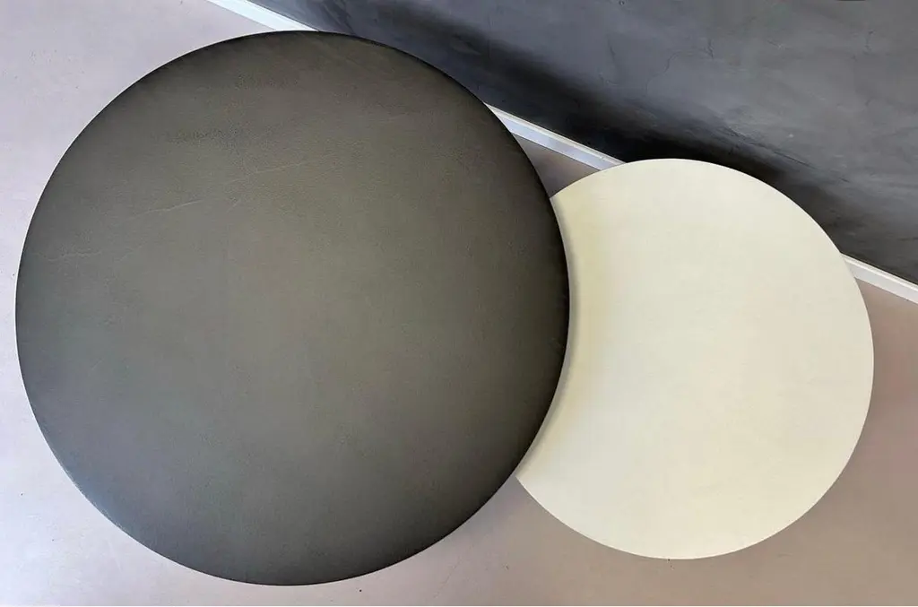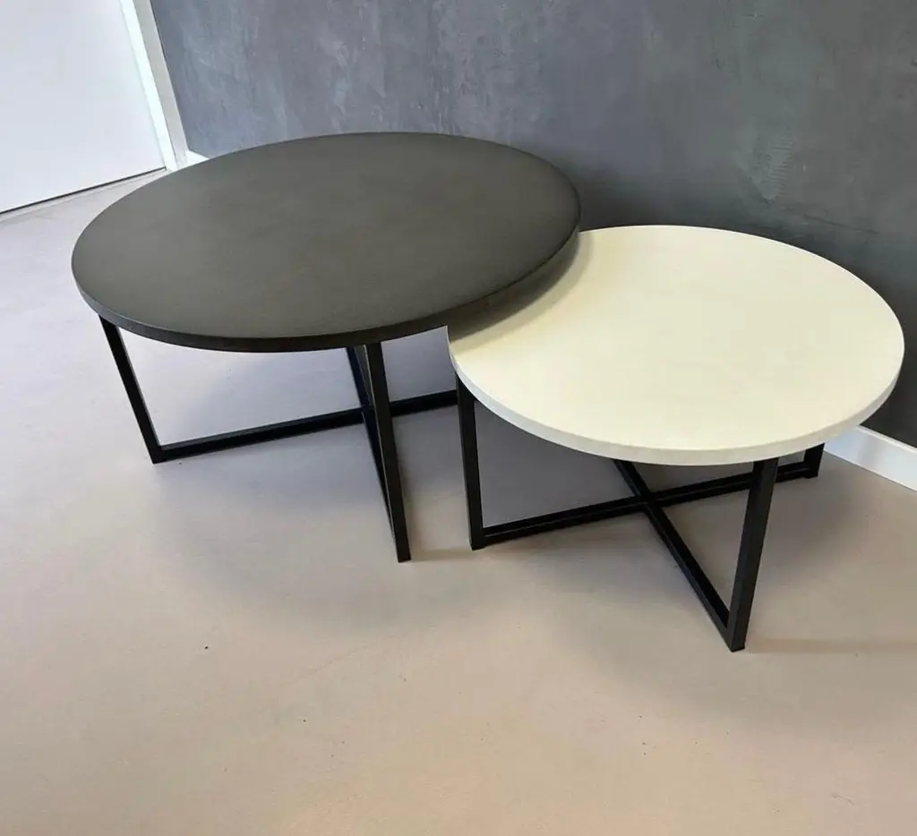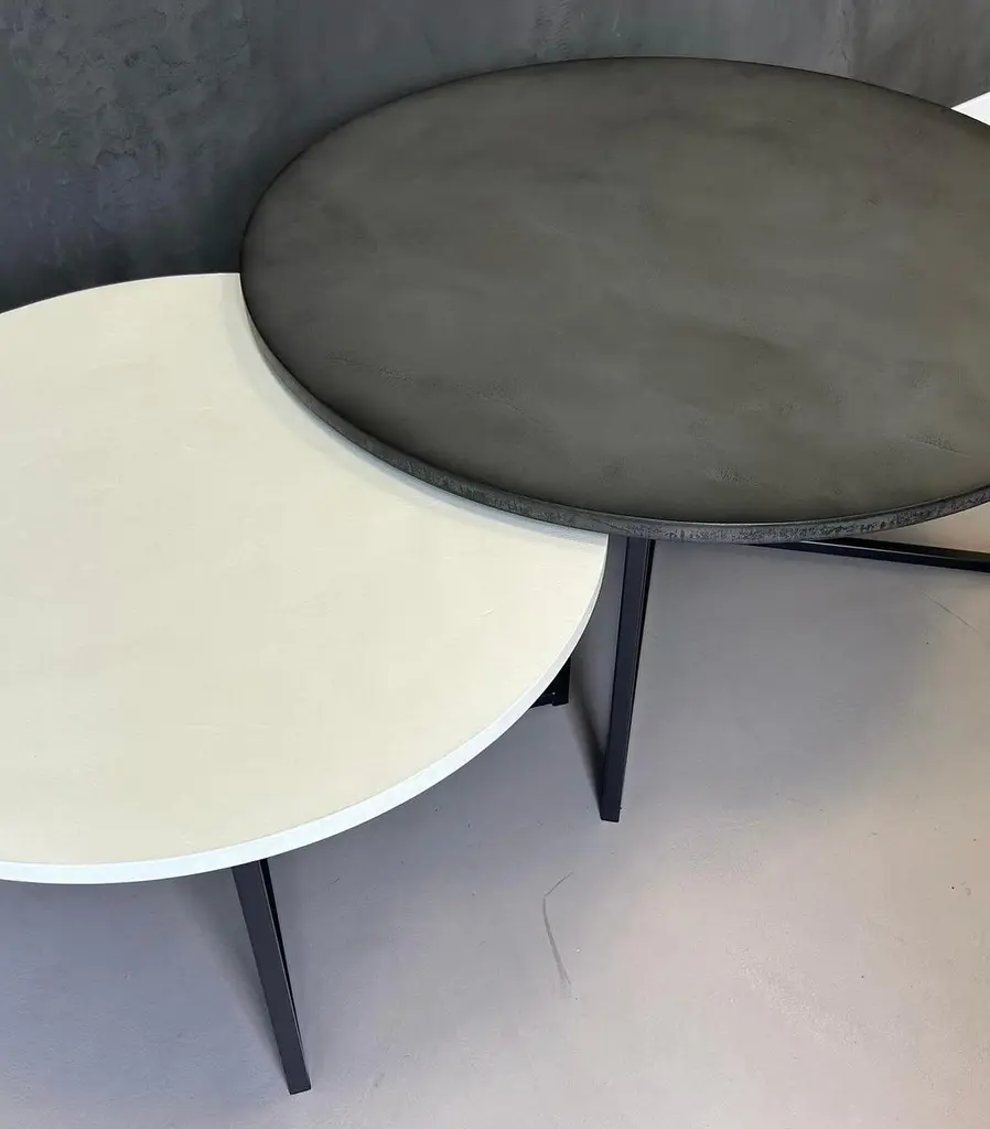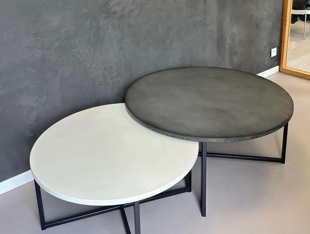 The beauty and high quality of handmade concrete and metal tables made in France are unparalleled in the world of furniture. The blending of these two materials results in pieces that are not only durable and functional, but also visually stunning. The concrete provides a strong foundation, while the metal adds a touch of sophistication and industrial charm. Each table is crafted with care by French artisans, ensuring that no two are exactly alike and adding to their unique appeal. The combination of beauty and functionality makes these tables not only a statement piece for your home, but a long-lasting investment. Choose a handmade concrete and metal table made in France for a piece that is both beautiful and built to last.Tables on the pictures are sold as a set of three tables of three different sizes : (D:100 cm, H:42 cm, 21kg)/(D: 80 cm, H: 38, 17kg)