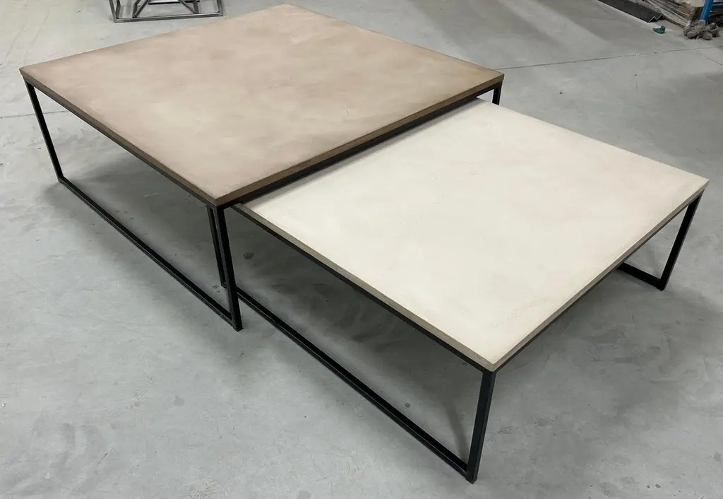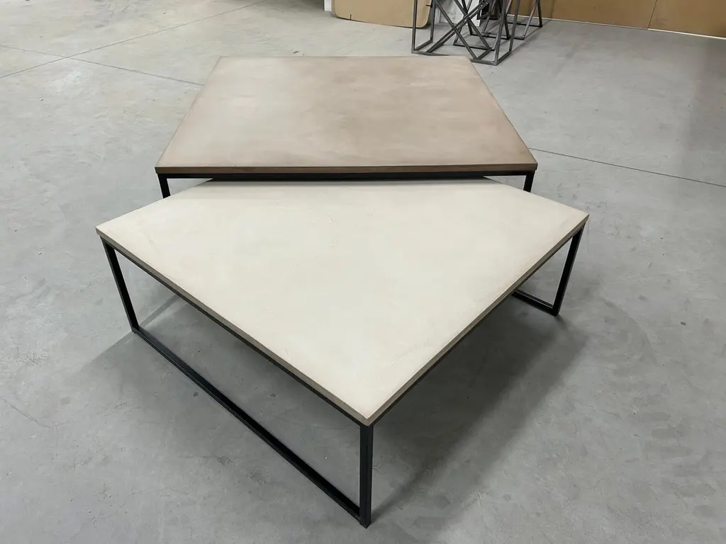 The beauty and high quality of handmade concrete and metal tables made in France are unparalleled in the world of furniture. The blending of these two materials results in pieces that are not only durable and functional, but also visually stunning. The concrete provides a strong foundation, while the metal adds a touch of sophistication and industrial charm. Each table is crafted with care by French artisans, ensuring that no two are exactly alike and adding to their unique appeal. The combination of beauty and functionality makes these tables not only a statement piece for your home, but a long-lasting investment. Choose a handmade concrete and metal table made in France for a piece that is both beautiful and built to last.Tables on the pictures are sold as a set of two tables of different sizes : (120 cm X 120cm - 35 kg) + ( 100 cm X 100 cm - 25 kg).Possibility of selling separately, please do not hesitate to ask for a quote.