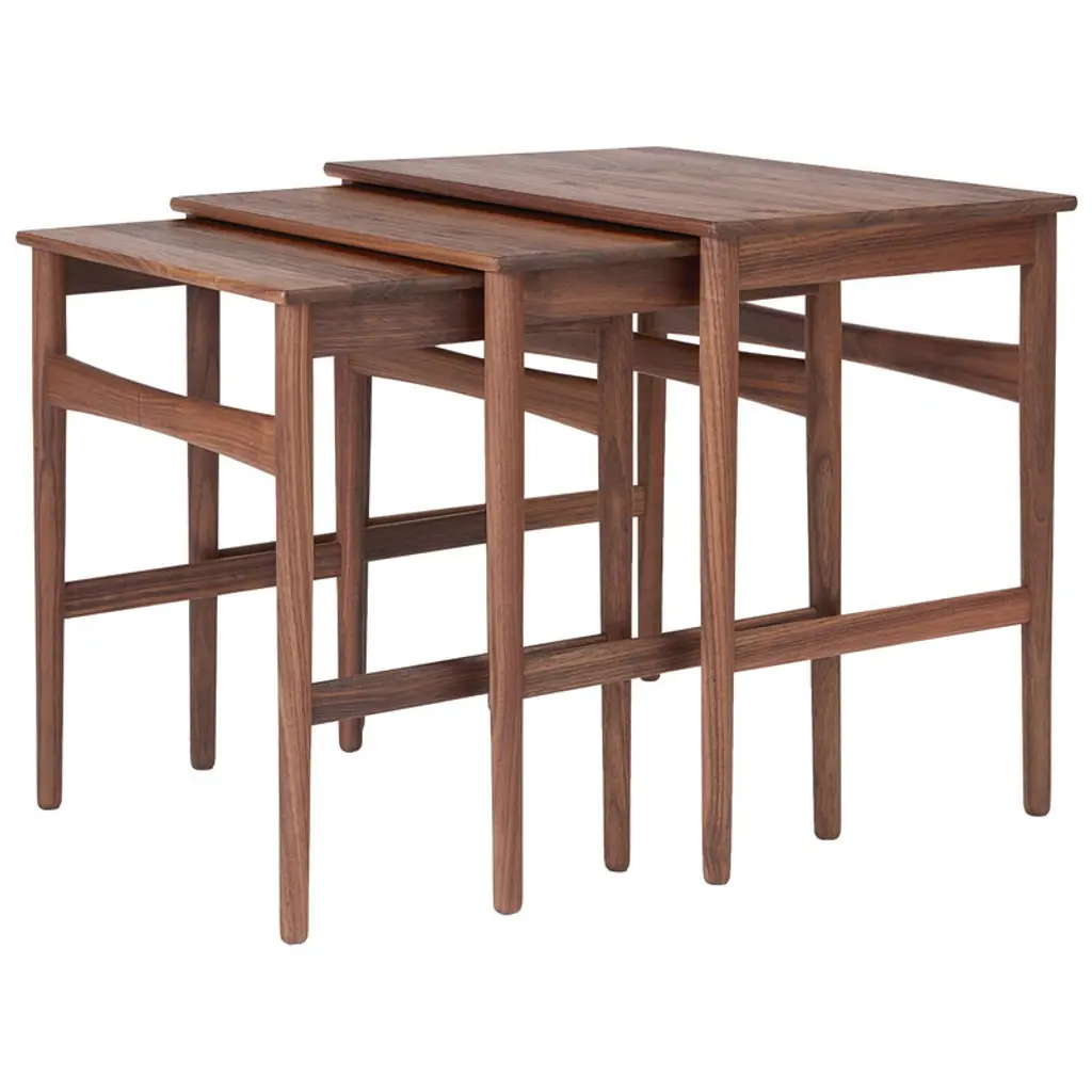 Hans J. Wegner 'CH004' Nesting Tables in Oak Oil for Carl Hansen & SonThe story of Danish Modern begins in 1908 when Carl Hansen opened his first workshop. His firm commitment to beauty, comfort, refinement, and craftsmanship is evident in iconic pieces designed by such legends as Hans J. Wegner, Arne Jacobsen, Kaare Klint, Poul Kjærholm, Vilhelm Lauritzen and others. Now in its third generation as a family run business, Carl Hansen & Son maintains its legacy through skillful work with the highest quality materials, sustainably producing Danish design classics by past icons and influential new designers.Hans J. Wegner’s iconic 'CH004' Nesting Tables were first launched in 1952. Their lightweight, space-optimized design and classic Wegner minimalism make them a versatile addition to any space. Consisting of three different-sized nesting tables, the set can be used individually or combined. All crafted with respect for the environment using FSC-certified wood.Price is for the set of 3 nesting tables, 1 in each size. Available to order in unlimited quantities in choice of oak soap, oak white oil, oak oil, walnut oil, or a combination of oiled walnut tabletop with oak legs. This listing is for the set of 'CH004' nesting tables in oak oil. Set consists of three tables with the following dimensions: 15.7" W x 11.6" D x 17.5" H -- 17.9" W x 12.4" D x 18.3" H -- 20.5" W x 13.4" D x 18.9" H.In stock lead time 6-7 weeks, out of stock lead times can add an additional 8 weeks or more. Please note that lead times, cost and inventory availability are subject to change without notice and dependent on choice of wood, finish and material ordered. For time sensitive orders, please contact us for current lead times prior to purchasing.Wood is a natural material and may vary depending on the environment (light, humidity, heat). Due to the organic nature of the material, oak and walnut vary considerably in tone and pattern within the same log. Some assembly required.Made to order. All sales are final.