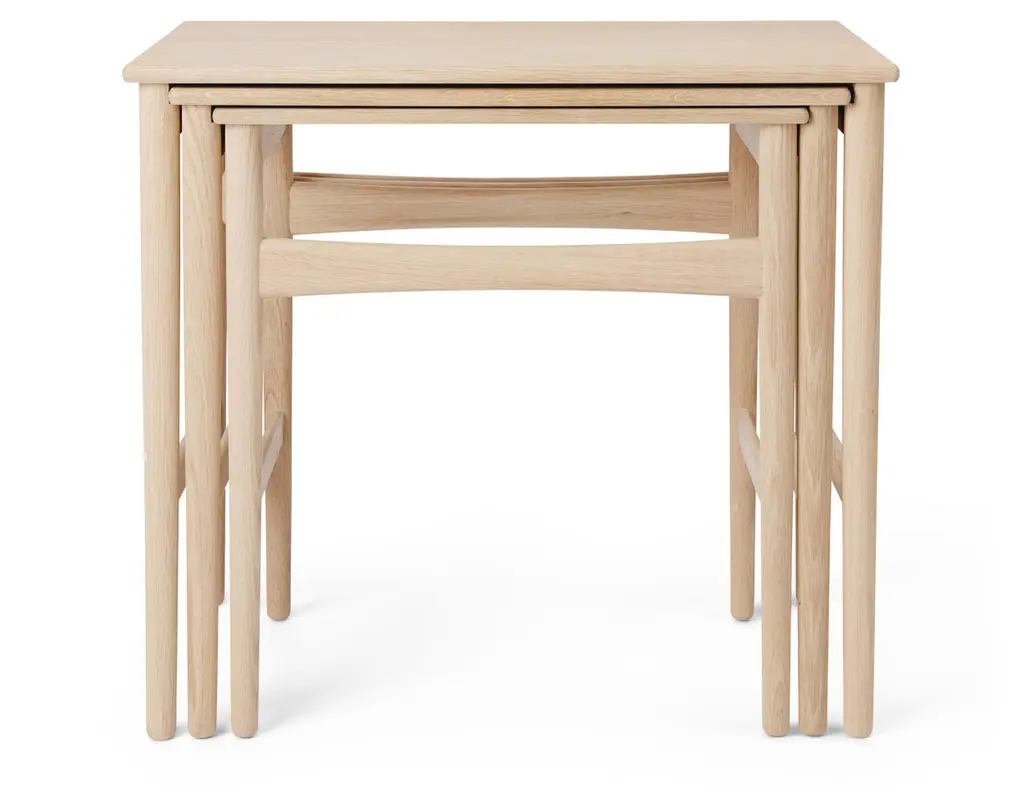 Hans J. Wegner 'CH004' Nesting Tables in Oak White Oil for Carl Hansen & SonThe story of Danish Modern begins in 1908 when Carl Hansen opened his first workshop. His firm commitment to beauty, comfort, refinement, and craftsmanship is evident in iconic pieces designed by such legends as Hans J. Wegner, Arne Jacobsen, Kaare Klint, Poul Kjærholm, Vilhelm Lauritzen and others. Now in its third generation as a family run business, Carl Hansen & Son maintains its legacy through skillful work with the highest quality materials, sustainably producing Danish design classics by past icons and influential new designers.Hans J. Wegner’s iconic 'CH004' Nesting Tables were first launched in 1952. Their lightweight, space-optimized design and classic Wegner minimalism make them a versatile addition to any space. Consisting of three different-sized nesting tables, the set can be used individually or combined. All crafted with respect for the environment using FSC-certified wood.Price is for the set of 3 nesting tables, 1 in each size. Available to order in unlimited quantities in choice of oak soap, oak white oil, oak oil, walnut oil, or a combination of oiled walnut tabletop with oak legs. This listing is for the set of 'CH004' nesting tables in oak white oil. Set consists of three tables with the following dimensions: 15.7" W x 11.6" D x 17.5" H -- 17.9" W x 12.4" D x 18.3" H -- 20.5" W x 13.4" D x 18.9" H.In stock lead time 7-8 weeks, out of stock lead times can add an additional 8 weeks or more. Please note that lead times, cost and inventory availability are subject to change without notice and dependent on choice of wood, finish and material ordered. For time sensitive orders, please contact us for current lead times prior to purchasing.Wood is a natural material and may vary depending on the environment (light, humidity, heat). Due to the organic nature of the material, oak and walnut vary considerably in tone and pattern within the same log. Some assembly required.Made to order. All sales are final.