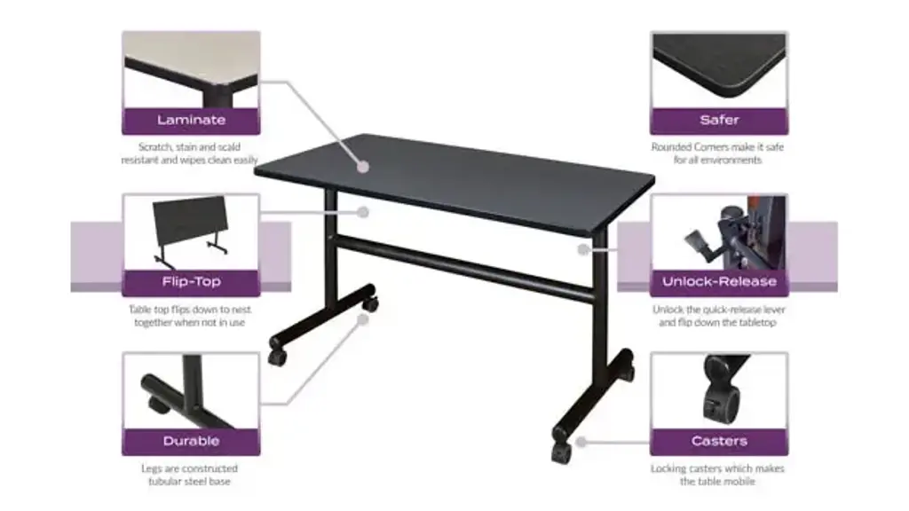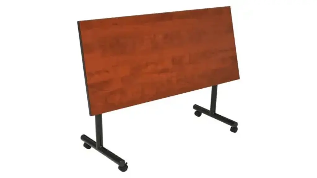 Set up a meeting room in a flash with Kobe Flip Top Tables. Unlock the quick-release lever and flip down the entire tabletop to nest together when not in use. Perfect for rooms with variable class size, the Flip Top tables save set up time and storage space. This 48-inch long table is constructed of a thermal fused melamine laminate tabletop that is 1-inch thick and finished with a black T-Mold edge band. Cherry tabletop is double sided and finished in Maple on the other side. Noble Oak laminate has Neo Walnut on the other side. Mahogany laminate has Grey laminate on the other side. Simply pick the side you like and install the base on the other. Self tapping wood screws and a placement template are included. Laminates are scratch, stain and scald resistant and wipe clean easily. Rounded corners make the table safer for everyone. The base is constructed of black tubular steel. Locking casters make these tables mobile and are ideal for computer labs, training rooms, classrooms and more. Overall Dimensions: 48" W x 24" D x 29" H. Minimum order of 2 tables. Ships ready for easy assembly.
