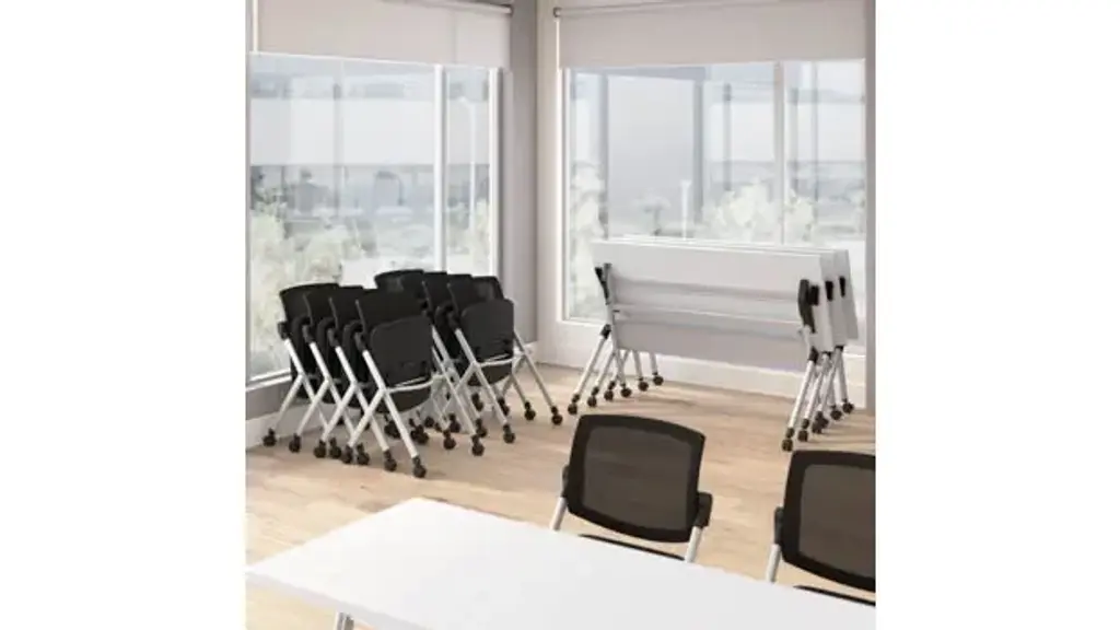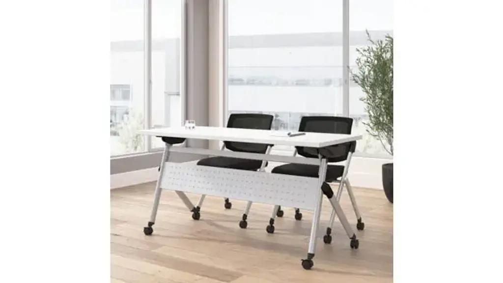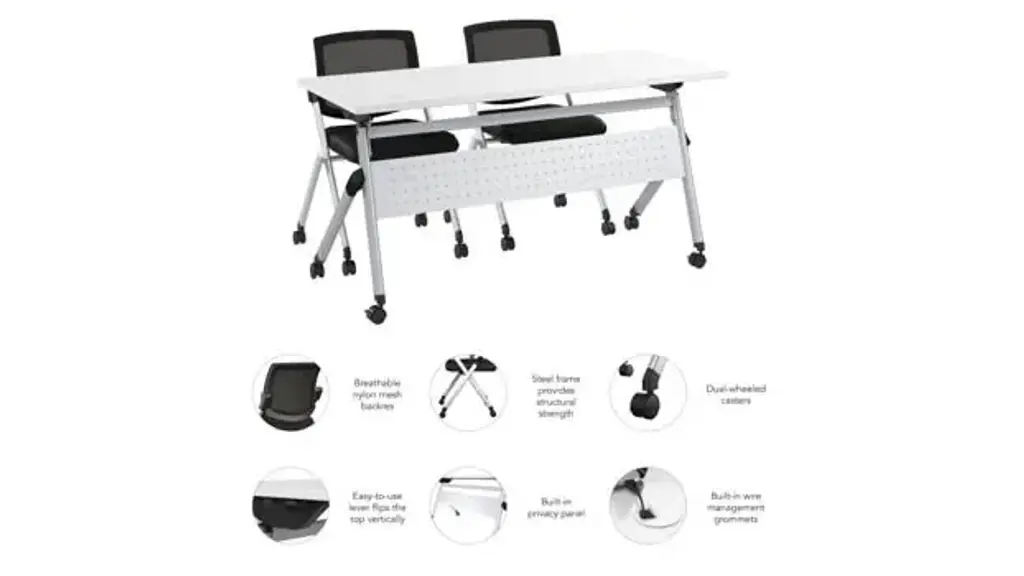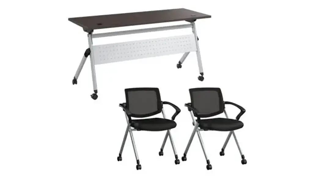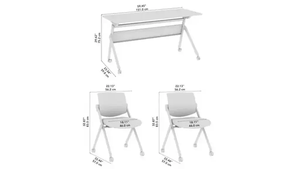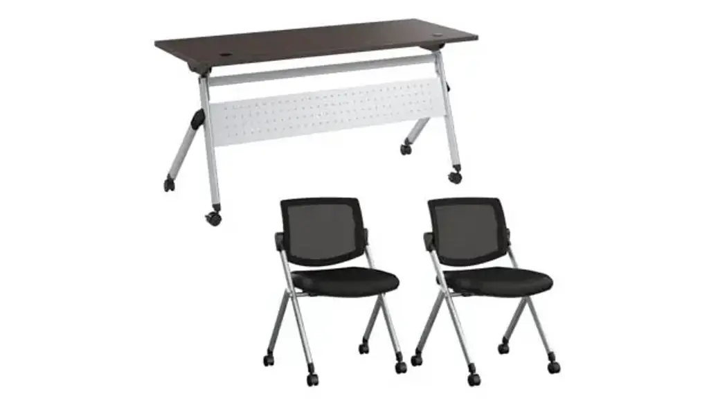 Transform your classroom or training facility with the Bush Business Furniture Envision 60" W Folding Training Table and 2 Folding Chairs, designed to provide ample workspace that folds and stores easily, making room for dynamic learning experiences. Durable 1-inch thick thermally fused laminate surface protects against scratches, stains, and other cosmetic damage and offers 2 wire management grommets on surface. Table's sturdy metal base gives the work surface a weight capacity of 75 pounds to support a laptop, reference materials and more. Dual-wheeled casters roll on carpeted or hard surfaces, allowing the table to lock in place for secure positioning and the chairs to be set up and rearranged at a moment's notice. Chairs' steel frame provides structural strength with a weight capacity of 275 pounds, while the cushioned seat measures 18" W x 18" D. Breathable nylon mesh backrest is great for staying cool in warmer environments. Easy-to-use lever flips the top vertically, allowing multiple folding tables to nest together, while the folding chairs are designed to be stacked in rows for convenient storage when not in use. Bush Business Furniture's commitment to safety includes rigorous testing that meets or exceeds ANSI/BIFMA x5.5 commercial test standards. Overall Dimensions: 59.45" W x 23.54" D x 32.87" H. Ships ready for easy assembly.