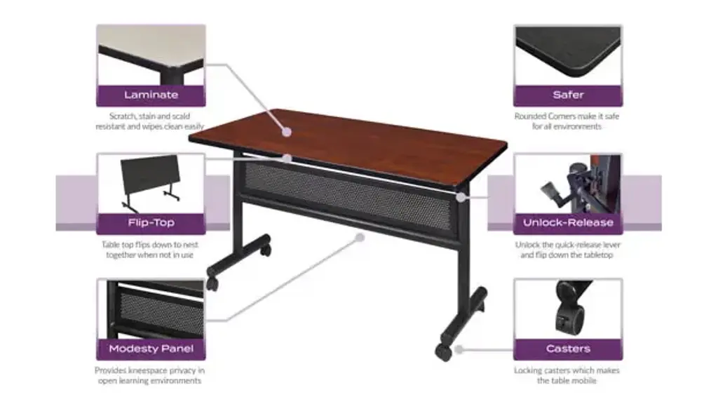 Set up a meeting room in a flash with Kobe Flip Top Tables. Unlock the quick-release lever and flip down the entire tabletop to nest together when not in use. Perfect for rooms with variable class size, the Flip Top tables save set up time and storage space. This 60-inch long table is constructed of a thermal fused melamine laminate tabletop that is 1-inch thick and finished with a black T-Mold edge band. Cherry tabletop is double sided and finished in Maple on the other side. Mahogany laminate has Grey on the other side. Noble Oak laminate has Neo Walnut laminate on the other side. Simply pick the side you like and install the base on the other. Self tapping wood screws and a placement template are included. Laminates are scratch, stain and scald resistant and wipe clean easily. Rounded corners make the table safer for everyone. The base is constructed of black tubular steel. A stylish perforated black modesty panel provides kneespace privacy in open learning environments. Locking casters make these tables mobile and are ideal for computer labs, training rooms, classrooms and more. Overall Dimensions: 60" W x 24" D x 29" H. Minimum order of 2 tables. Ships ready for easy assembly.