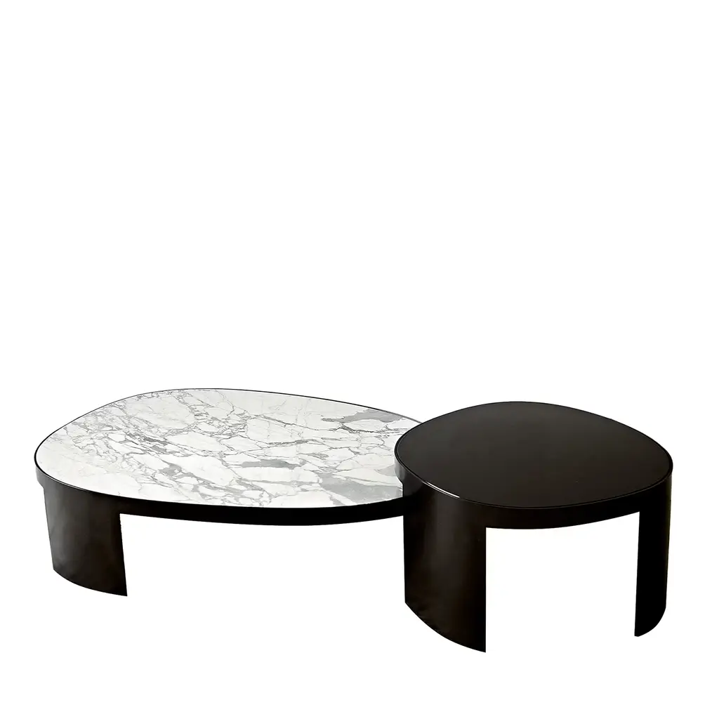 Combining functionality and elegant style, the two Jean Ordinary nesting tables will add a touch of class to your living area or lounge room. Practical in design, they can be placed separately where needed or easily kept together when not in use. The tables are crafted in Canaletto walnut and black ash with legs in brass/iron in a gunmetal finish.