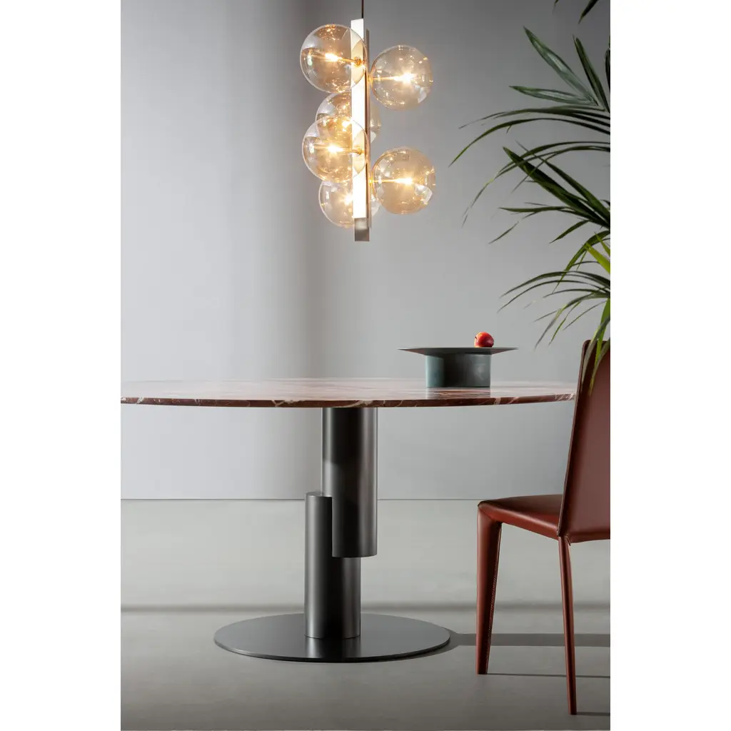 The base of the Innesti modern nesting table, designed by Paolo Grasselli for Bonaldo, appears detached from the upper part of the accessory, as though the top were suspended in the air. The two parts are united by a perfect, yet unexpected joint that puts this table in the spotlight with a great sculptural effect. This element becomes the standout feature of the living area, while dialoguing with the surrounding space thanks to the option of customizing the details with different types of marble, wood and ceramic for the top and different metals for the base.