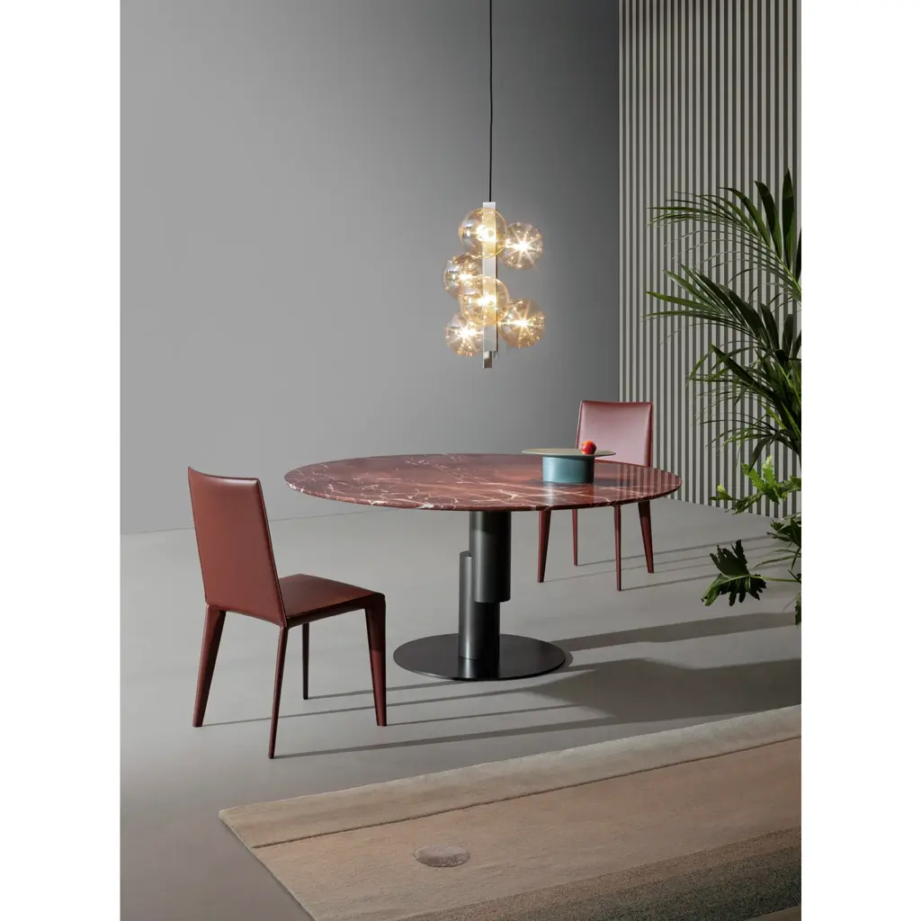 The base of the Innesti modern nesting table, designed by Paolo Grasselli for Bonaldo, appears detached from the upper part of the accessory, as though the top were suspended in the air. The two parts are united by a perfect, yet unexpected joint that puts this table in the spotlight with a great sculptural effect. This element becomes the standout feature of the living area, while dialoguing with the surrounding space thanks to the option of customizing the details with different types of marble, wood and ceramic for the top and different metals for the base.