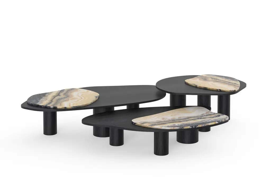 Mid-Century Modern Style Landscape Coffee Tables set of 3, Contemporary Collection, Handcrafted in Portugal - Europe by Greenapple.The Landscape nesting coffee table draws inspiration from the organic beauty of natural landscapes. Its flowing form evokes the gentle contours of rolling hills and shifting sands, capturing the movement of nature in a sculptural design. Created to bring depth and artistic expression to contemporary interiors, the Landscape nesting coffee table adds a sense of balance and tranquility to any space.The Landscape coffee set consists of three coffee tables, each featuring a top and wooden semicircular and legs veneered in natural oak with black stain and a matte varnish. The veneer is anti-fungal and vermin-free.A polished Nilo Onyx detail in amber and black tones adds contrast to the design.The Landscape coffee set can be customized in terms of dimensions, materials and finishes.Set of 3 Landscape Coffee Tables DimensionsSmall:W.99 x De.90 x H.46cmW.38.98 x De.35.43 x H.18.11 in.Medium:W.140 x De.81 x H.31cmW.55.12 x De.31.89 x H.12.2 in.Large:W.163 x De.85 x H.38cmW.64.17 x De.33.46 x H.14.96 in.Set of 3 Landscape Coffee Tables Material CodesWD107 American Oak, Stained Open-pore, Varnished, Black, MatteST073 Nilo Onyx, Polished, Amber-Black, GlossHandcrafted in Portugal - Europe by GreenappleUnique by design, Crafted by peopleGreenapple transforms contemporary spaces into exclusive narratives of design and craftsmanship. From custom-made furniture to bespoke interiors, each creation is a timeless work of art, shaped by master artisans who honor centuries-old techniques.Founded in 2005 by Sérgio Rebola and Rute Martins, Greenapple has earned global recognition among high-end clientele and leading design firms. While Rute designs each unique piece, Sérgio ensures uncompromising quality from design to production and from production to your home. We provide a seamless experience, offering short production lead times, worldwide delivery within 7 to 10 days, and white-glove service upon request.For U.S. clients, we can handle customs clearance, and offer white-glove service as well upon request.Nested Coffee Table, Stacking Coffee Table, Nesting Table Set, Set of Tables