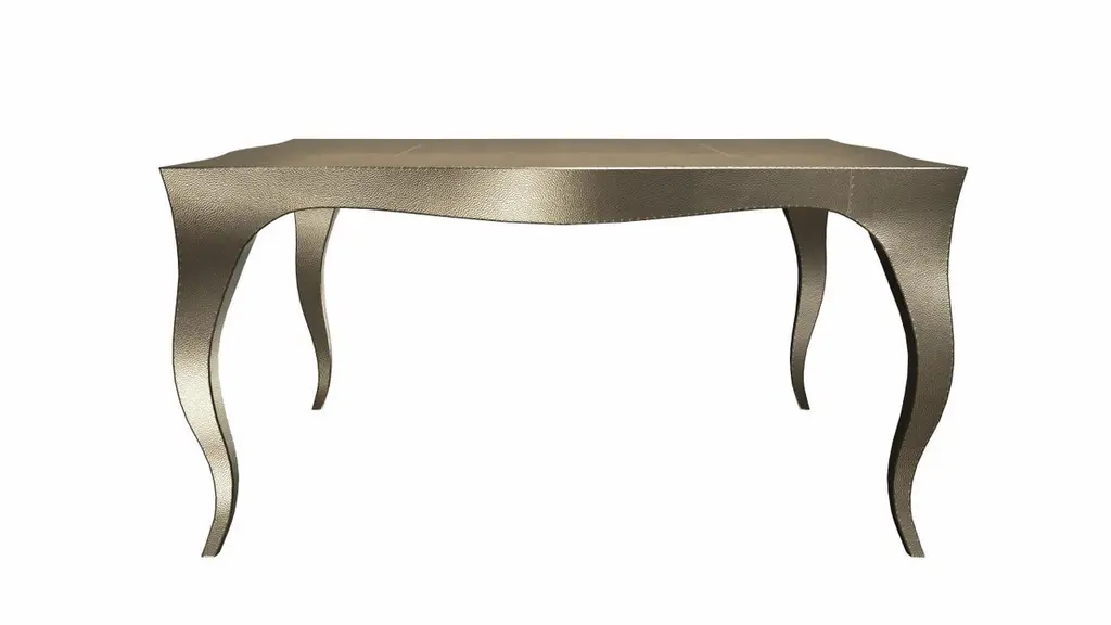 Nesting Tables from our Louise Collection. The renowned designer Paul Mathieu chose the name “Louise” when he created his more feminine version of Louis XV (1730-1760) furniture. The characteristic cabriole leg, curving outward at the knee and inward towards the foot in an "S" shape was born during this period. It is during the same era that English furniture makers produced the Queen Anne and Chippendale styles.Crafted with utmost care and attention to detail, these Louis Nesting Tables are made to order and are available in twelve metal clad finishes, ensuring that you can choose the perfect one to match your individual style and taste. The use of high-quality materials and expert craftsmanship ensure that each Art Deco Louis Nesting Tables is not only beautiful but also a true piece of art.The curved legs and side arms of this Art Deco Louis Nesting Tables are hand carved from solid pieces of teak. Pattern makers trace and cut complex forms that will cover the chair in a skin of copper, white bronze, brass or antiqued white bronze The metal finishes will tarnish over time. Regular non-abrasive household metal polishes can be used to restore the original luster.Overall, if you're looking for a piece of furniture that combines luxury, comfort, and style, then the Art Deco Nesting Tables is an excellent choice. With its distinctive curved profile and multiple finish options, this Chair set is sure to elevate the look of any room it is placed in, and be a beloved addition to your home for years to come.The images shown in this listing are shot in different lighting conditions and/or are 3D illustrations. We encourage our customers to please request a sample or a full sample set of 12 finishes so that they can experience the finish first hand. Louise Art Deco Card Tables and Tea Tables Mid. Hammered Brass 18.5x18.5x10 inch by Paul Mathieu for Stephanie OdegardSize- 18.5"x 18.5"x 10"HMaterials - Brass, Metal sheet, Teak, Wood, MetalTechniques: Hand-Crafted, Hand-Carved, Metal Work, Wood Work, Metal Wrapping, PolishedPlease note that moisture in air, sudden change in temperature and natural movement of wood over time causes the metal to wrinkle or bubble up. We use well seasoned, reclaimed teak and high quality marine grade MDF (wherever technically possible) to avoid and delay the mentioned changes. However a perfect stability of metal cannot be guaranteed. Please note that our smooth finish metal clad pieces will have some unavoidable tool marks. This is proof that everything is done by hand. The smooth finish will not come out like a machine made perfect surface and the master artisan will do their best to make it look as good/clean/stable/perfect as he possibly can.The antique white bronze finish is hand done by using an acidic chemical over the white bronze finish to recreate a natural patination. Like with the natural patination of silver, copper, or brass, the final result and color uniformity of the patina cannot be guaranteed. The goal of this finish is to achieve rainbow-like shades with dull, shiny, cloudy, and streaky patches to give an illusion of antiquing. Please note:None of our metal clad pieces are treated with a protective “finish” thus enabling the items to age naturally over time. We will of course polish them well before we pack them. a) Copper oxidizes faster than the other metals. In six to twelve months it will most likely lose its shine and will gradually turn to different shades of brown and/or green/blue. This aging process and its effect is referred to as verdigris. After a year the piece should not change much more. Copper does not rust, but does require periodic cleaning in order to retain its original shine if that the preferred option. ('BRASSO' or any known copper polish can be used to polish copper).b) Brass retains its shine for far longer than others, but will tarnish if not cleaned on occasion. ('BRASSO' is made to polish brass).c) White bronze, has the least tendency to show age or tarnish. If kept in a controlled climate, this metal will hold its shine for years. It can be cleaned with a cleanser and polished with a cloth. d) The antiqued white bronze finish will react with the natural elements the fastest in the beginning but it too will stop reacting and will settle down in a stable state like copper after 6-12 months. Since it is already antiqued and looked like it is tarnished, as described in an earlier message, this fast reaction will not change the over all look. In that way this surface is most forgiving. The images shown in this listing are shot in different lighting conditions and/or are 3D illustrations. We encourage our customers to please request a sample or a full sample set of 12 finishes so that they can experience the finish first hand.