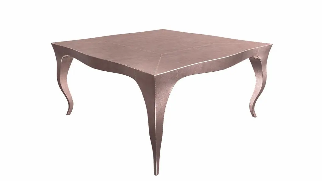 Nesting Tables from our Louise Collection. The renowned designer Paul Mathieu chose the name “Louise” when he created his more feminine version of Louis XV (1730-1760) furniture. The characteristic cabriole leg, curving outward at the knee and inward towards the foot in an "S" shape was born during this period. It is during the same era that English furniture makers produced the Queen Anne and Chippendale styles.Crafted with utmost care and attention to detail, these Louis Nesting Tables are made to order and are available in twelve metal clad finishes, ensuring that you can choose the perfect one to match your individual style and taste. The use of high-quality materials and expert craftsmanship ensure that each Art Deco Louis Nesting Tables is not only beautiful but also a true piece of art.The curved legs and side arms of this Art Deco Louis Nesting Tables are hand carved from solid pieces of teak. Pattern makers trace and cut complex forms that will cover the chair in a skin of copper, white bronze, brass or antiqued white bronze The metal finishes will tarnish over time. Regular non-abrasive household metal polishes can be used to restore the original luster.Overall, if you're looking for a piece of furniture that combines luxury, comfort, and style, then the Art Deco Nesting Tables is an excellent choice. With its distinctive curved profile and multiple finish options, this Chair set is sure to elevate the look of any room it is placed in, and be a beloved addition to your home for years to come.The images shown in this listing are shot in different lighting conditions and/or are 3D illustrations. We encourage our customers to please request a sample or a full sample set of 12 finishes so that they can experience the finish first hand. Louise Art Deco Card Tables and Tea Tables Smooth Antique Bronze 18.5x18.5x10 inch by Paul Mathieu by Paul Mathieu for Stephanie OdegardSize- 18.5"x 18.5"x 10"HMaterials - Copper, Metal sheet, Teak, Wood, MetalTechniques: Hand-Crafted, Hand-Carved, Metal Work, Wood Work, Metal Wrapping, PolishedPlease note that moisture in air, sudden change in temperature and natural movement of wood over time causes the metal to wrinkle or bubble up. We use well seasoned, reclaimed teak and high quality marine grade MDF (wherever technically possible) to avoid and delay the mentioned changes. However a perfect stability of metal cannot be guaranteed. Please note that our smooth finish metal clad pieces will have some unavoidable tool marks. This is proof that everything is done by hand. The smooth finish will not come out like a machine made perfect surface and the master artisan will do their best to make it look as good/clean/stable/perfect as he possibly can.The antique white bronze finish is hand done by using an acidic chemical over the white bronze finish to recreate a natural patination. Like with the natural patination of silver, copper, or brass, the final result and color uniformity of the patina cannot be guaranteed. The goal of this finish is to achieve rainbow-like shades with dull, shiny, cloudy, and streaky patches to give an illusion of antiquing. Please note:None of our metal clad pieces are treated with a protective “finish” thus enabling the items to age naturally over time. We will of course polish them well before we pack them. a) Copper oxidizes faster than the other metals. In six to twelve months it will most likely lose its shine and will gradually turn to different shades of brown and/or green/blue. This aging process and its effect is referred to as verdigris. After a year the piece should not change much more. Copper does not rust, but does require periodic cleaning in order to retain its original shine if that the preferred option. ('BRASSO' or any known copper polish can be used to polish copper).b) Brass retains its shine for far longer than others, but will tarnish if not cleaned on occasion. ('BRASSO' is made to polish brass).c) White bronze, has the least tendency to show age or tarnish. If kept in a controlled climate, this metal will hold its shine for years. It can be cleaned with a cleanser and polished with a cloth. d) The antiqued white bronze finish will react with the natural elements the fastest in the beginning but it too will stop reacting and will settle down in a stable state like copper after 6-12 months. Since it is already antiqued and looked like it is tarnished, as described in an earlier message, this fast reaction will not change the over all look. In that way this surface is most forgiving. The images shown in this listing are shot in different lighting conditions and/or are 3D illustrations. We encourage our customers to please request a sample or a full sample set of 12 finishes so that they can experience the finish first hand.