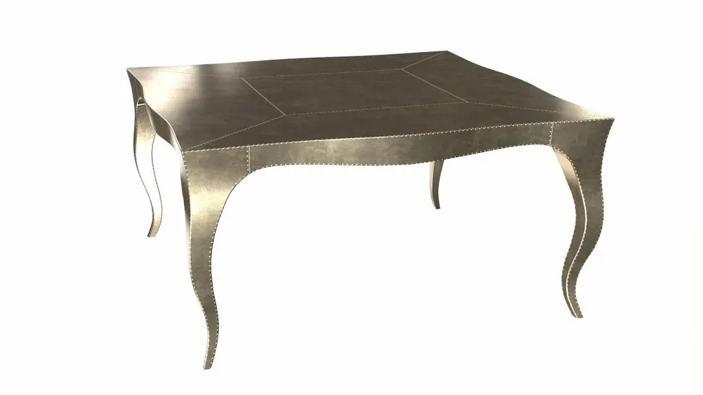 Nesting Tables from our Louise Collection. The renowned designer Paul Mathieu chose the name “Louise” when he created his more feminine version of Louis XV (1730-1760) furniture. The characteristic cabriole leg, curving outward at the knee and inward towards the foot in an "S" shape was born during this period. It is during the same era that English furniture makers produced the Queen Anne and Chippendale styles.Crafted with utmost care and attention to detail, these Louis Nesting Tables are made to order and are available in twelve metal clad finishes, ensuring that you can choose the perfect one to match your individual style and taste. The use of high-quality materials and expert craftsmanship ensure that each Art Deco Louis Nesting Tables is not only beautiful but also a true piece of art.The curved legs and side arms of this Art Deco Louis Nesting Tables are hand carved from solid pieces of teak. Pattern makers trace and cut complex forms that will cover the chair in a skin of copper, white bronze, brass or antiqued white bronze The metal finishes will tarnish over time. Regular non-abrasive household metal polishes can be used to restore the original luster.Overall, if you're looking for a piece of furniture that combines luxury, comfort, and style, then the Art Deco Nesting Tables is an excellent choice. With its distinctive curved profile and multiple finish options, this Chair set is sure to elevate the look of any room it is placed in, and be a beloved addition to your home for years to come.The images shown in this listing are shot in different lighting conditions and/or are 3D illustrations. We encourage our customers to please request a sample or a full sample set of 12 finishes so that they can experience the finish first hand. Louise Art Deco Card Tables and Tea Tables Smooth Brass 18.5x18.5x10 inch by Paul Mathieu for Stephanie OdegardSize- 18.5"x 18.5"x 10"HMaterials - Brass, Metal sheet, Teak, Wood, MetalTechniques: Hand-Crafted, Hand-Carved, Metal Work, Wood Work, Metal Wrapping, PolishedPlease note that moisture in air, sudden change in temperature and natural movement of wood over time causes the metal to wrinkle or bubble up. We use well seasoned, reclaimed teak and high quality marine grade MDF (wherever technically possible) to avoid and delay the mentioned changes. However a perfect stability of metal cannot be guaranteed. Please note that our smooth finish metal clad pieces will have some unavoidable tool marks. This is proof that everything is done by hand. The smooth finish will not come out like a machine made perfect surface and the master artisan will do their best to make it look as good/clean/stable/perfect as he possibly can.The antique white bronze finish is hand done by using an acidic chemical over the white bronze finish to recreate a natural patination. Like with the natural patination of silver, copper, or brass, the final result and color uniformity of the patina cannot be guaranteed. The goal of this finish is to achieve rainbow-like shades with dull, shiny, cloudy, and streaky patches to give an illusion of antiquing. Please note:None of our metal clad pieces are treated with a protective “finish” thus enabling the items to age naturally over time. We will of course polish them well before we pack them. a) Copper oxidizes faster than the other metals. In six to twelve months it will most likely lose its shine and will gradually turn to different shades of brown and/or green/blue. This aging process and its effect is referred to as verdigris. After a year the piece should not change much more. Copper does not rust, but does require periodic cleaning in order to retain its original shine if that the preferred option. ('BRASSO' or any known copper polish can be used to polish copper).b) Brass retains its shine for far longer than others, but will tarnish if not cleaned on occasion. ('BRASSO' is made to polish brass).c) White bronze, has the least tendency to show age or tarnish. If kept in a controlled climate, this metal will hold its shine for years. It can be cleaned with a cleanser and polished with a cloth. d) The antiqued white bronze finish will react with the natural elements the fastest in the beginning but it too will stop reacting and will settle down in a stable state like copper after 6-12 months. Since it is already antiqued and looked like it is tarnished, as described in an earlier message, this fast reaction will not change the over all look. In that way this surface is most forgiving. The images shown in this listing are shot in different lighting conditions and/or are 3D illustrations. We encourage our customers to please request a sample or a full sample set of 12 finishes so that they can experience the finish first hand.