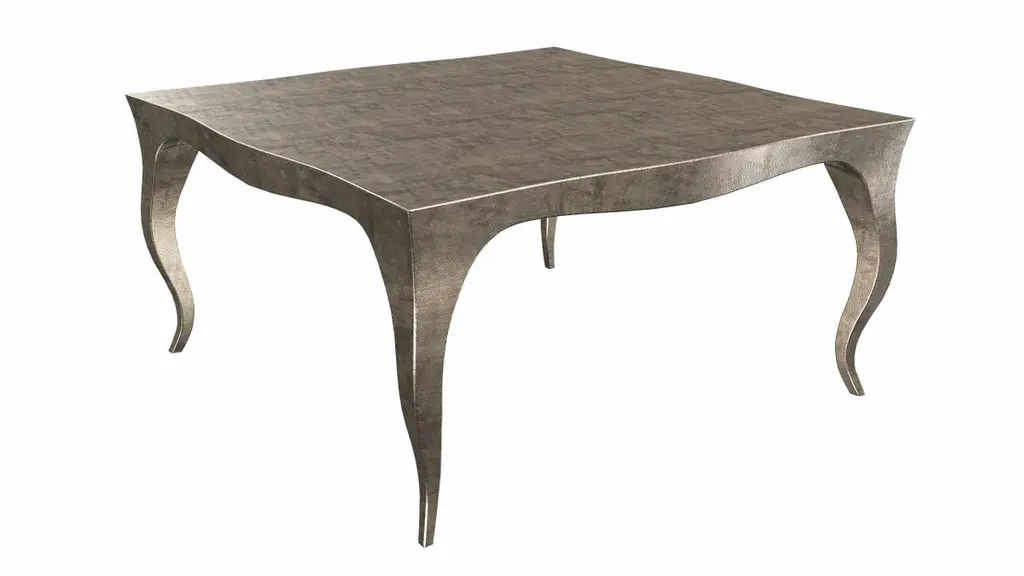 Nesting Tables from our Louise Collection. The renowned designer Paul Mathieu chose the name “Louise” when he created his more feminine version of Louis XV (1730-1760) furniture. The characteristic cabriole leg, curving outward at the knee and inward towards the foot in an "S" shape was born during this period. It is during the same era that English furniture makers produced the Queen Anne and Chippendale styles.Crafted with utmost care and attention to detail, these Louis Nesting Tables are made to order and are available in twelve metal clad finishes, ensuring that you can choose the perfect one to match your individual style and taste. The use of high-quality materials and expert craftsmanship ensure that each Art Deco Louis Nesting Tables is not only beautiful but also a true piece of art.The curved legs and side arms of this Art Deco Louis Nesting Tables are hand carved from solid pieces of teak. Pattern makers trace and cut complex forms that will cover the chair in a skin of copper, white bronze, brass or antiqued white bronze The metal finishes will tarnish over time. Regular non-abrasive household metal polishes can be used to restore the original luster.Overall, if you're looking for a piece of furniture that combines luxury, comfort, and style, then the Art Deco Nesting Tables is an excellent choice. With its distinctive curved profile and multiple finish options, this Chair set is sure to elevate the look of any room it is placed in, and be a beloved addition to your home for years to come.The images shown in this listing are shot in different lighting conditions and/or are 3D illustrations. We encourage our customers to please request a sample or a full sample set of 12 finishes so that they can experience the finish first hand. Louise Art Deco Card Tables and Tea Tables Mid. Hammered Antique Bronze 18.5x18.5x10 inch by Paul Mathieu for Stephanie OdegardSize- 18.5"x 18.5"x 10"HMaterials - Antique Bronze, Metal sheet, Teak, Wood, MetalTechniques: Hand-Crafted, Hand-Carved, Metal Work, Wood Work, Metal Wrapping, PolishedPlease note that moisture in air, sudden change in temperature and natural movement of wood over time causes the metal to wrinkle or bubble up. We use well seasoned, reclaimed teak and high quality marine grade MDF (wherever technically possible) to avoid and delay the mentioned changes. However a perfect stability of metal cannot be guaranteed. Please note that our smooth finish metal clad pieces will have some unavoidable tool marks. This is proof that everything is done by hand. The smooth finish will not come out like a machine made perfect surface and the master artisan will do their best to make it look as good/clean/stable/perfect as he possibly can.The antique white bronze finish is hand done by using an acidic chemical over the white bronze finish to recreate a natural patination. Like with the natural patination of silver, copper, or brass, the final result and color uniformity of the patina cannot be guaranteed. The goal of this finish is to achieve rainbow-like shades with dull, shiny, cloudy, and streaky patches to give an illusion of antiquing. Please note:None of our metal clad pieces are treated with a protective “finish” thus enabling the items to age naturally over time. We will of course polish them well before we pack them. a) Copper oxidizes faster than the other metals. In six to twelve months it will most likely lose its shine and will gradually turn to different shades of brown and/or green/blue. This aging process and its effect is referred to as verdigris. After a year the piece should not change much more. Copper does not rust, but does require periodic cleaning in order to retain its original shine if that the preferred option. ('BRASSO' or any known copper polish can be used to polish copper).b) Brass retains its shine for far longer than others, but will tarnish if not cleaned on occasion. ('BRASSO' is made to polish brass).c) White bronze, has the least tendency to show age or tarnish. If kept in a controlled climate, this metal will hold its shine for years. It can be cleaned with a cleanser and polished with a cloth. d) The antiqued white bronze finish will react with the natural elements the fastest in the beginning but it too will stop reacting and will settle down in a stable state like copper after 6-12 months. Since it is already antiqued and looked like it is tarnished, as described in an earlier message, this fast reaction will not change the over all look. In that way this surface is most forgiving. The images shown in this listing are shot in different lighting conditions and/or are 3D illustrations. We encourage our customers to please request a sample or a full sample set of 12 finishes so that they can experience the finish first hand.