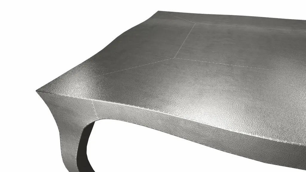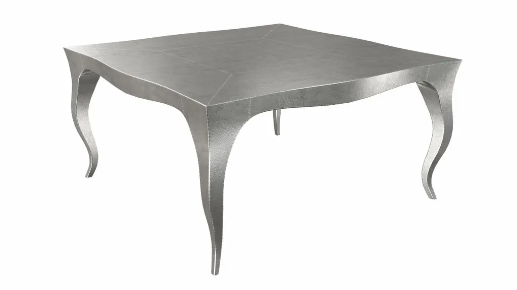 Nesting Tables from our Louise Collection. The renowned designer Paul Mathieu chose the name “Louise” when he created his more feminine version of Louis XV (1730-1760) furniture. The characteristic cabriole leg, curving outward at the knee and inward towards the foot in an "S" shape was born during this period. It is during the same era that English furniture makers produced the Queen Anne and Chippendale styles.Crafted with utmost care and attention to detail, these Louis Nesting Tables are made to order and are available in twelve metal clad finishes, ensuring that you can choose the perfect one to match your individual style and taste. The use of high-quality materials and expert craftsmanship ensure that each Art Deco Louis Nesting Tables is not only beautiful but also a true piece of art.The curved legs and side arms of this Art Deco Louis Nesting Tables are hand carved from solid pieces of teak. Pattern makers trace and cut complex forms that will cover the chair in a skin of copper, white bronze, brass or antiqued white bronze The metal finishes will tarnish over time. Regular non-abrasive household metal polishes can be used to restore the original luster.Overall, if you're looking for a piece of furniture that combines luxury, comfort, and style, then the Art Deco Nesting Tables is an excellent choice. With its distinctive curved profile and multiple finish options, this Chair set is sure to elevate the look of any room it is placed in, and be a beloved addition to your home for years to come.The images shown in this listing are shot in different lighting conditions and/or are 3D illustrations. We encourage our customers to please request a sample or a full sample set of 12 finishes so that they can experience the finish first hand. Louise Art Deco Center Tables Fine Hammered White Bronze by Paul MathieuSize- 31.5"x 31.5"x 16"HMaterials - White Bronze, Metal sheet, Teak, Wood, MetalTechniques: Hand-Crafted, Hand-Carved, Metal Work, Wood Work, Metal Wrapping, PolishedPlease note that moisture in air, sudden change in temperature and natural movement of wood over time causes the metal to wrinkle or bubble up. We use well seasoned, reclaimed teak and high quality marine grade MDF (wherever technically possible) to avoid and delay the mentioned changes. However a perfect stability of metal cannot be guaranteed. Please note that our smooth finish metal clad pieces will have some unavoidable tool marks. This is proof that everything is done by hand. The smooth finish will not come out like a machine made perfect surface and the master artisan will do their best to make it look as good/clean/stable/perfect as he possibly can.The antique white bronze finish is hand done by using an acidic chemical over the white bronze finish to recreate a natural patination. Like with the natural patination of silver, copper, or brass, the final result and color uniformity of the patina cannot be guaranteed. The goal of this finish is to achieve rainbow-like shades with dull, shiny, cloudy, and streaky patches to give an illusion of antiquing. Please note:None of our metal clad pieces are treated with a protective “finish” thus enabling the items to age naturally over time. We will of course polish them well before we pack them. a) Copper oxidizes faster than the other metals. In six to twelve months it will most likely lose its shine and will gradually turn to different shades of brown and/or green/blue. This aging process and its effect is referred to as verdigris. After a year the piece should not change much more. Copper does not rust, but does require periodic cleaning in order to retain its original shine if that the preferred option. ('BRASSO' or any known copper polish can be used to polish copper).b) Brass retains its shine for far longer than others, but will tarnish if not cleaned on occasion. ('BRASSO' is made to polish brass).c) White bronze, has the least tendency to show age or tarnish. If kept in a controlled climate, this metal will hold its shine for years. It can be cleaned with a cleanser and polished with a cloth. d) The antiqued white bronze finish will react with the natural elements the fastest in the beginning but it too will stop reacting and will settle down in a stable state like copper after 6-12 months. Since it is already antiqued and looked like it is tarnished, as described in an earlier message, this fast reaction will not change the over all look. In that way this surface is most forgiving. The images shown in this listing are shot in different lighting conditions and/or are 3D illustrations. We encourage our customers to please request a sample or a full sample set of 12 finishes so that they can experience the finish first hand.