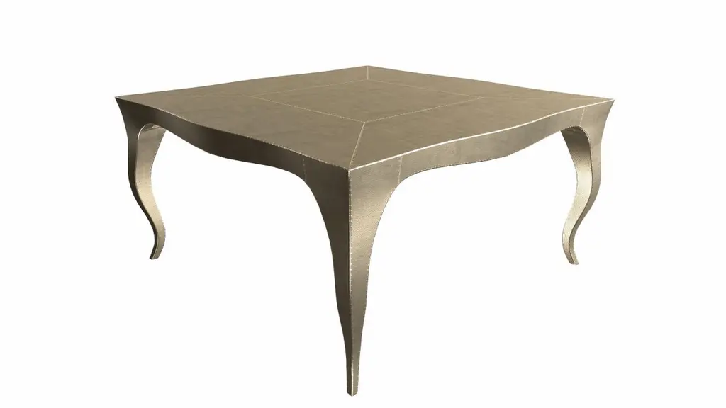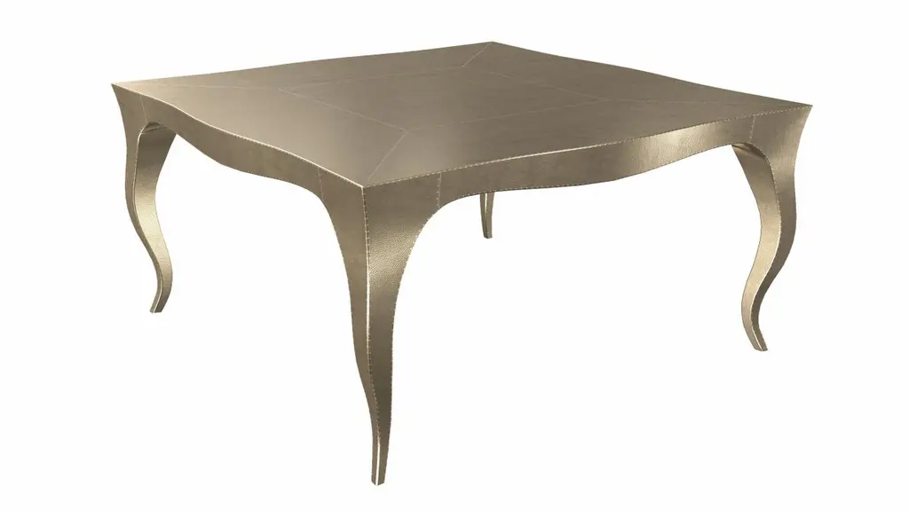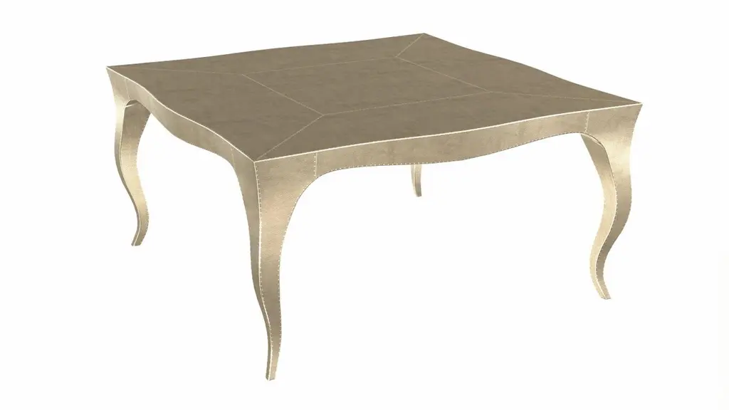 Nesting Tables from our Louise Collection. The renowned designer Paul Mathieu chose the name “Louise” when he created his more feminine version of Louis XV (1730-1760) furniture. The characteristic cabriole leg, curving outward at the knee and inward towards the foot in an "S" shape was born during this period. It is during the same era that English furniture makers produced the Queen Anne and Chippendale styles.Crafted with utmost care and attention to detail, these Louis Nesting Tables are made to order and are available in twelve metal clad finishes, ensuring that you can choose the perfect one to match your individual style and taste. The use of high-quality materials and expert craftsmanship ensure that each Art Deco Louis Nesting Tables is not only beautiful but also a true piece of art.The curved legs and side arms of this Art Deco Louis Nesting Tables are hand carved from solid pieces of teak. Pattern makers trace and cut complex forms that will cover the chair in a skin of copper, white bronze, brass or antiqued white bronze The metal finishes will tarnish over time. Regular non-abrasive household metal polishes can be used to restore the original luster.Overall, if you're looking for a piece of furniture that combines luxury, comfort, and style, then the Art Deco Nesting Tables is an excellent choice. With its distinctive curved profile and multiple finish options, this Chair set is sure to elevate the look of any room it is placed in, and be a beloved addition to your home for years to come.The images shown in this listing are shot in different lighting conditions and/or are 3D illustrations. We encourage our customers to please request a sample or a full sample set of 12 finishes so that they can experience the finish first hand. Louise Art Deco Center Tables Mid. Hammered Brass 18.5x18.5x10 inch by Paul Mathieu for Stephanie OdegardSize- 18.5"x 18.5"x 10"HMaterials - Brass, Metal sheet, Teak, Wood, MetalTechniques: Hand-Crafted, Hand-Carved, Metal Work, Wood Work, Metal Wrapping, PolishedPlease note that moisture in air, sudden change in temperature and natural movement of wood over time causes the metal to wrinkle or bubble up. We use well seasoned, reclaimed teak and high quality marine grade MDF (wherever technically possible) to avoid and delay the mentioned changes. However a perfect stability of metal cannot be guaranteed. Please note that our smooth finish metal clad pieces will have some unavoidable tool marks. This is proof that everything is done by hand. The smooth finish will not come out like a machine made perfect surface and the master artisan will do their best to make it look as good/clean/stable/perfect as he possibly can.The antique white bronze finish is hand done by using an acidic chemical over the white bronze finish to recreate a natural patination. Like with the natural patination of silver, copper, or brass, the final result and color uniformity of the patina cannot be guaranteed. The goal of this finish is to achieve rainbow-like shades with dull, shiny, cloudy, and streaky patches to give an illusion of antiquing. Please note:None of our metal clad pieces are treated with a protective “finish” thus enabling the items to age naturally over time. We will of course polish them well before we pack them. a) Copper oxidizes faster than the other metals. In six to twelve months it will most likely lose its shine and will gradually turn to different shades of brown and/or green/blue. This aging process and its effect is referred to as verdigris. After a year the piece should not change much more. Copper does not rust, but does require periodic cleaning in order to retain its original shine if that the preferred option. ('BRASSO' or any known copper polish can be used to polish copper).b) Brass retains its shine for far longer than others, but will tarnish if not cleaned on occasion. ('BRASSO' is made to polish brass).c) White bronze, has the least tendency to show age or tarnish. If kept in a controlled climate, this metal will hold its shine for years. It can be cleaned with a cleanser and polished with a cloth. d) The antiqued white bronze finish will react with the natural elements the fastest in the beginning but it too will stop reacting and will settle down in a stable state like copper after 6-12 months. Since it is already antiqued and looked like it is tarnished, as described in an earlier message, this fast reaction will not change the over all look. In that way this surface is most forgiving. The images shown in this listing are shot in different lighting conditions and/or are 3D illustrations. We encourage our customers to please request a sample or a full sample set of 12 finishes so that they can experience the finish first hand.