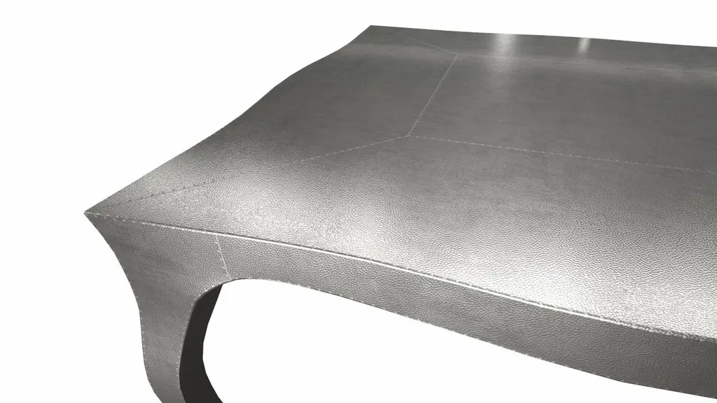 Nesting Tables from our Louise Collection. The renowned designer Paul Mathieu chose the name “Louise” when he created his more feminine version of Louis XV (1730-1760) furniture. The characteristic cabriole leg, curving outward at the knee and inward towards the foot in an "S" shape was born during this period. It is during the same era that English furniture makers produced the Queen Anne and Chippendale styles.Crafted with utmost care and attention to detail, these Louis Nesting Tables are made to order and are available in twelve metal clad finishes, ensuring that you can choose the perfect one to match your individual style and taste. The use of high-quality materials and expert craftsmanship ensure that each Art Deco Louis Nesting Tables is not only beautiful but also a true piece of art.The curved legs and side arms of this Art Deco Louis Nesting Tables are hand carved from solid pieces of teak. Pattern makers trace and cut complex forms that will cover the chair in a skin of copper, white bronze, brass or antiqued white bronze The metal finishes will tarnish over time. Regular non-abrasive household metal polishes can be used to restore the original luster.Overall, if you're looking for a piece of furniture that combines luxury, comfort, and style, then the Art Deco Nesting Tables is an excellent choice. With its distinctive curved profile and multiple finish options, this Chair set is sure to elevate the look of any room it is placed in, and be a beloved addition to your home for years to come.The images shown in this listing are shot in different lighting conditions and/or are 3D illustrations. We encourage our customers to please request a sample or a full sample set of 12 finishes so that they can experience the finish first hand. Louise Art Deco Center Tables Mid. Hammered White Bronze 18.5x18.5x10 inch by Paul Mathieu for Stephanie OdegardSize- 18.5"x 18.5"x 10"HMaterials - White Bronze, Metal sheet, Teak, Wood, MetalTechniques: Hand-Crafted, Hand-Carved, Metal Work, Wood Work, Metal Wrapping, PolishedPlease note that moisture in air, sudden change in temperature and natural movement of wood over time causes the metal to wrinkle or bubble up. We use well seasoned, reclaimed teak and high quality marine grade MDF (wherever technically possible) to avoid and delay the mentioned changes. However a perfect stability of metal cannot be guaranteed. Please note that our smooth finish metal clad pieces will have some unavoidable tool marks. This is proof that everything is done by hand. The smooth finish will not come out like a machine made perfect surface and the master artisan will do their best to make it look as good/clean/stable/perfect as he possibly can.The antique white bronze finish is hand done by using an acidic chemical over the white bronze finish to recreate a natural patination. Like with the natural patination of silver, copper, or brass, the final result and color uniformity of the patina cannot be guaranteed. The goal of this finish is to achieve rainbow-like shades with dull, shiny, cloudy, and streaky patches to give an illusion of antiquing. Please note:None of our metal clad pieces are treated with a protective “finish” thus enabling the items to age naturally over time. We will of course polish them well before we pack them. a) Copper oxidizes faster than the other metals. In six to twelve months it will most likely lose its shine and will gradually turn to different shades of brown and/or green/blue. This aging process and its effect is referred to as verdigris. After a year the piece should not change much more. Copper does not rust, but does require periodic cleaning in order to retain its original shine if that the preferred option. ('BRASSO' or any known copper polish can be used to polish copper).b) Brass retains its shine for far longer than others, but will tarnish if not cleaned on occasion. ('BRASSO' is made to polish brass).c) White bronze, has the least tendency to show age or tarnish. If kept in a controlled climate, this metal will hold its shine for years. It can be cleaned with a cleanser and polished with a cloth. d) The antiqued white bronze finish will react with the natural elements the fastest in the beginning but it too will stop reacting and will settle down in a stable state like copper after 6-12 months. Since it is already antiqued and looked like it is tarnished, as described in an earlier message, this fast reaction will not change the over all look. In that way this surface is most forgiving. The images shown in this listing are shot in different lighting conditions and/or are 3D illustrations. We encourage our customers to please request a sample or a full sample set of 12 finishes so that they can experience the finish first hand.