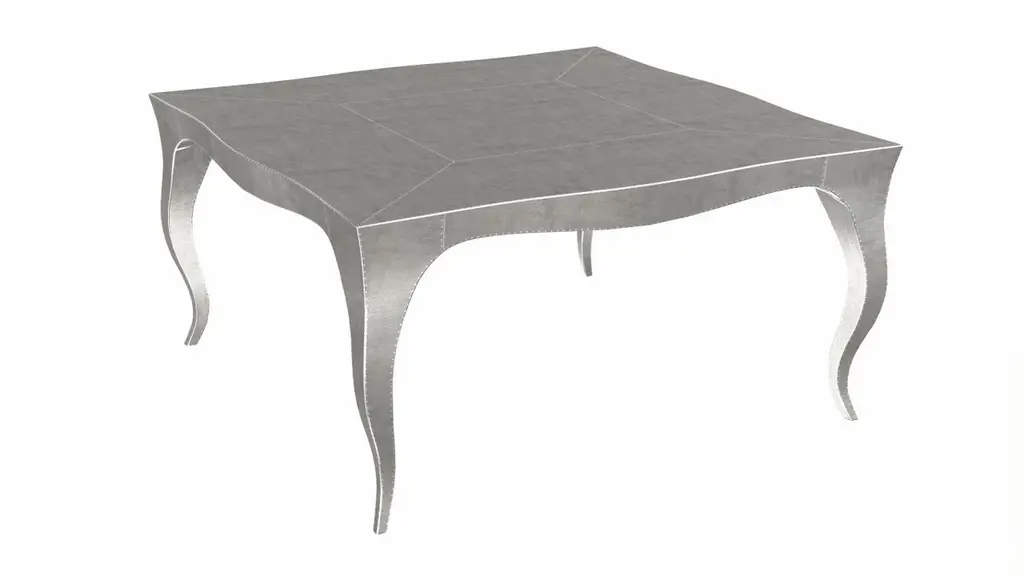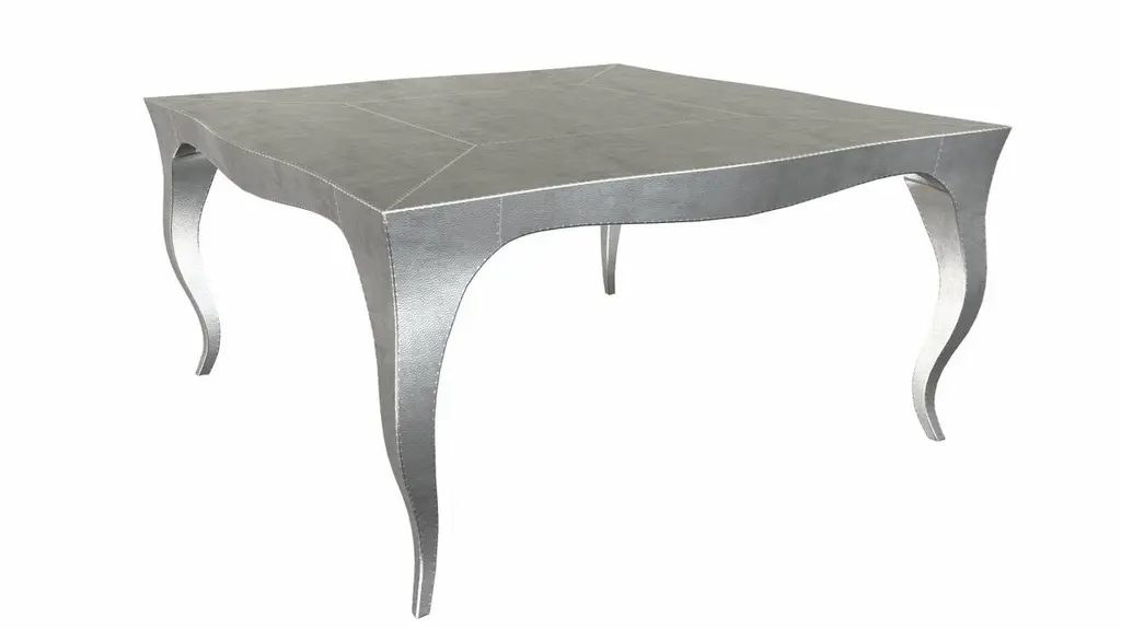 Nesting Tables from our Louise Collection. The renowned designer Paul Mathieu chose the name “Louise” when he created his more feminine version of Louis XV (1730-1760) furniture. The characteristic cabriole leg, curving outward at the knee and inward towards the foot in an "S" shape was born during this period. It is during the same era that English furniture makers produced the Queen Anne and Chippendale styles.Crafted with utmost care and attention to detail, these Louis Nesting Tables are made to order and are available in twelve metal clad finishes, ensuring that you can choose the perfect one to match your individual style and taste. The use of high-quality materials and expert craftsmanship ensure that each Art Deco Louis Nesting Tables is not only beautiful but also a true piece of art.The curved legs and side arms of this Art Deco Louis Nesting Tables are hand carved from solid pieces of teak. Pattern makers trace and cut complex forms that will cover the chair in a skin of copper, white bronze, brass or antiqued white bronze The metal finishes will tarnish over time. Regular non-abrasive household metal polishes can be used to restore the original luster.Overall, if you're looking for a piece of furniture that combines luxury, comfort, and style, then the Art Deco Nesting Tables is an excellent choice. With its distinctive curved profile and multiple finish options, this Chair set is sure to elevate the look of any room it is placed in, and be a beloved addition to your home for years to come.The images shown in this listing are shot in different lighting conditions and/or are 3D illustrations. We encourage our customers to please request a sample or a full sample set of 12 finishes so that they can experience the finish first hand. Louise Art Deco Center Tables Mid. Hammered White Bronze by Paul MathieuSize- 31.5"x 31.5"x 16"HMaterials - White Bronze, Metal sheet, Teak, Wood, MetalTechniques: Hand-Crafted, Hand-Carved, Metal Work, Wood Work, Metal Wrapping, PolishedPlease note that moisture in air, sudden change in temperature and natural movement of wood over time causes the metal to wrinkle or bubble up. We use well seasoned, reclaimed teak and high quality marine grade MDF (wherever technically possible) to avoid and delay the mentioned changes. However a perfect stability of metal cannot be guaranteed. Please note that our smooth finish metal clad pieces will have some unavoidable tool marks. This is proof that everything is done by hand. The smooth finish will not come out like a machine made perfect surface and the master artisan will do their best to make it look as good/clean/stable/perfect as he possibly can.The antique white bronze finish is hand done by using an acidic chemical over the white bronze finish to recreate a natural patination. Like with the natural patination of silver, copper, or brass, the final result and color uniformity of the patina cannot be guaranteed. The goal of this finish is to achieve rainbow-like shades with dull, shiny, cloudy, and streaky patches to give an illusion of antiquing. Please note:None of our metal clad pieces are treated with a protective “finish” thus enabling the items to age naturally over time. We will of course polish them well before we pack them. a) Copper oxidizes faster than the other metals. In six to twelve months it will most likely lose its shine and will gradually turn to different shades of brown and/or green/blue. This aging process and its effect is referred to as verdigris. After a year the piece should not change much more. Copper does not rust, but does require periodic cleaning in order to retain its original shine if that the preferred option. ('BRASSO' or any known copper polish can be used to polish copper).b) Brass retains its shine for far longer than others, but will tarnish if not cleaned on occasion. ('BRASSO' is made to polish brass).c) White bronze, has the least tendency to show age or tarnish. If kept in a controlled climate, this metal will hold its shine for years. It can be cleaned with a cleanser and polished with a cloth. d) The antiqued white bronze finish will react with the natural elements the fastest in the beginning but it too will stop reacting and will settle down in a stable state like copper after 6-12 months. Since it is already antiqued and looked like it is tarnished, as described in an earlier message, this fast reaction will not change the over all look. In that way this surface is most forgiving. The images shown in this listing are shot in different lighting conditions and/or are 3D illustrations. We encourage our customers to please request a sample or a full sample set of 12 finishes so that they can experience the finish first hand.