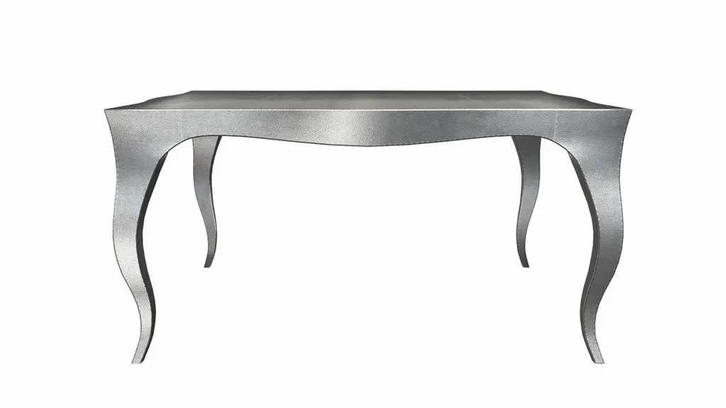 Nesting Tables from our Louise Collection. The renowned designer Paul Mathieu chose the name “Louise” when he created his more feminine version of Louis XV (1730-1760) furniture. The characteristic cabriole leg, curving outward at the knee and inward towards the foot in an "S" shape was born during this period. It is during the same era that English furniture makers produced the Queen Anne and Chippendale styles.Crafted with utmost care and attention to detail, these Louis Nesting Tables are made to order and are available in twelve metal clad finishes, ensuring that you can choose the perfect one to match your individual style and taste. The use of high-quality materials and expert craftsmanship ensure that each Art Deco Louis Nesting Tables is not only beautiful but also a true piece of art.The curved legs and side arms of this Art Deco Louis Nesting Tables are hand carved from solid pieces of teak. Pattern makers trace and cut complex forms that will cover the chair in a skin of copper, white bronze, brass or antiqued white bronze The metal finishes will tarnish over time. Regular non-abrasive household metal polishes can be used to restore the original luster.Overall, if you're looking for a piece of furniture that combines luxury, comfort, and style, then the Art Deco Nesting Tables is an excellent choice. With its distinctive curved profile and multiple finish options, this Chair set is sure to elevate the look of any room it is placed in, and be a beloved addition to your home for years to come.The images shown in this listing are shot in different lighting conditions and/or are 3D illustrations. We encourage our customers to please request a sample or a full sample set of 12 finishes so that they can experience the finish first hand. Louise Art Deco Coffee and Cocktail Tables Mid. Hammered White Bronze by Paul MathieuSize- 31.5"x 31.5"x 16"HMaterials - White Bronze, Metal sheet, Teak, Wood, MetalTechniques: Hand-Crafted, Hand-Carved, Metal Work, Wood Work, Metal Wrapping, PolishedPlease note that moisture in air, sudden change in temperature and natural movement of wood over time causes the metal to wrinkle or bubble up. We use well seasoned, reclaimed teak and high quality marine grade MDF (wherever technically possible) to avoid and delay the mentioned changes. However a perfect stability of metal cannot be guaranteed. Please note that our smooth finish metal clad pieces will have some unavoidable tool marks. This is proof that everything is done by hand. The smooth finish will not come out like a machine made perfect surface and the master artisan will do their best to make it look as good/clean/stable/perfect as he possibly can.The antique white bronze finish is hand done by using an acidic chemical over the white bronze finish to recreate a natural patination. Like with the natural patination of silver, copper, or brass, the final result and color uniformity of the patina cannot be guaranteed. The goal of this finish is to achieve rainbow-like shades with dull, shiny, cloudy, and streaky patches to give an illusion of antiquing. Please note:None of our metal clad pieces are treated with a protective “finish” thus enabling the items to age naturally over time. We will of course polish them well before we pack them. a) Copper oxidizes faster than the other metals. In six to twelve months it will most likely lose its shine and will gradually turn to different shades of brown and/or green/blue. This aging process and its effect is referred to as verdigris. After a year the piece should not change much more. Copper does not rust, but does require periodic cleaning in order to retain its original shine if that the preferred option. ('BRASSO' or any known copper polish can be used to polish copper).b) Brass retains its shine for far longer than others, but will tarnish if not cleaned on occasion. ('BRASSO' is made to polish brass).c) White bronze, has the least tendency to show age or tarnish. If kept in a controlled climate, this metal will hold its shine for years. It can be cleaned with a cleanser and polished with a cloth. d) The antiqued white bronze finish will react with the natural elements the fastest in the beginning but it too will stop reacting and will settle down in a stable state like copper after 6-12 months. Since it is already antiqued and looked like it is tarnished, as described in an earlier message, this fast reaction will not change the over all look. In that way this surface is most forgiving. The images shown in this listing are shot in different lighting conditions and/or are 3D illustrations. We encourage our customers to please request a sample or a full sample set of 12 finishes so that they can experience the finish first hand.