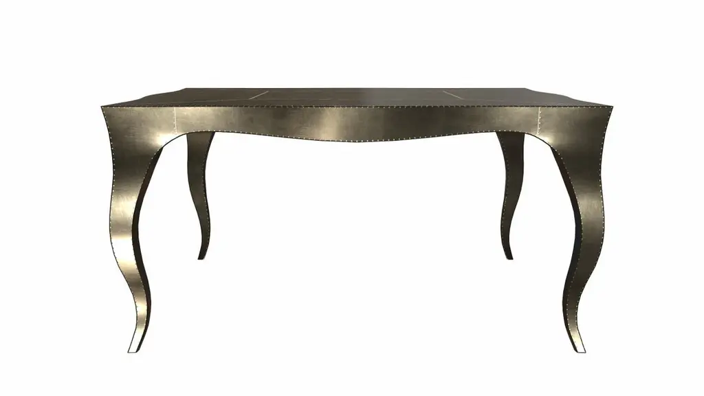 Nesting Tables from our Louise Collection. The renowned designer Paul Mathieu chose the name “Louise” when he created his more feminine version of Louis XV (1730-1760) furniture. The characteristic cabriole leg, curving outward at the knee and inward towards the foot in an "S" shape was born during this period. It is during the same era that English furniture makers produced the Queen Anne and Chippendale styles.Crafted with utmost care and attention to detail, these Louis Nesting Tables are made to order and are available in twelve metal clad finishes, ensuring that you can choose the perfect one to match your individual style and taste. The use of high-quality materials and expert craftsmanship ensure that each Art Deco Louis Nesting Tables is not only beautiful but also a true piece of art.The curved legs and side arms of this Art Deco Louis Nesting Tables are hand carved from solid pieces of teak. Pattern makers trace and cut complex forms that will cover the chair in a skin of copper, white bronze, brass or antiqued white bronze The metal finishes will tarnish over time. Regular non-abrasive household metal polishes can be used to restore the original luster.Overall, if you're looking for a piece of furniture that combines luxury, comfort, and style, then the Art Deco Nesting Tables is an excellent choice. With its distinctive curved profile and multiple finish options, this Chair set is sure to elevate the look of any room it is placed in, and be a beloved addition to your home for years to come.The images shown in this listing are shot in different lighting conditions and/or are 3D illustrations. We encourage our customers to please request a sample or a full sample set of 12 finishes so that they can experience the finish first hand. Louise Art Deco Coffee and Cocktail Tables Smooth Brass by Paul Mathieu for Stephanie OdegardeSize- 31.5"x 31.5"x 16"HMaterials - Brass, Metal sheet, Teak, Wood, MetalTechniques: Hand-Crafted, Hand-Carved, Metal Work, Wood Work, Metal Wrapping, PolishedPlease note that moisture in air, sudden change in temperature and natural movement of wood over time causes the metal to wrinkle or bubble up. We use well seasoned, reclaimed teak and high quality marine grade MDF (wherever technically possible) to avoid and delay the mentioned changes. However a perfect stability of metal cannot be guaranteed. Please note that our smooth finish metal clad pieces will have some unavoidable tool marks. This is proof that everything is done by hand. The smooth finish will not come out like a machine made perfect surface and the master artisan will do their best to make it look as good/clean/stable/perfect as he possibly can.The antique white bronze finish is hand done by using an acidic chemical over the white bronze finish to recreate a natural patination. Like with the natural patination of silver, copper, or brass, the final result and color uniformity of the patina cannot be guaranteed. The goal of this finish is to achieve rainbow-like shades with dull, shiny, cloudy, and streaky patches to give an illusion of antiquing. Please note:None of our metal clad pieces are treated with a protective “finish” thus enabling the items to age naturally over time. We will of course polish them well before we pack them. a) Copper oxidizes faster than the other metals. In six to twelve months it will most likely lose its shine and will gradually turn to different shades of brown and/or green/blue. This aging process and its effect is referred to as verdigris. After a year the piece should not change much more. Copper does not rust, but does require periodic cleaning in order to retain its original shine if that the preferred option. ('BRASSO' or any known copper polish can be used to polish copper).b) Brass retains its shine for far longer than others, but will tarnish if not cleaned on occasion. ('BRASSO' is made to polish brass).c) White bronze, has the least tendency to show age or tarnish. If kept in a controlled climate, this metal will hold its shine for years. It can be cleaned with a cleanser and polished with a cloth. d) The antiqued white bronze finish will react with the natural elements the fastest in the beginning but it too will stop reacting and will settle down in a stable state like copper after 6-12 months. Since it is already antiqued and looked like it is tarnished, as described in an earlier message, this fast reaction will not change the over all look. In that way this surface is most forgiving. The images shown in this listing are shot in different lighting conditions and/or are 3D illustrations. We encourage our customers to please request a sample or a full sample set of 12 finishes so that they can experience the finish first hand.