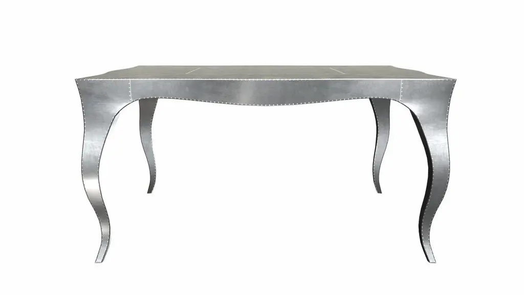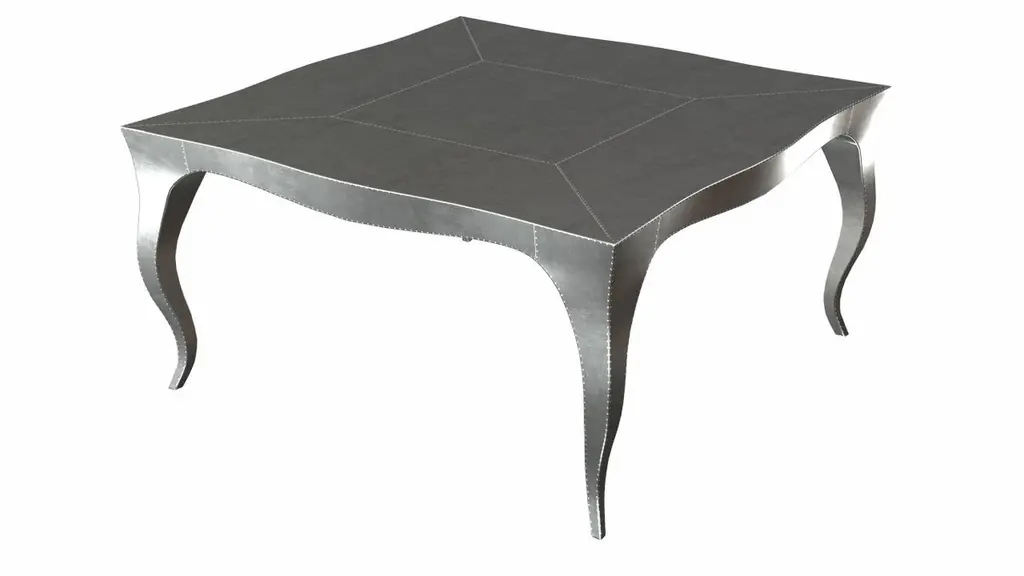 Nesting Tables from our Louise Collection. The renowned designer Paul Mathieu chose the name “Louise” when he created his more feminine version of Louis XV (1730-1760) furniture. The characteristic cabriole leg, curving outward at the knee and inward towards the foot in an "S" shape was born during this period. It is during the same era that English furniture makers produced the Queen Anne and Chippendale styles.Crafted with utmost care and attention to detail, these Louis Nesting Tables are made to order and are available in twelve metal clad finishes, ensuring that you can choose the perfect one to match your individual style and taste. The use of high-quality materials and expert craftsmanship ensure that each Art Deco Louis Nesting Tables is not only beautiful but also a true piece of art.The curved legs and side arms of this Art Deco Louis Nesting Tables are hand carved from solid pieces of teak. Pattern makers trace and cut complex forms that will cover the chair in a skin of copper, white bronze, brass or antiqued white bronze The metal finishes will tarnish over time. Regular non-abrasive household metal polishes can be used to restore the original luster.Overall, if you're looking for a piece of furniture that combines luxury, comfort, and style, then the Art Deco Nesting Tables is an excellent choice. With its distinctive curved profile and multiple finish options, this Chair set is sure to elevate the look of any room it is placed in, and be a beloved addition to your home for years to come.The images shown in this listing are shot in different lighting conditions and/or are 3D illustrations. We encourage our customers to please request a sample or a full sample set of 12 finishes so that they can experience the finish first hand. Louise Art Deco Coffee and Cocktail Tables Smooth White Bronze 18.5x18.5x10 inch by Paul Mathieu for Stephanid OdegardSize- 18.5"x 18.5"x 10"HMaterials - White Bronze, Metal sheet, Teak, Wood, MetalTechniques: Hand-Crafted, Hand-Carved, Metal Work, Wood Work, Metal Wrapping, PolishedPlease note that moisture in air, sudden change in temperature and natural movement of wood over time causes the metal to wrinkle or bubble up. We use well seasoned, reclaimed teak and high quality marine grade MDF (wherever technically possible) to avoid and delay the mentioned changes. However a perfect stability of metal cannot be guaranteed. Please note that our smooth finish metal clad pieces will have some unavoidable tool marks. This is proof that everything is done by hand. The smooth finish will not come out like a machine made perfect surface and the master artisan will do their best to make it look as good/clean/stable/perfect as he possibly can.The antique white bronze finish is hand done by using an acidic chemical over the white bronze finish to recreate a natural patination. Like with the natural patination of silver, copper, or brass, the final result and color uniformity of the patina cannot be guaranteed. The goal of this finish is to achieve rainbow-like shades with dull, shiny, cloudy, and streaky patches to give an illusion of antiquing. Please note:None of our metal clad pieces are treated with a protective “finish” thus enabling the items to age naturally over time. We will of course polish them well before we pack them. a) Copper oxidizes faster than the other metals. In six to twelve months it will most likely lose its shine and will gradually turn to different shades of brown and/or green/blue. This aging process and its effect is referred to as verdigris. After a year the piece should not change much more. Copper does not rust, but does require periodic cleaning in order to retain its original shine if that the preferred option. ('BRASSO' or any known copper polish can be used to polish copper).b) Brass retains its shine for far longer than others, but will tarnish if not cleaned on occasion. ('BRASSO' is made to polish brass).c) White bronze, has the least tendency to show age or tarnish. If kept in a controlled climate, this metal will hold its shine for years. It can be cleaned with a cleanser and polished with a cloth. d) The antiqued white bronze finish will react with the natural elements the fastest in the beginning but it too will stop reacting and will settle down in a stable state like copper after 6-12 months. Since it is already antiqued and looked like it is tarnished, as described in an earlier message, this fast reaction will not change the over all look. In that way this surface is most forgiving. The images shown in this listing are shot in different lighting conditions and/or are 3D illustrations. We encourage our customers to please request a sample or a full sample set of 12 finishes so that they can experience the finish first hand.