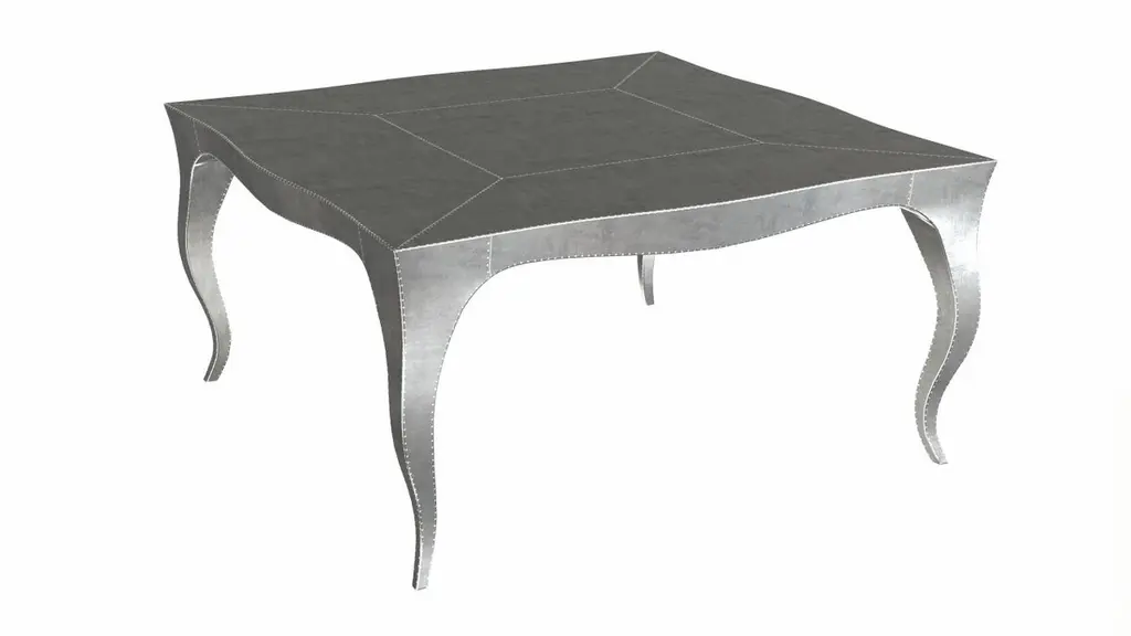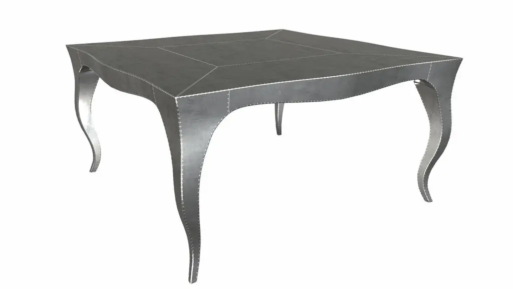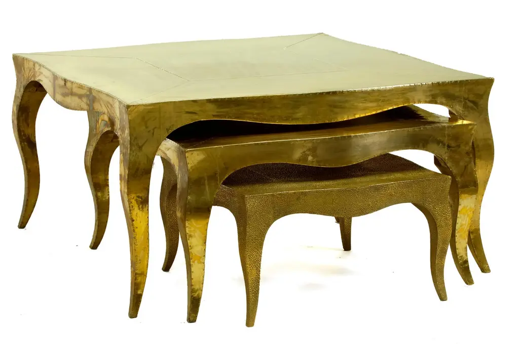 Nesting Tables from our Louise Collection. The renowned designer Paul Mathieu chose the name “Louise” when he created his more feminine version of Louis XV (1730-1760) furniture. The characteristic cabriole leg, curving outward at the knee and inward towards the foot in an "S" shape was born during this period. It is during the same era that English furniture makers produced the Queen Anne and Chippendale styles.Crafted with utmost care and attention to detail, these Louis Nesting Tables are made to order and are available in twelve metal clad finishes, ensuring that you can choose the perfect one to match your individual style and taste. The use of high-quality materials and expert craftsmanship ensure that each Art Deco Louis Nesting Tables is not only beautiful but also a true piece of art.The curved legs and side arms of this Art Deco Louis Nesting Tables are hand carved from solid pieces of teak. Pattern makers trace and cut complex forms that will cover the chair in a skin of copper, white bronze, brass or antiqued white bronze The metal finishes will tarnish over time. Regular non-abrasive household metal polishes can be used to restore the original luster.Overall, if you're looking for a piece of furniture that combines luxury, comfort, and style, then the Art Deco Nesting Tables is an excellent choice. With its distinctive curved profile and multiple finish options, this Chair set is sure to elevate the look of any room it is placed in, and be a beloved addition to your home for years to come.The images shown in this listing are shot in different lighting conditions and/or are 3D illustrations. We encourage our customers to please request a sample or a full sample set of 12 finishes so that they can experience the finish first hand. Louise Art Deco Coffee and Cocktail Tables Smooth White Bronze by Paul MathieuSize- 31.5"x 31.5"x 16"HMaterials - White Bronze, Metal sheet, Teak, Wood, MetalTechniques: Hand-Crafted, Hand-Carved, Metal Work, Wood Work, Metal Wrapping, PolishedPlease note that moisture in air, sudden change in temperature and natural movement of wood over time causes the metal to wrinkle or bubble up. We use well seasoned, reclaimed teak and high quality marine grade MDF (wherever technically possible) to avoid and delay the mentioned changes. However a perfect stability of metal cannot be guaranteed. Please note that our smooth finish metal clad pieces will have some unavoidable tool marks. This is proof that everything is done by hand. The smooth finish will not come out like a machine made perfect surface and the master artisan will do their best to make it look as good/clean/stable/perfect as he possibly can.The antique white bronze finish is hand done by using an acidic chemical over the white bronze finish to recreate a natural patination. Like with the natural patination of silver, copper, or brass, the final result and color uniformity of the patina cannot be guaranteed. The goal of this finish is to achieve rainbow-like shades with dull, shiny, cloudy, and streaky patches to give an illusion of antiquing. Please note:None of our metal clad pieces are treated with a protective “finish” thus enabling the items to age naturally over time. We will of course polish them well before we pack them. a) Copper oxidizes faster than the other metals. In six to twelve months it will most likely lose its shine and will gradually turn to different shades of brown and/or green/blue. This aging process and its effect is referred to as verdigris. After a year the piece should not change much more. Copper does not rust, but does require periodic cleaning in order to retain its original shine if that the preferred option. ('BRASSO' or any known copper polish can be used to polish copper).b) Brass retains its shine for far longer than others, but will tarnish if not cleaned on occasion. ('BRASSO' is made to polish brass).c) White bronze, has the least tendency to show age or tarnish. If kept in a controlled climate, this metal will hold its shine for years. It can be cleaned with a cleanser and polished with a cloth. d) The antiqued white bronze finish will react with the natural elements the fastest in the beginning but it too will stop reacting and will settle down in a stable state like copper after 6-12 months. Since it is already antiqued and looked like it is tarnished, as described in an earlier message, this fast reaction will not change the over all look. In that way this surface is most forgiving. The images shown in this listing are shot in different lighting conditions and/or are 3D illustrations. We encourage our customers to please request a sample or a full sample set of 12 finishes so that they can experience the finish first hand.
