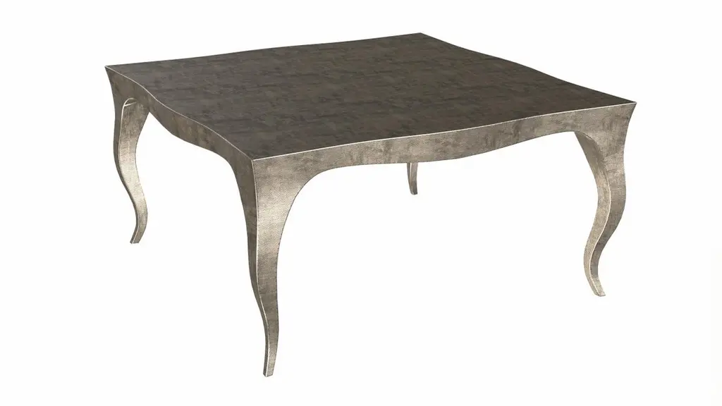 Nesting Tables from our Louise Collection. The renowned designer Paul Mathieu chose the name “Louise” when he created his more feminine version of Louis XV (1730-1760) furniture. The characteristic cabriole leg, curving outward at the knee and inward towards the foot in an "S" shape was born during this period. It is during the same era that English furniture makers produced the Queen Anne and Chippendale styles.Crafted with utmost care and attention to detail, these Louis Nesting Tables are made to order and are available in twelve metal clad finishes, ensuring that you can choose the perfect one to match your individual style and taste. The use of high-quality materials and expert craftsmanship ensure that each Art Deco Louis Nesting Tables is not only beautiful but also a true piece of art.The curved legs and side arms of this Art Deco Louis Nesting Tables are hand carved from solid pieces of teak. Pattern makers trace and cut complex forms that will cover the chair in a skin of copper, white bronze, brass or antiqued white bronze The metal finishes will tarnish over time. Regular non-abrasive household metal polishes can be used to restore the original luster.Overall, if you're looking for a piece of furniture that combines luxury, comfort, and style, then the Art Deco Nesting Tables is an excellent choice. With its distinctive curved profile and multiple finish options, this Chair set is sure to elevate the look of any room it is placed in, and be a beloved addition to your home for years to come.The images shown in this listing are shot in different lighting conditions and/or are 3D illustrations. We encourage our customers to please request a sample or a full sample set of 12 finishes so that they can experience the finish first hand. Louise Art Deco Game Tables Mid. Hammered Antique Bronze by Paul MathieuSize- 31.5"x 31.5"x 16"HMaterials - Antique Bronze, Metal sheet, Teak, Wood, MetalTechniques: Hand-Crafted, Hand-Carved, Metal Work, Wood Work, Metal Wrapping, PolishedPlease note that moisture in air, sudden change in temperature and natural movement of wood over time causes the metal to wrinkle or bubble up. We use well seasoned, reclaimed teak and high quality marine grade MDF (wherever technically possible) to avoid and delay the mentioned changes. However a perfect stability of metal cannot be guaranteed. Please note that our smooth finish metal clad pieces will have some unavoidable tool marks. This is proof that everything is done by hand. The smooth finish will not come out like a machine made perfect surface and the master artisan will do their best to make it look as good/clean/stable/perfect as he possibly can.The antique white bronze finish is hand done by using an acidic chemical over the white bronze finish to recreate a natural patination. Like with the natural patination of silver, copper, or brass, the final result and color uniformity of the patina cannot be guaranteed. The goal of this finish is to achieve rainbow-like shades with dull, shiny, cloudy, and streaky patches to give an illusion of antiquing. Please note:None of our metal clad pieces are treated with a protective “finish” thus enabling the items to age naturally over time. We will of course polish them well before we pack them. a) Copper oxidizes faster than the other metals. In six to twelve months it will most likely lose its shine and will gradually turn to different shades of brown and/or green/blue. This aging process and its effect is referred to as verdigris. After a year the piece should not change much more. Copper does not rust, but does require periodic cleaning in order to retain its original shine if that the preferred option. ('BRASSO' or any known copper polish can be used to polish copper).b) Brass retains its shine for far longer than others, but will tarnish if not cleaned on occasion. ('BRASSO' is made to polish brass).c) White bronze, has the least tendency to show age or tarnish. If kept in a controlled climate, this metal will hold its shine for years. It can be cleaned with a cleanser and polished with a cloth. d) The antiqued white bronze finish will react with the natural elements the fastest in the beginning but it too will stop reacting and will settle down in a stable state like copper after 6-12 months. Since it is already antiqued and looked like it is tarnished, as described in an earlier message, this fast reaction will not change the over all look. In that way this surface is most forgiving. The images shown in this listing are shot in different lighting conditions and/or are 3D illustrations. We encourage our customers to please request a sample or a full sample set of 12 finishes so that they can experience the finish first hand.