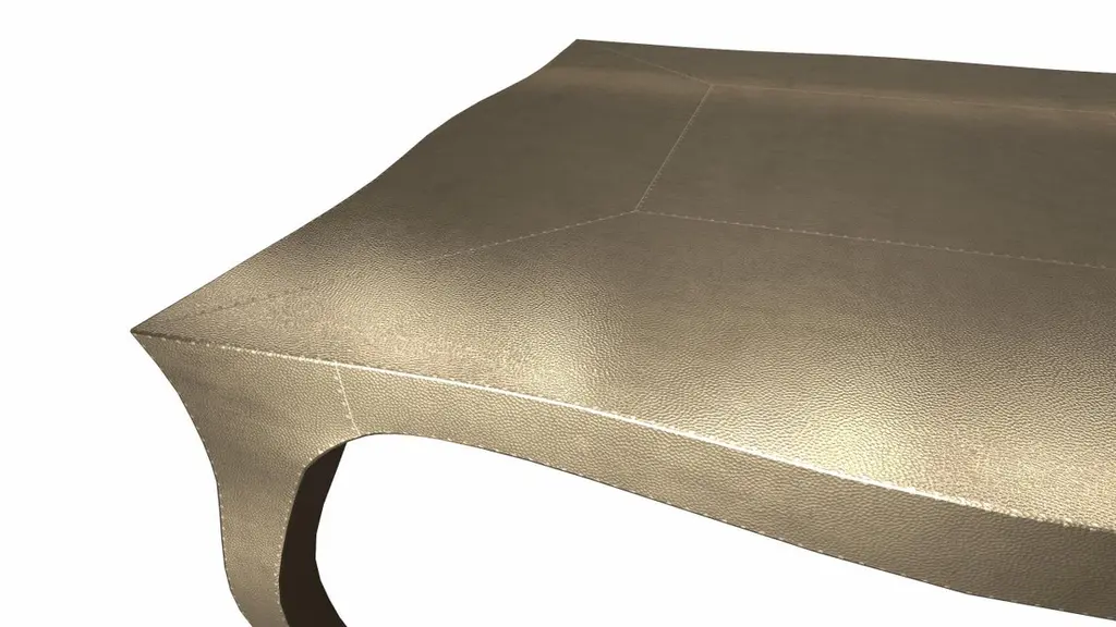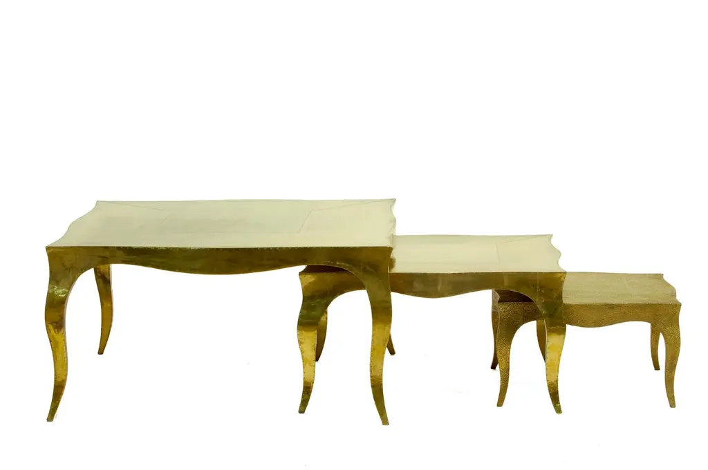 Nesting Tables from our Louise Collection. The renowned designer Paul Mathieu chose the name “Louise” when he created his more feminine version of Louis XV (1730-1760) furniture. The characteristic cabriole leg, curving outward at the knee and inward towards the foot in an "S" shape was born during this period. It is during the same era that English furniture makers produced the Queen Anne and Chippendale styles.Crafted with utmost care and attention to detail, these Louis Nesting Tables are made to order and are available in twelve metal clad finishes, ensuring that you can choose the perfect one to match your individual style and taste. The use of high-quality materials and expert craftsmanship ensure that each Art Deco Louis Nesting Tables is not only beautiful but also a true piece of art.The curved legs and side arms of this Art Deco Louis Nesting Tables are hand carved from solid pieces of teak. Pattern makers trace and cut complex forms that will cover the chair in a skin of copper, white bronze, brass or antiqued white bronze The metal finishes will tarnish over time. Regular non-abrasive household metal polishes can be used to restore the original luster.Overall, if you're looking for a piece of furniture that combines luxury, comfort, and style, then the Art Deco Nesting Tables is an excellent choice. With its distinctive curved profile and multiple finish options, this Chair set is sure to elevate the look of any room it is placed in, and be a beloved addition to your home for years to come.The images shown in this listing are shot in different lighting conditions and/or are 3D illustrations. We encourage our customers to please request a sample or a full sample set of 12 finishes so that they can experience the finish first hand. Louise Art Deco Game Tables Mid. Hammered Brass by Paul Mathieu for S.OdegardSize- 31.5"x 31.5"x 16"HMaterials - Brass, Metal sheet, Teak, Wood, MetalTechniques: Hand-Crafted, Hand-Carved, Metal Work, Wood Work, Metal Wrapping, PolishedPlease note that moisture in air, sudden change in temperature and natural movement of wood over time causes the metal to wrinkle or bubble up. We use well seasoned, reclaimed teak and high quality marine grade MDF (wherever technically possible) to avoid and delay the mentioned changes. However a perfect stability of metal cannot be guaranteed. Please note that our smooth finish metal clad pieces will have some unavoidable tool marks. This is proof that everything is done by hand. The smooth finish will not come out like a machine made perfect surface and the master artisan will do their best to make it look as good/clean/stable/perfect as he possibly can.The antique white bronze finish is hand done by using an acidic chemical over the white bronze finish to recreate a natural patination. Like with the natural patination of silver, copper, or brass, the final result and color uniformity of the patina cannot be guaranteed. The goal of this finish is to achieve rainbow-like shades with dull, shiny, cloudy, and streaky patches to give an illusion of antiquing. Please note:None of our metal clad pieces are treated with a protective “finish” thus enabling the items to age naturally over time. We will of course polish them well before we pack them. a) Copper oxidizes faster than the other metals. In six to twelve months it will most likely lose its shine and will gradually turn to different shades of brown and/or green/blue. This aging process and its effect is referred to as verdigris. After a year the piece should not change much more. Copper does not rust, but does require periodic cleaning in order to retain its original shine if that the preferred option. ('BRASSO' or any known copper polish can be used to polish copper).b) Brass retains its shine for far longer than others, but will tarnish if not cleaned on occasion. ('BRASSO' is made to polish brass).c) White bronze, has the least tendency to show age or tarnish. If kept in a controlled climate, this metal will hold its shine for years. It can be cleaned with a cleanser and polished with a cloth. d) The antiqued white bronze finish will react with the natural elements the fastest in the beginning but it too will stop reacting and will settle down in a stable state like copper after 6-12 months. Since it is already antiqued and looked like it is tarnished, as described in an earlier message, this fast reaction will not change the over all look. In that way this surface is most forgiving. The images shown in this listing are shot in different lighting conditions and/or are 3D illustrations. We encourage our customers to please request a sample or a full sample set of 12 finishes so that they can experience the finish first hand.
