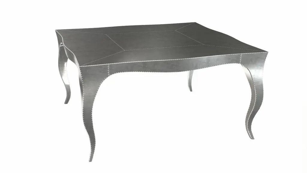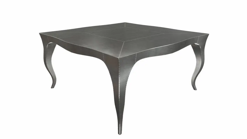 Nesting Tables from our Louise Collection. The renowned designer Paul Mathieu chose the name “Louise” when he created his more feminine version of Louis XV (1730-1760) furniture. The characteristic cabriole leg, curving outward at the knee and inward towards the foot in an "S" shape was born during this period. It is during the same era that English furniture makers produced the Queen Anne and Chippendale styles.Crafted with utmost care and attention to detail, these Louis Nesting Tables are made to order and are available in twelve metal clad finishes, ensuring that you can choose the perfect one to match your individual style and taste. The use of high-quality materials and expert craftsmanship ensure that each Art Deco Louis Nesting Tables is not only beautiful but also a true piece of art.The curved legs and side arms of this Art Deco Louis Nesting Tables are hand carved from solid pieces of teak. Pattern makers trace and cut complex forms that will cover the chair in a skin of copper, white bronze, brass or antiqued white bronze The metal finishes will tarnish over time. Regular non-abrasive household metal polishes can be used to restore the original luster.Overall, if you're looking for a piece of furniture that combines luxury, comfort, and style, then the Art Deco Nesting Tables is an excellent choice. With its distinctive curved profile and multiple finish options, this Chair set is sure to elevate the look of any room it is placed in, and be a beloved addition to your home for years to come.The images shown in this listing are shot in different lighting conditions and/or are 3D illustrations. We encourage our customers to please request a sample or a full sample set of 12 finishes so that they can experience the finish first hand. Louise Art Deco Game Tables Smooth White Bronze 18.5x18.5x10 inch by Paul Mathieu for Stephanid OdegardSize- 18.5"x 18.5"x 10"HMaterials - White Bronze, Metal sheet, Teak, Wood, MetalTechniques: Hand-Crafted, Hand-Carved, Metal Work, Wood Work, Metal Wrapping, PolishedPlease note that moisture in air, sudden change in temperature and natural movement of wood over time causes the metal to wrinkle or bubble up. We use well seasoned, reclaimed teak and high quality marine grade MDF (wherever technically possible) to avoid and delay the mentioned changes. However a perfect stability of metal cannot be guaranteed. Please note that our smooth finish metal clad pieces will have some unavoidable tool marks. This is proof that everything is done by hand. The smooth finish will not come out like a machine made perfect surface and the master artisan will do their best to make it look as good/clean/stable/perfect as he possibly can.The antique white bronze finish is hand done by using an acidic chemical over the white bronze finish to recreate a natural patination. Like with the natural patination of silver, copper, or brass, the final result and color uniformity of the patina cannot be guaranteed. The goal of this finish is to achieve rainbow-like shades with dull, shiny, cloudy, and streaky patches to give an illusion of antiquing. Please note:None of our metal clad pieces are treated with a protective “finish” thus enabling the items to age naturally over time. We will of course polish them well before we pack them. a) Copper oxidizes faster than the other metals. In six to twelve months it will most likely lose its shine and will gradually turn to different shades of brown and/or green/blue. This aging process and its effect is referred to as verdigris. After a year the piece should not change much more. Copper does not rust, but does require periodic cleaning in order to retain its original shine if that the preferred option. ('BRASSO' or any known copper polish can be used to polish copper).b) Brass retains its shine for far longer than others, but will tarnish if not cleaned on occasion. ('BRASSO' is made to polish brass).c) White bronze, has the least tendency to show age or tarnish. If kept in a controlled climate, this metal will hold its shine for years. It can be cleaned with a cleanser and polished with a cloth. d) The antiqued white bronze finish will react with the natural elements the fastest in the beginning but it too will stop reacting and will settle down in a stable state like copper after 6-12 months. Since it is already antiqued and looked like it is tarnished, as described in an earlier message, this fast reaction will not change the over all look. In that way this surface is most forgiving. The images shown in this listing are shot in different lighting conditions and/or are 3D illustrations. We encourage our customers to please request a sample or a full sample set of 12 finishes so that they can experience the finish first hand.