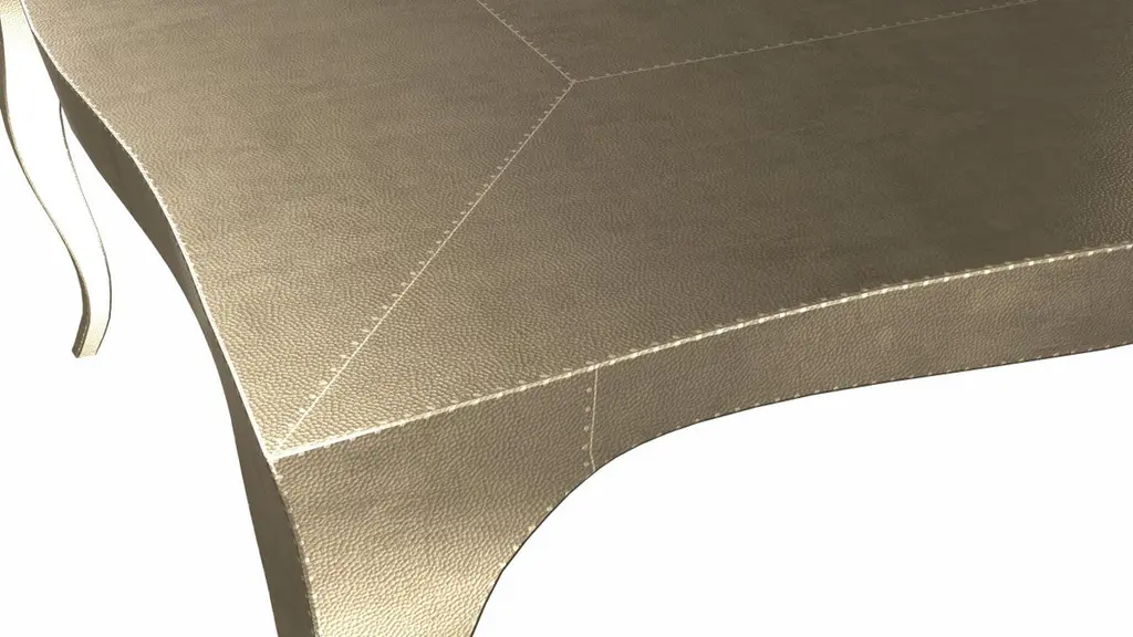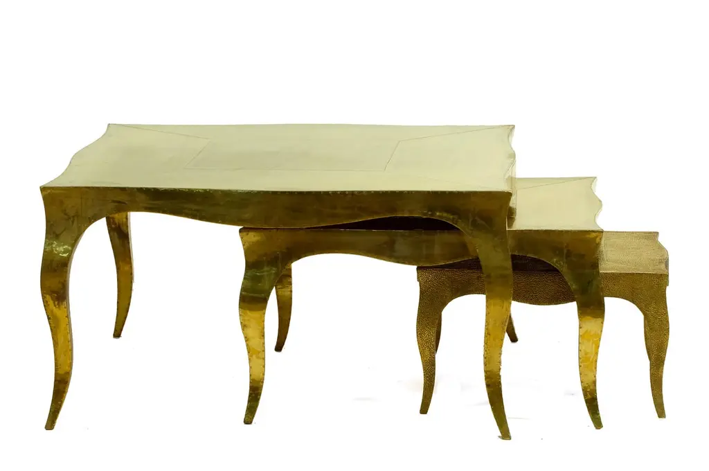 Nesting Tables from our Louise Collection. The renowned designer Paul Mathieu chose the name “Louise” when he created his more feminine version of Louis XV (1730-1760) furniture. The characteristic cabriole leg, curving outward at the knee and inward towards the foot in an "S" shape was born during this period. It is during the same era that English furniture makers produced the Queen Anne and Chippendale styles.Crafted with utmost care and attention to detail, these Louis Nesting Tables are made to order and are available in twelve metal clad finishes, ensuring that you can choose the perfect one to match your individual style and taste. The use of high-quality materials and expert craftsmanship ensure that each Art Deco Louis Nesting Tables is not only beautiful but also a true piece of art.The curved legs and side arms of this Art Deco Louis Nesting Tables are hand carved from solid pieces of teak. Pattern makers trace and cut complex forms that will cover the chair in a skin of copper, white bronze, brass or antiqued white bronze The metal finishes will tarnish over time. Regular non-abrasive household metal polishes can be used to restore the original luster.Overall, if you're looking for a piece of furniture that combines luxury, comfort, and style, then the Art Deco Nesting Tables is an excellent choice. With its distinctive curved profile and multiple finish options, this Chair set is sure to elevate the look of any room it is placed in, and be a beloved addition to your home for years to come.The images shown in this listing are shot in different lighting conditions and/or are 3D illustrations. We encourage our customers to please request a sample or a full sample set of 12 finishes so that they can experience the finish first hand. Louise Art Deco Industrial and Work Tables Mid. Hammered Brass 18.5x18.5x10 inch by Paul Mathieu for Stephanie OdegardSize- 18.5"x 18.5"x 10"HMaterials - Brass, Metal sheet, Teak, Wood, MetalTechniques: Hand-Crafted, Hand-Carved, Metal Work, Wood Work, Metal Wrapping, PolishedPlease note that moisture in air, sudden change in temperature and natural movement of wood over time causes the metal to wrinkle or bubble up. We use well seasoned, reclaimed teak and high quality marine grade MDF (wherever technically possible) to avoid and delay the mentioned changes. However a perfect stability of metal cannot be guaranteed. Please note that our smooth finish metal clad pieces will have some unavoidable tool marks. This is proof that everything is done by hand. The smooth finish will not come out like a machine made perfect surface and the master artisan will do their best to make it look as good/clean/stable/perfect as he possibly can.The antique white bronze finish is hand done by using an acidic chemical over the white bronze finish to recreate a natural patination. Like with the natural patination of silver, copper, or brass, the final result and color uniformity of the patina cannot be guaranteed. The goal of this finish is to achieve rainbow-like shades with dull, shiny, cloudy, and streaky patches to give an illusion of antiquing. Please note:None of our metal clad pieces are treated with a protective “finish” thus enabling the items to age naturally over time. We will of course polish them well before we pack them. a) Copper oxidizes faster than the other metals. In six to twelve months it will most likely lose its shine and will gradually turn to different shades of brown and/or green/blue. This aging process and its effect is referred to as verdigris. After a year the piece should not change much more. Copper does not rust, but does require periodic cleaning in order to retain its original shine if that the preferred option. ('BRASSO' or any known copper polish can be used to polish copper).b) Brass retains its shine for far longer than others, but will tarnish if not cleaned on occasion. ('BRASSO' is made to polish brass).c) White bronze, has the least tendency to show age or tarnish. If kept in a controlled climate, this metal will hold its shine for years. It can be cleaned with a cleanser and polished with a cloth. d) The antiqued white bronze finish will react with the natural elements the fastest in the beginning but it too will stop reacting and will settle down in a stable state like copper after 6-12 months. Since it is already antiqued and looked like it is tarnished, as described in an earlier message, this fast reaction will not change the over all look. In that way this surface is most forgiving. The images shown in this listing are shot in different lighting conditions and/or are 3D illustrations. We encourage our customers to please request a sample or a full sample set of 12 finishes so that they can experience the finish first hand.