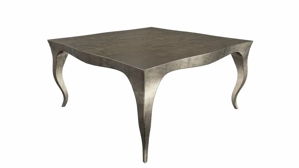 Nesting Tables from our Louise Collection. The renowned designer Paul Mathieu chose the name “Louise” when he created his more feminine version of Louis XV (1730-1760) furniture. The characteristic cabriole leg, curving outward at the knee and inward towards the foot in an "S" shape was born during this period. It is during the same era that English furniture makers produced the Queen Anne and Chippendale styles.Crafted with utmost care and attention to detail, these Louis Nesting Tables are made to order and are available in twelve metal clad finishes, ensuring that you can choose the perfect one to match your individual style and taste. The use of high-quality materials and expert craftsmanship ensure that each Art Deco Louis Nesting Tables is not only beautiful but also a true piece of art.The curved legs and side arms of this Art Deco Louis Nesting Tables are hand carved from solid pieces of teak. Pattern makers trace and cut complex forms that will cover the chair in a skin of copper, white bronze, brass or antiqued white bronze The metal finishes will tarnish over time. Regular non-abrasive household metal polishes can be used to restore the original luster.Overall, if you're looking for a piece of furniture that combines luxury, comfort, and style, then the Art Deco Nesting Tables is an excellent choice. With its distinctive curved profile and multiple finish options, this Chair set is sure to elevate the look of any room it is placed in, and be a beloved addition to your home for years to come.The images shown in this listing are shot in different lighting conditions and/or are 3D illustrations. We encourage our customers to please request a sample or a full sample set of 12 finishes so that they can experience the finish first hand. Louise Art Deco Industrial and Work Tables Fine Hammered Antique Bronze 18.5x18.5x10 inch by Paul Mathieu for Stephanie OdegardSize- 18.5"x 18.5"x 10"HMaterials - Antique Bronze, Metal sheet, Teak, Wood, MetalTechniques: Hand-Crafted, Hand-Carved, Metal Work, Wood Work, Metal Wrapping, PolishedPlease note that moisture in air, sudden change in temperature and natural movement of wood over time causes the metal to wrinkle or bubble up. We use well seasoned, reclaimed teak and high quality marine grade MDF (wherever technically possible) to avoid and delay the mentioned changes. However a perfect stability of metal cannot be guaranteed. Please note that our smooth finish metal clad pieces will have some unavoidable tool marks. This is proof that everything is done by hand. The smooth finish will not come out like a machine made perfect surface and the master artisan will do their best to make it look as good/clean/stable/perfect as he possibly can.The antique white bronze finish is hand done by using an acidic chemical over the white bronze finish to recreate a natural patination. Like with the natural patination of silver, copper, or brass, the final result and color uniformity of the patina cannot be guaranteed. The goal of this finish is to achieve rainbow-like shades with dull, shiny, cloudy, and streaky patches to give an illusion of antiquing. Please note:None of our metal clad pieces are treated with a protective “finish” thus enabling the items to age naturally over time. We will of course polish them well before we pack them. a) Copper oxidizes faster than the other metals. In six to twelve months it will most likely lose its shine and will gradually turn to different shades of brown and/or green/blue. This aging process and its effect is referred to as verdigris. After a year the piece should not change much more. Copper does not rust, but does require periodic cleaning in order to retain its original shine if that the preferred option. ('BRASSO' or any known copper polish can be used to polish copper).b) Brass retains its shine for far longer than others, but will tarnish if not cleaned on occasion. ('BRASSO' is made to polish brass).c) White bronze, has the least tendency to show age or tarnish. If kept in a controlled climate, this metal will hold its shine for years. It can be cleaned with a cleanser and polished with a cloth. d) The antiqued white bronze finish will react with the natural elements the fastest in the beginning but it too will stop reacting and will settle down in a stable state like copper after 6-12 months. Since it is already antiqued and looked like it is tarnished, as described in an earlier message, this fast reaction will not change the over all look. In that way this surface is most forgiving. The images shown in this listing are shot in different lighting conditions and/or are 3D illustrations. We encourage our customers to please request a sample or a full sample set of 12 finishes so that they can experience the finish first hand.