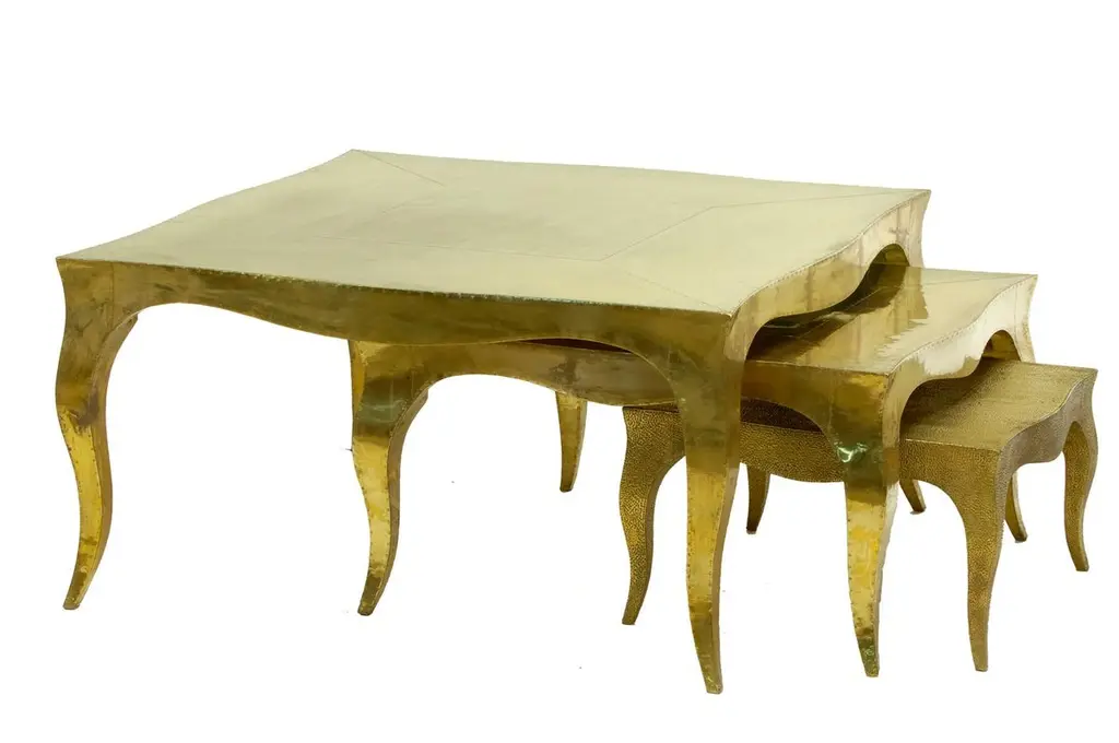 Nesting Tables from our Louise Collection. The renowned designer Paul Mathieu chose the name “Louise” when he created his more feminine version of Louis XV (1730-1760) furniture. The characteristic cabriole leg, curving outward at the knee and inward towards the foot in an "S" shape was born during this period. It is during the same era that English furniture makers produced the Queen Anne and Chippendale styles.Crafted with utmost care and attention to detail, these Louis Nesting Tables are made to order and are available in twelve metal clad finishes, ensuring that you can choose the perfect one to match your individual style and taste. The use of high-quality materials and expert craftsmanship ensure that each Art Deco Louis Nesting Tables is not only beautiful but also a true piece of art.The curved legs and side arms of this Art Deco Louis Nesting Tables are hand carved from solid pieces of teak. Pattern makers trace and cut complex forms that will cover the chair in a skin of copper, white bronze, brass or antiqued white bronze The metal finishes will tarnish over time. Regular non-abrasive household metal polishes can be used to restore the original luster.Overall, if you're looking for a piece of furniture that combines luxury, comfort, and style, then the Art Deco Nesting Tables is an excellent choice. With its distinctive curved profile and multiple finish options, this Chair set is sure to elevate the look of any room it is placed in, and be a beloved addition to your home for years to come.The images shown in this listing are shot in different lighting conditions and/or are 3D illustrations. We encourage our customers to please request a sample or a full sample set of 12 finishes so that they can experience the finish first hand. Louise Art Deco Industrial and Work Tables Smooth Antique Bronze 18.5x18.5x10 inch by Paul Mathieu for Stephanie OdegardSize- 18.5"x 18.5"x 10"HMaterials - Copper, Metal sheet, Teak, Wood, MetalTechniques: Hand-Crafted, Hand-Carved, Metal Work, Wood Work, Metal Wrapping, PolishedPlease note that moisture in air, sudden change in temperature and natural movement of wood over time causes the metal to wrinkle or bubble up. We use well seasoned, reclaimed teak and high quality marine grade MDF (wherever technically possible) to avoid and delay the mentioned changes. However a perfect stability of metal cannot be guaranteed. Please note that our smooth finish metal clad pieces will have some unavoidable tool marks. This is proof that everything is done by hand. The smooth finish will not come out like a machine made perfect surface and the master artisan will do their best to make it look as good/clean/stable/perfect as he possibly can.The antique white bronze finish is hand done by using an acidic chemical over the white bronze finish to recreate a natural patination. Like with the natural patination of silver, copper, or brass, the final result and color uniformity of the patina cannot be guaranteed. The goal of this finish is to achieve rainbow-like shades with dull, shiny, cloudy, and streaky patches to give an illusion of antiquing. Please note:None of our metal clad pieces are treated with a protective “finish” thus enabling the items to age naturally over time. We will of course polish them well before we pack them. a) Copper oxidizes faster than the other metals. In six to twelve months it will most likely lose its shine and will gradually turn to different shades of brown and/or green/blue. This aging process and its effect is referred to as verdigris. After a year the piece should not change much more. Copper does not rust, but does require periodic cleaning in order to retain its original shine if that the preferred option. ('BRASSO' or any known copper polish can be used to polish copper).b) Brass retains its shine for far longer than others, but will tarnish if not cleaned on occasion. ('BRASSO' is made to polish brass).c) White bronze, has the least tendency to show age or tarnish. If kept in a controlled climate, this metal will hold its shine for years. It can be cleaned with a cleanser and polished with a cloth. d) The antiqued white bronze finish will react with the natural elements the fastest in the beginning but it too will stop reacting and will settle down in a stable state like copper after 6-12 months. Since it is already antiqued and looked like it is tarnished, as described in an earlier message, this fast reaction will not change the over all look. In that way this surface is most forgiving. The images shown in this listing are shot in different lighting conditions and/or are 3D illustrations. We encourage our customers to please request a sample or a full sample set of 12 finishes so that they can experience the finish first hand.