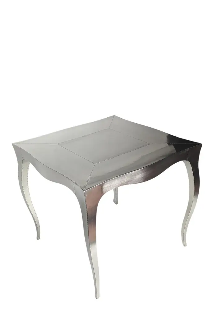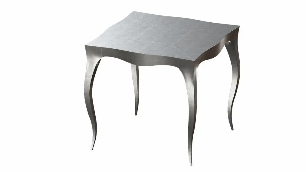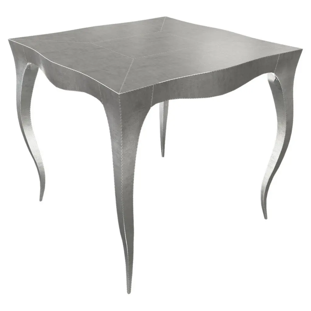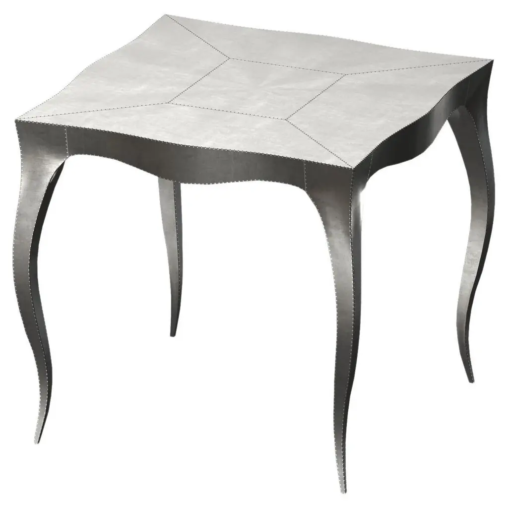 Louis Card Tables from our Louise Collection. The renowned designer Paul Mathieu chose the name “Louise” when he created his more feminine version of Louis XV (1730-1760) furniture. The characteristic cabriole leg, curving outward at the knee and inward towards the foot in an "S" shape was born during this period. It is during the same era that English furniture makers produced the Queen Anne and Chippendale styles.Crafted with utmost care and attention to detail, these Louis Card Tables are made to order and are available in twelve metal clad finishes, ensuring that you can choose the perfect one to match your individual style and taste. The use of high-quality materials and expert craftsmanship ensure that each Art Deco Louis Card Tables is not only beautiful but also a true piece of art.The curved legs and side arms of this Art Deco Louis Card Tables are hand carved from solid pieces of teak. Pattern makers trace and cut complex forms that will cover the chair in a skin of copper, white bronze, brass or antiqued white bronze The metal finishes will tarnish over time. Regular non-abrasive household metal polishes can be used to restore the original luster.Overall, if you're looking for a piece of furniture that combines luxury, comfort, and style, then the Art Deco Card Tables is an excellent choice. With its distinctive curved profile and multiple finish options, this Chair set is sure to elevate the look of any room it is placed in, and be a beloved addition to your home for years to come.The images shown in this listing are shot in different lighting conditions and/or are 3D illustrations. We encourage our customers to please request a sample or a full sample set of 12 finishes so that they can experience the finish first hand. Louise Art Deco Nesting and Stacking Tables Mid. Hammered White Bronze by Paul Mathieu for Stephanie OdegardSize- 32"x 32"x 30"HMaterials - White Bronze, Metal sheet, Teak, Wood, MetalTechniques: Hand-Crafted, Hand-Carved, Metal Work, Wood Work, Metal Wrapping, PolishedPlease note that moisture in air, sudden change in temperature and natural movement of wood over time causes the metal to wrinkle or bubble up. We use well seasoned, reclaimed teak and high quality marine grade MDF (wherever technically possible) to avoid and delay the mentioned changes. However a perfect stability of metal cannot be guaranteed. Please note that our smooth finish metal clad pieces will have some unavoidable tool marks. This is proof that everything is done by hand. The smooth finish will not come out like a machine made perfect surface and the master artisan will do their best to make it look as good/clean/stable/perfect as he possibly can.The antique white bronze finish is hand done by using an acidic chemical over the white bronze finish to recreate a natural patination. Like with the natural patination of silver, copper, or brass, the final result and color uniformity of the patina cannot be guaranteed. The goal of this finish is to achieve rainbow-like shades with dull, shiny, cloudy, and streaky patches to give an illusion of antiquing. Please note:None of our metal clad pieces are treated with a protective “finish” thus enabling the items to age naturally over time. We will of course polish them well before we pack them. a) Copper oxidizes faster than the other metals. In six to twelve months it will most likely lose its shine and will gradually turn to different shades of brown and/or green/blue. This aging process and its effect is referred to as verdigris. After a year the piece should not change much more. Copper does not rust, but does require periodic cleaning in order to retain its original shine if that the preferred option. ('BRASSO' or any known copper polish can be used to polish copper).b) Brass retains its shine for far longer than others, but will tarnish if not cleaned on occasion. ('BRASSO' is made to polish brass).c) White bronze, has the least tendency to show age or tarnish. If kept in a controlled climate, this metal will hold its shine for years. It can be cleaned with a cleanser and polished with a cloth. d) The antiqued white bronze finish will react with the natural elements the fastest in the beginning but it too will stop reacting and will settle down in a stable state like copper after 6-12 months. Since it is already antiqued and looked like it is tarnished, as described in an earlier message, this fast reaction will not change the over all look. In that way this surface is most forgiving. The images shown in this listing are shot in different lighting conditions and/or are 3D illustrations. We encourage our customers to please request a sample or a full sample set of 12 finishes so that they can experience the finish first hand.