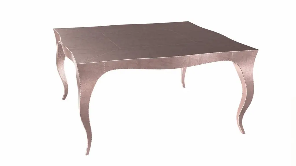 Nesting Tables from our Louise Collection. The renowned designer Paul Mathieu chose the name “Louise” when he created his more feminine version of Louis XV (1730-1760) furniture. The characteristic cabriole leg, curving outward at the knee and inward towards the foot in an "S" shape was born during this period. It is during the same era that English furniture makers produced the Queen Anne and Chippendale styles.Crafted with utmost care and attention to detail, these Louis Nesting Tables are made to order and are available in twelve metal clad finishes, ensuring that you can choose the perfect one to match your individual style and taste. The use of high-quality materials and expert craftsmanship ensure that each Art Deco Louis Nesting Tables is not only beautiful but also a true piece of art.The curved legs and side arms of this Art Deco Louis Nesting Tables are hand carved from solid pieces of teak. Pattern makers trace and cut complex forms that will cover the chair in a skin of copper, white bronze, brass or antiqued white bronze The metal finishes will tarnish over time. Regular non-abrasive household metal polishes can be used to restore the original luster.Overall, if you're looking for a piece of furniture that combines luxury, comfort, and style, then the Art Deco Nesting Tables is an excellent choice. With its distinctive curved profile and multiple finish options, this Chair set is sure to elevate the look of any room it is placed in, and be a beloved addition to your home for years to come.The images shown in this listing are shot in different lighting conditions and/or are 3D illustrations. We encourage our customers to please request a sample or a full sample set of 12 finishes so that they can experience the finish first hand. Louise Art Deco Nesting Tables and Stacking Tables Fine Hammered Copper by Paul MathieuSize- 31.5"x 31.5"x 16"HMaterials - Copper, Metal sheet, Teak, Wood, MetalTechniques: Hand-Crafted, Hand-Carved, Metal Work, Wood Work, Metal Wrapping, PolishedPlease note that moisture in air, sudden change in temperature and natural movement of wood over time causes the metal to wrinkle or bubble up. We use well seasoned, reclaimed teak and high quality marine grade MDF (wherever technically possible) to avoid and delay the mentioned changes. However a perfect stability of metal cannot be guaranteed. Please note that our smooth finish metal clad pieces will have some unavoidable tool marks. This is proof that everything is done by hand. The smooth finish will not come out like a machine made perfect surface and the master artisan will do their best to make it look as good/clean/stable/perfect as he possibly can.The antique white bronze finish is hand done by using an acidic chemical over the white bronze finish to recreate a natural patination. Like with the natural patination of silver, copper, or brass, the final result and color uniformity of the patina cannot be guaranteed. The goal of this finish is to achieve rainbow-like shades with dull, shiny, cloudy, and streaky patches to give an illusion of antiquing. Please note:None of our metal clad pieces are treated with a protective “finish” thus enabling the items to age naturally over time. We will of course polish them well before we pack them. a) Copper oxidizes faster than the other metals. In six to twelve months it will most likely lose its shine and will gradually turn to different shades of brown and/or green/blue. This aging process and its effect is referred to as verdigris. After a year the piece should not change much more. Copper does not rust, but does require periodic cleaning in order to retain its original shine if that the preferred option. ('BRASSO' or any known copper polish can be used to polish copper).b) Brass retains its shine for far longer than others, but will tarnish if not cleaned on occasion. ('BRASSO' is made to polish brass).c) White bronze, has the least tendency to show age or tarnish. If kept in a controlled climate, this metal will hold its shine for years. It can be cleaned with a cleanser and polished with a cloth. d) The antiqued white bronze finish will react with the natural elements the fastest in the beginning but it too will stop reacting and will settle down in a stable state like copper after 6-12 months. Since it is already antiqued and looked like it is tarnished, as described in an earlier message, this fast reaction will not change the over all look. In that way this surface is most forgiving. The images shown in this listing are shot in different lighting conditions and/or are 3D illustrations. We encourage our customers to please request a sample or a full sample set of 12 finishes so that they can experience the finish first hand.