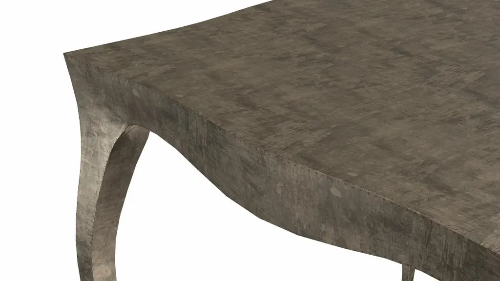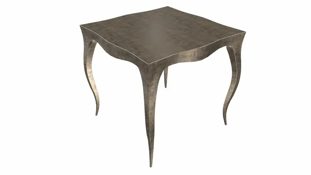 Louis Card Tables from our Louise Collection. The renowned designer Paul Mathieu chose the name “Louise” when he created his more feminine version of Louis XV (1730-1760) furniture. The characteristic cabriole leg, curving outward at the knee and inward towards the foot in an "S" shape was born during this period. It is during the same era that English furniture makers produced the Queen Anne and Chippendale styles.Crafted with utmost care and attention to detail, these Louis Card Tables are made to order and are available in twelve metal clad finishes, ensuring that you can choose the perfect one to match your individual style and taste. The use of high-quality materials and expert craftsmanship ensure that each Art Deco Louis Card Tables is not only beautiful but also a true piece of art.The curved legs and side arms of this Art Deco Louis Card Tables are hand carved from solid pieces of teak. Pattern makers trace and cut complex forms that will cover the chair in a skin of copper, white bronze, brass or antiqued white bronze The metal finishes will tarnish over time. Regular non-abrasive household metal polishes can be used to restore the original luster.Overall, if you're looking for a piece of furniture that combines luxury, comfort, and style, then the Art Deco Card Tables is an excellent choice. With its distinctive curved profile and multiple finish options, this Chair set is sure to elevate the look of any room it is placed in, and be a beloved addition to your home for years to come.The images shown in this listing are shot in different lighting conditions and/or are 3D illustrations. We encourage our customers to please request a sample or a full sample set of 12 finishes so that they can experience the finish first hand. Louise Art Deco Nesting Tables and Stacking Tables Smooth Antique Bronze by Paul Mathieu for Stephanie OdegardSize- 32"x 32"x 30"HMaterials - White Bronze, Metal sheet, Teak, Wood, MetalTechniques: Hand-Crafted, Hand-Carved, Metal Work, Wood Work, Metal Wrapping, PolishedPlease note that moisture in air, sudden change in temperature and natural movement of wood over time causes the metal to wrinkle or bubble up. We use well seasoned, reclaimed teak and high quality marine grade MDF (wherever technically possible) to avoid and delay the mentioned changes. However a perfect stability of metal cannot be guaranteed. Please note that our smooth finish metal clad pieces will have some unavoidable tool marks. This is proof that everything is done by hand. The smooth finish will not come out like a machine made perfect surface and the master artisan will do their best to make it look as good/clean/stable/perfect as he possibly can.The antique white bronze finish is hand done by using an acidic chemical over the white bronze finish to recreate a natural patination. Like with the natural patination of silver, copper, or brass, the final result and color uniformity of the patina cannot be guaranteed. The goal of this finish is to achieve rainbow-like shades with dull, shiny, cloudy, and streaky patches to give an illusion of antiquing. Please note:None of our metal clad pieces are treated with a protective “finish” thus enabling the items to age naturally over time. We will of course polish them well before we pack them. a) Copper oxidizes faster than the other metals. In six to twelve months it will most likely lose its shine and will gradually turn to different shades of brown and/or green/blue. This aging process and its effect is referred to as verdigris. After a year the piece should not change much more. Copper does not rust, but does require periodic cleaning in order to retain its original shine if that the preferred option. ('BRASSO' or any known copper polish can be used to polish copper).b) Brass retains its shine for far longer than others, but will tarnish if not cleaned on occasion. ('BRASSO' is made to polish brass).c) White bronze, has the least tendency to show age or tarnish. If kept in a controlled climate, this metal will hold its shine for years. It can be cleaned with a cleanser and polished with a cloth. d) The antiqued white bronze finish will react with the natural elements the fastest in the beginning but it too will stop reacting and will settle down in a stable state like copper after 6-12 months. Since it is already antiqued and looked like it is tarnished, as described in an earlier message, this fast reaction will not change the over all look. In that way this surface is most forgiving. The images shown in this listing are shot in different lighting conditions and/or are 3D illustrations. We encourage our customers to please request a sample or a full sample set of 12 finishes so that they can experience the finish first hand.