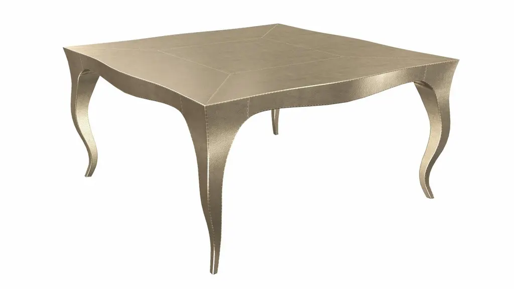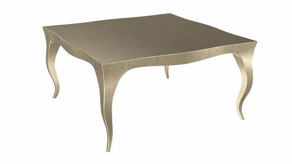 Nesting Tables from our Louise Collection. The renowned designer Paul Mathieu chose the name “Louise” when he created his more feminine version of Louis XV (1730-1760) furniture. The characteristic cabriole leg, curving outward at the knee and inward towards the foot in an "S" shape was born during this period. It is during the same era that English furniture makers produced the Queen Anne and Chippendale styles.Crafted with utmost care and attention to detail, these Louis Nesting Tables are made to order and are available in twelve metal clad finishes, ensuring that you can choose the perfect one to match your individual style and taste. The use of high-quality materials and expert craftsmanship ensure that each Art Deco Louis Nesting Tables is not only beautiful but also a true piece of art.The curved legs and side arms of this Art Deco Louis Nesting Tables are hand carved from solid pieces of teak. Pattern makers trace and cut complex forms that will cover the chair in a skin of copper, white bronze, brass or antiqued white bronze The metal finishes will tarnish over time. Regular non-abrasive household metal polishes can be used to restore the original luster.Overall, if you're looking for a piece of furniture that combines luxury, comfort, and style, then the Art Deco Nesting Tables is an excellent choice. With its distinctive curved profile and multiple finish options, this Chair set is sure to elevate the look of any room it is placed in, and be a beloved addition to your home for years to come.The images shown in this listing are shot in different lighting conditions and/or are 3D illustrations. We encourage our customers to please request a sample or a full sample set of 12 finishes so that they can experience the finish first hand. Louise Art Deco Nesting Tables Fine Hammered Brass 18.5x18.5x10 inch by Paul MSize- 18.5"x 18.5"x 10"HMaterials - Brass, Metal sheet, Teak, Wood, MetalTechniques: Hand-Crafted, Hand-Carved, Metal Work, Wood Work, Metal Wrapping, PolishedPlease note that moisture in air, sudden change in temperature and natural movement of wood over time causes the metal to wrinkle or bubble up. We use well seasoned, reclaimed teak and high quality marine grade MDF (wherever technically possible) to avoid and delay the mentioned changes. However a perfect stability of metal cannot be guaranteed. Please note that our smooth finish metal clad pieces will have some unavoidable tool marks. This is proof that everything is done by hand. The smooth finish will not come out like a machine made perfect surface and the master artisan will do their best to make it look as good/clean/stable/perfect as he possibly can.The antique white bronze finish is hand done by using an acidic chemical over the white bronze finish to recreate a natural patination. Like with the natural patination of silver, copper, or brass, the final result and color uniformity of the patina cannot be guaranteed. The goal of this finish is to achieve rainbow-like shades with dull, shiny, cloudy, and streaky patches to give an illusion of antiquing. Please note:None of our metal clad pieces are treated with a protective “finish” thus enabling the items to age naturally over time. We will of course polish them well before we pack them. a) Copper oxidizes faster than the other metals. In six to twelve months it will most likely lose its shine and will gradually turn to different shades of brown and/or green/blue. This aging process and its effect is referred to as verdigris. After a year the piece should not change much more. Copper does not rust, but does require periodic cleaning in order to retain its original shine if that the preferred option. ('BRASSO' or any known copper polish can be used to polish copper).b) Brass retains its shine for far longer than others, but will tarnish if not cleaned on occasion. ('BRASSO' is made to polish brass).c) White bronze, has the least tendency to show age or tarnish. If kept in a controlled climate, this metal will hold its shine for years. It can be cleaned with a cleanser and polished with a cloth. d) The antiqued white bronze finish will react with the natural elements the fastest in the beginning but it too will stop reacting and will settle down in a stable state like copper after 6-12 months. Since it is already antiqued and looked like it is tarnished, as described in an earlier message, this fast reaction will not change the over all look. In that way this surface is most forgiving. The images shown in this listing are shot in different lighting conditions and/or are 3D illustrations. We encourage our customers to please request a sample or a full sample set of 12 finishes so that they can experience the finish first hand.