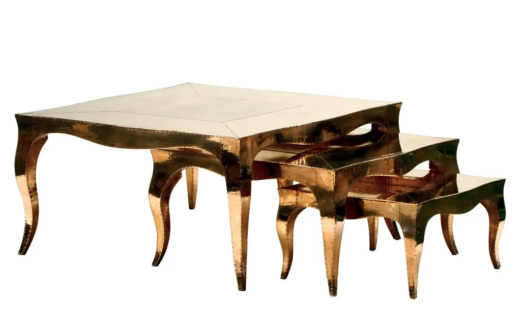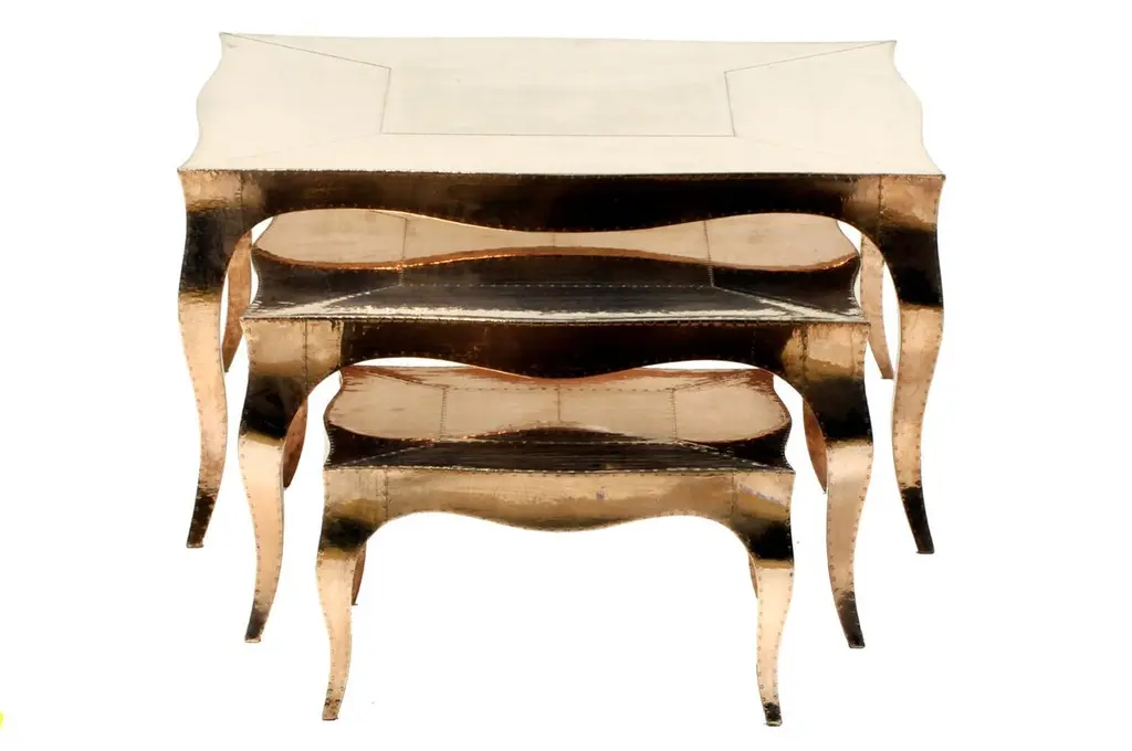 Available Sizes:31.5" x 31.5" x 16"H25" x 25" x 13"H18.5" x 18.5" x 10"H A set of 3 Nesting Tables from our Louise Collection. The renowned designer Paul Mathieu chose the name “Louise” when he created his more feminine version of Louis XV (1730-1760) furniture. The characteristic cabriole leg, curving outward at the knee and inward towards the foot in an "S" shape was born during this period. It is during the same era that English furniture makers produced the Queen Anne and Chippendale styles. The curved legs and side rails of this exceptionally elegant table are hand carved from solid pieces of teak. Pattern makers trace and cut complex forms that will cover the table from thick sheets of copper or silver. Once the table is joined together, it is meticulously encased in a tight-fitting skin of copper or purest silver. The silver used was assayed at 96% purity, which exceeds the minimum standard for sterling of 92.5%. Brass, White Bronze, Antiqued bronze, Silver and Copper are the available options for the metal skin. Both silver and copper will tarnish over time. Regular non-abrasive household metal polishes can be used to restore the original finish.Customization is our specialty. Please get in touch with us for any custom inquiries.Please note that moisture in air, sudden change in temperature and natural movement of wood over time causes the metal to wrinkle or bubble up. We use well seasoned, reclaimed teak and high quality marine grade MDF (wherever technically possible) to avoid and delay the above mentioned changes. However a perfect stability of metal cannot be guaranteed.Please note that our smooth finish metal clad pieces will have some unavoidable tool marks. This is proof that everything is done by hand. The smooth finish will not come out like a machine made perfect surface and the master artisan will do their best to make it look as good/clean/stable/perfect as he possibly can. Our hammered finishes are a much safer option if the tool mark scratches are unacceptable. The hammered finishes are also safer against eventual bubbling/wrinkles due to natural forces as mentioned above. We would love to send you some samples before order confirmation so that the finish can be judged and experienced first hand.Prices do not include shipping from India (for custom orders) or our MN warehouse (items from stock). That will be additional.