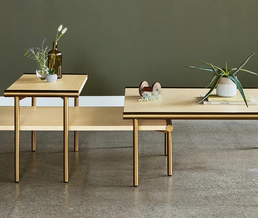 Bauhaus-inspired design gets a contemporary update with the Manifold collection. Featuring elegant, clean-lined tables that can stand alone or nest together, the well-considered silhouettes optimize space with innovative design compatibility. The square coffee table serves as an ideal companion for sectionals or a grouping of armchairs, bringing people together for meaningful interaction. While the tabletop provides ample space to spread out, the slender metal legs contribute to an overall light, sleek aesthetic. Available in two combinations—Blonde Ash with Brass or Walnut with Pewter – each with the promise to elevate your space.