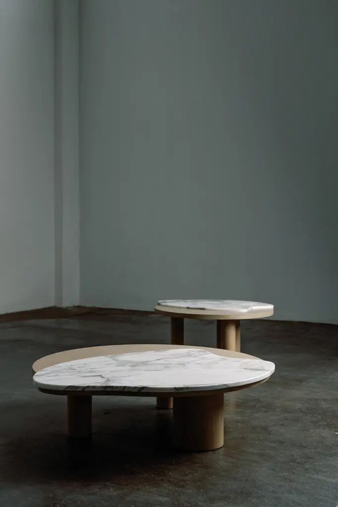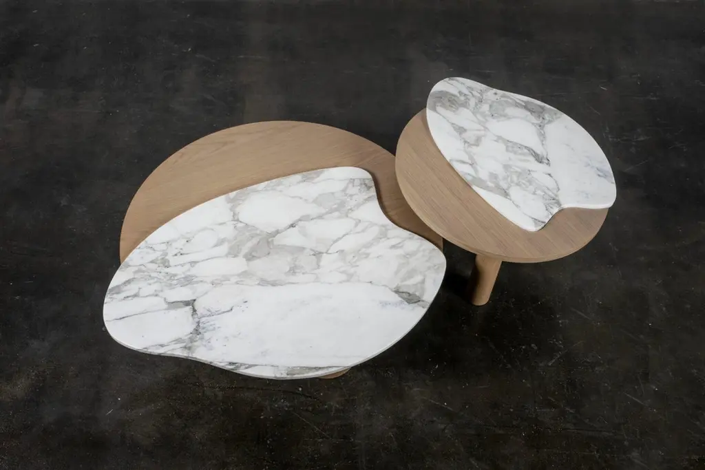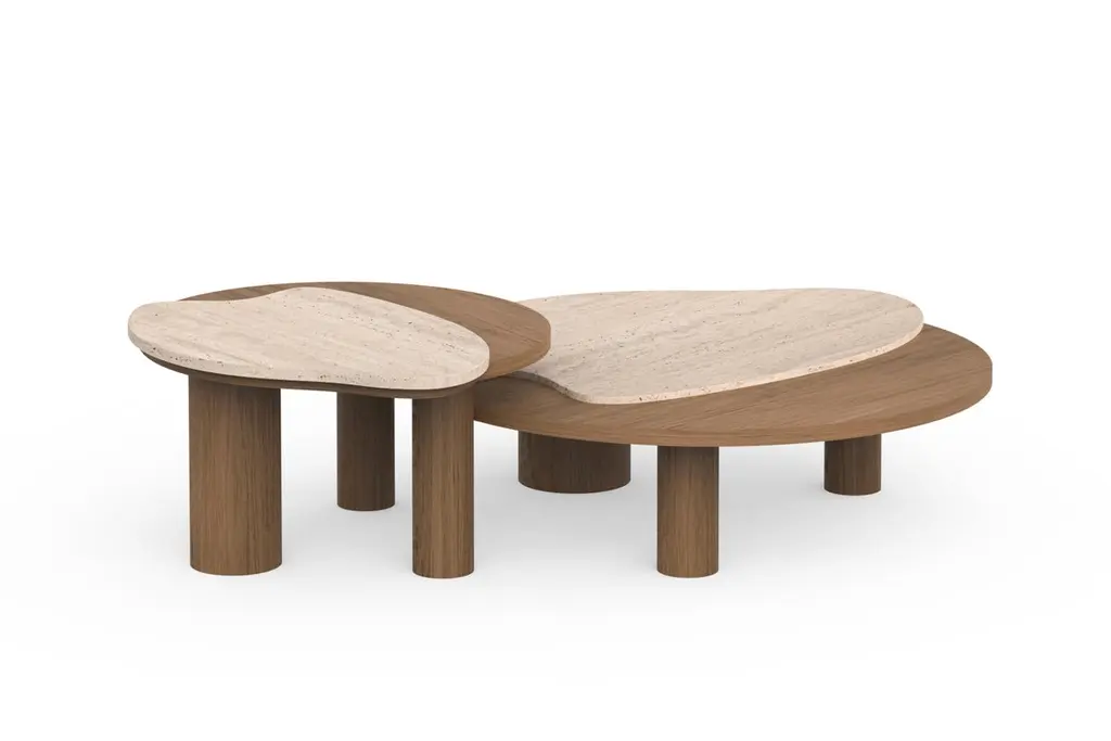 Mid-Century Modern Set/2 Bordeira Nesting Coffee Tables, Contemporary Collection, Handcrafted in Portugal - Europe by Greenapple.The Bordeira nesting coffee table was designed to bring the essence of nature into interior spaces, drawing inspiration from the captivating lines of Bordeira Beach. Through its sweeping curves, ocean meets the land in perfect harmony, expressing the true freedom of organic design. A favorite piece among designers, the Bordeira nesting coffee table combines fine craftsmanship and noble materials, making it the ideal centrepiece for contemporary interiors.The Bordeira coffee table set consists of two coffee tables, each featuring wooden cylindrical legs and top, veneered in American oak stained in light chocolate with open-pore and matte varnish. The veneer is anti-fungal and vermin-free.A honed Travertine Limestone inlay detail in beige tone adds contrast to the design.The Bordeira coffee table set can be customized in terms of dimensions, materials and finishes.Set of 2 Bordeira nesting coffee tables dimensionsMedium:W.81 x De.69 x H.38cmW.31.9 x De.27.2 x H.15 in.Large:W.111 x De.100 x H.28cmW.43.7 x De.39.4 x H.11 in.Set of 2 Bordeira nesting coffee tables material codesWD146 American Oak, Stained Open-pore, Varnished, Light Chocolate, MatteST065 Travertine Limestone, Honed, Beige, MatteHandcrafted in Portugal - Europe by GreenappleUnique by design, Crafted by peopleGreenapple transforms contemporary spaces into exclusive narratives of design and craftsmanship. From custom-made furniture to bespoke interiors, each creation is a timeless work of art, shaped by master artisans who honor centuries-old techniques.Founded in 2005 by Sérgio Rebola and Rute Martins, Greenapple has earned global recognition among high-end clientele and leading design firms. While Rute designs each unique piece, Sérgio ensures uncompromising quality from design to production and from production to your home. We provide a seamless experience, offering short production lead times, worldwide delivery within 7 to 10 days, and white-glove service upon request.For U.S. clients, we can handle all customs clearance, cover duties, and offer white-glove service as well upon request.Nested Coffee Table, Stacking Coffee Table, Nesting Table Set, Set of Tables