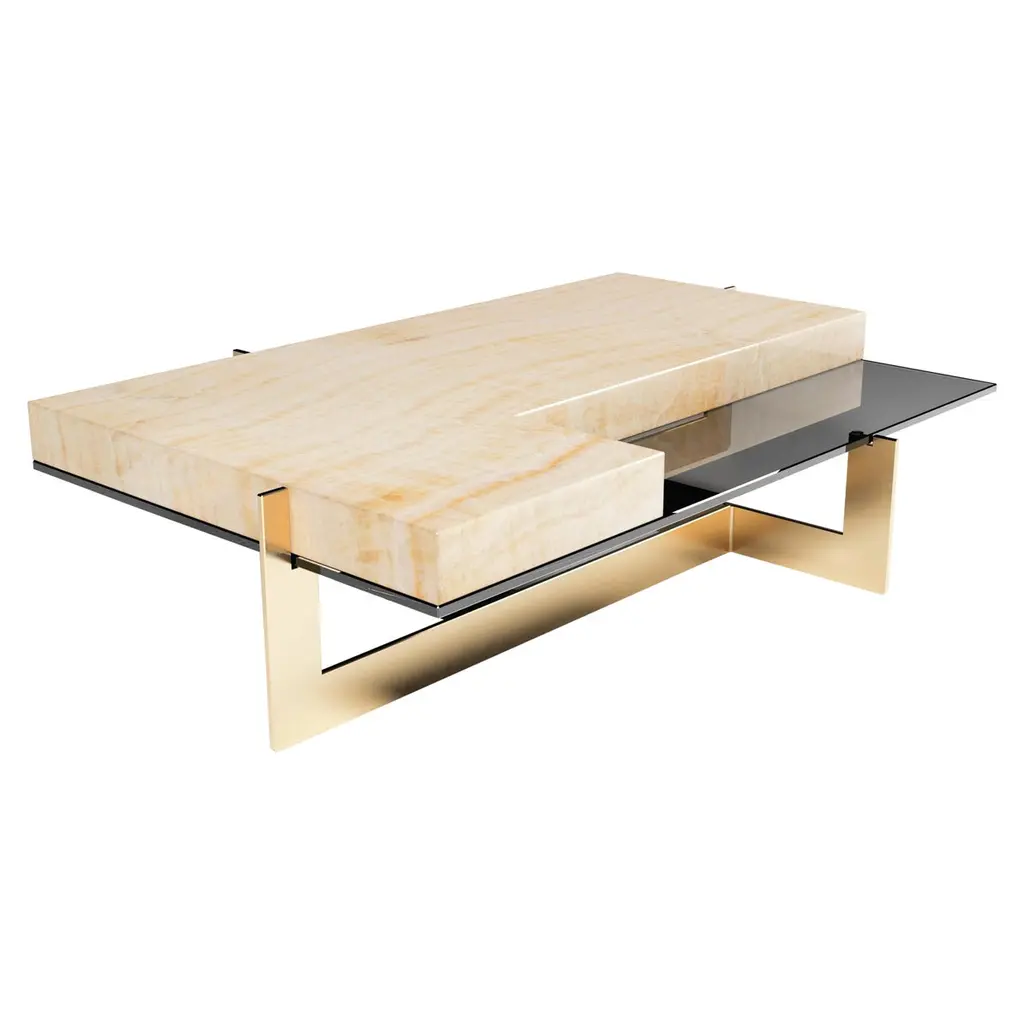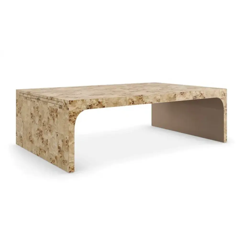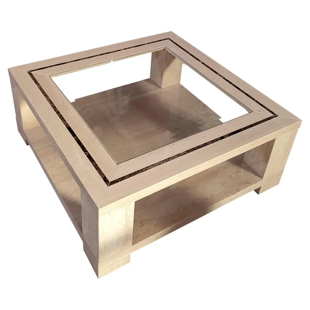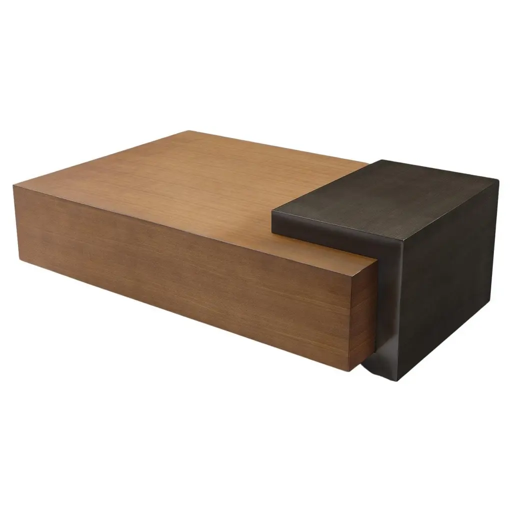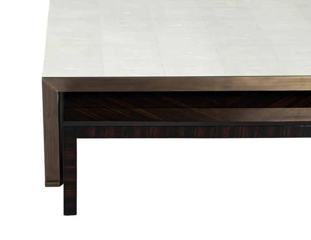 Modern Faux Shagreen Coffee Table with Macassar Nesting Tables. This Carrocel custom creation is stunning. Featuring a textured faux shagreen top framed in hand applied stainless steel metal with a champagne plated finish color. Completed with beautiful pullout nesting tables in rich macassar woods, finished in a high gloss hand polished finish. This beautiful piece is all handcrafted and made to order. Price includes complimentary curb side shipping within the continental USA.