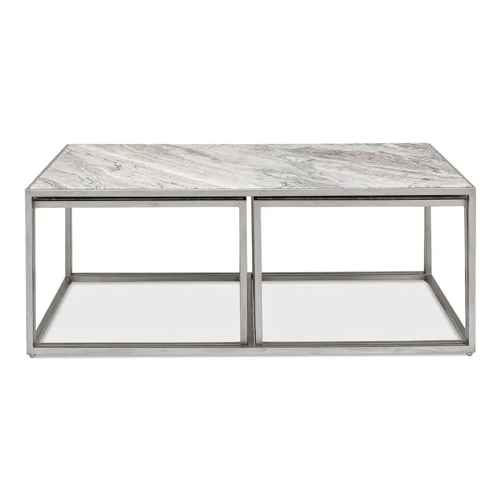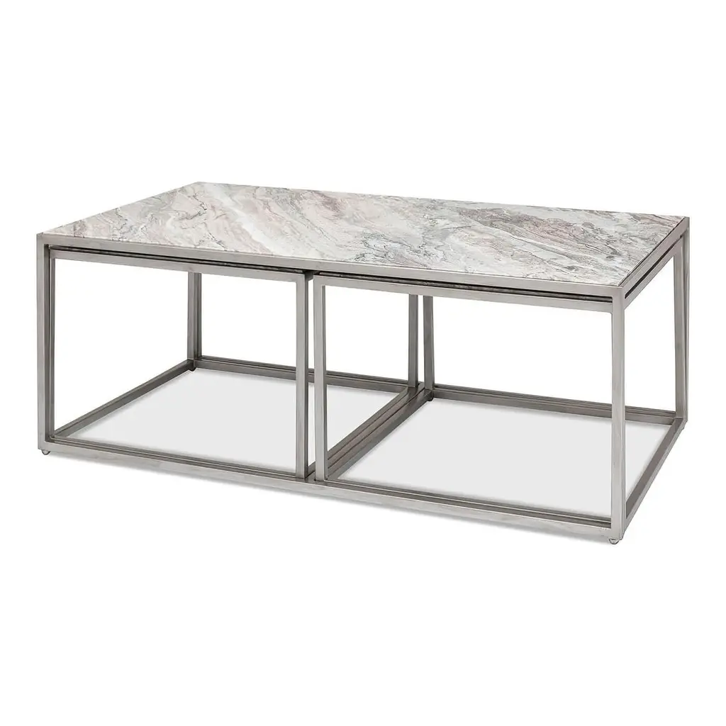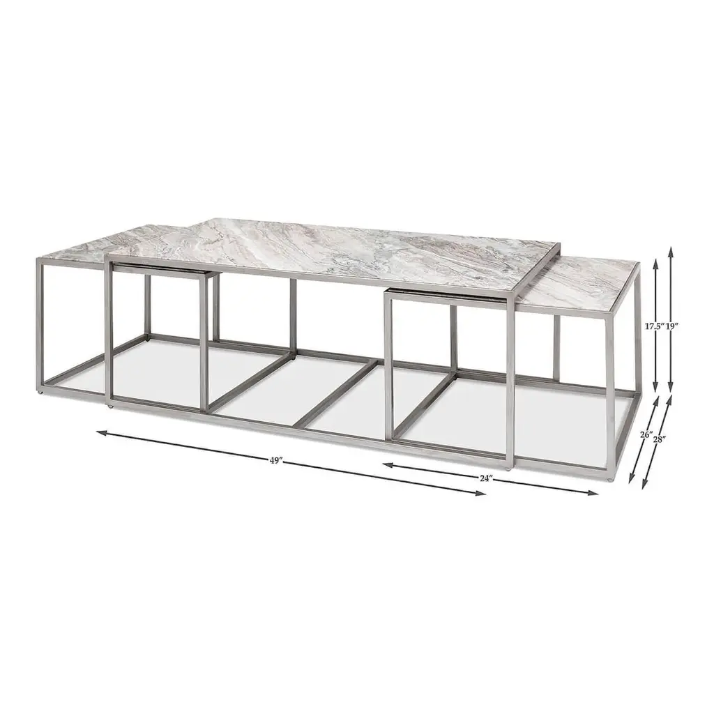 Modern marble 3 piece coffee table set. An elegant marble top sits on a metal base in an antique silver finish. The classic nesting table design includes a longer coffee table with two smaller tables that can slide in and out of the frame.When the smaller tables are pulled out of the frame they can easily be used for extra surface space and can even double as small end tables. The small tables slide into the frame when not in use, and transform this piece into a smaller classic rectangular coffee table shape.The marble top has a beautiful grey/taupe color. Color variations are normal and acceptable when working with natural stone. Dimensions: L 49" W x 28" D x 19" HSquare tables: 24" W x 26" D x 17.5" H.