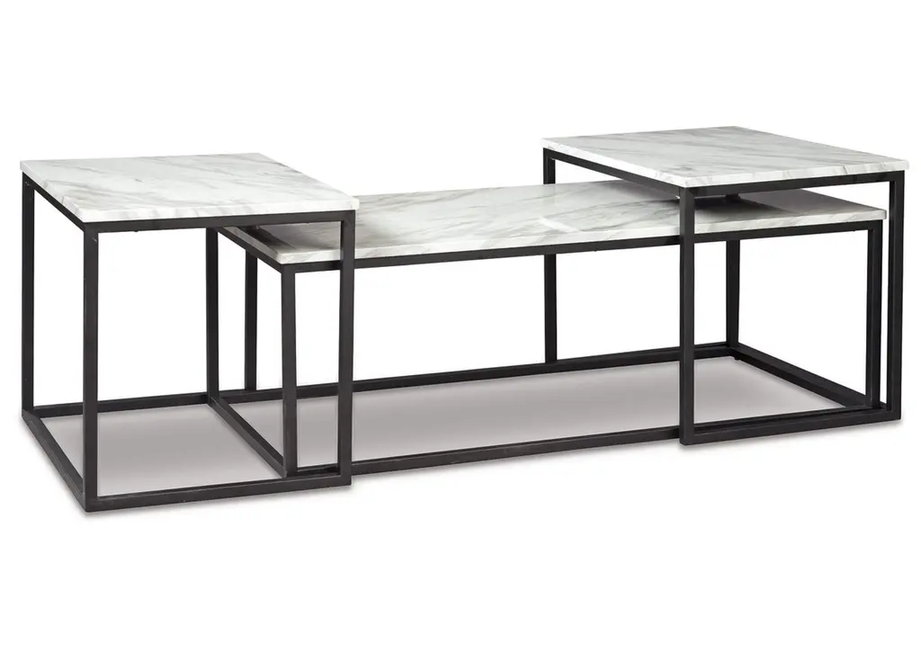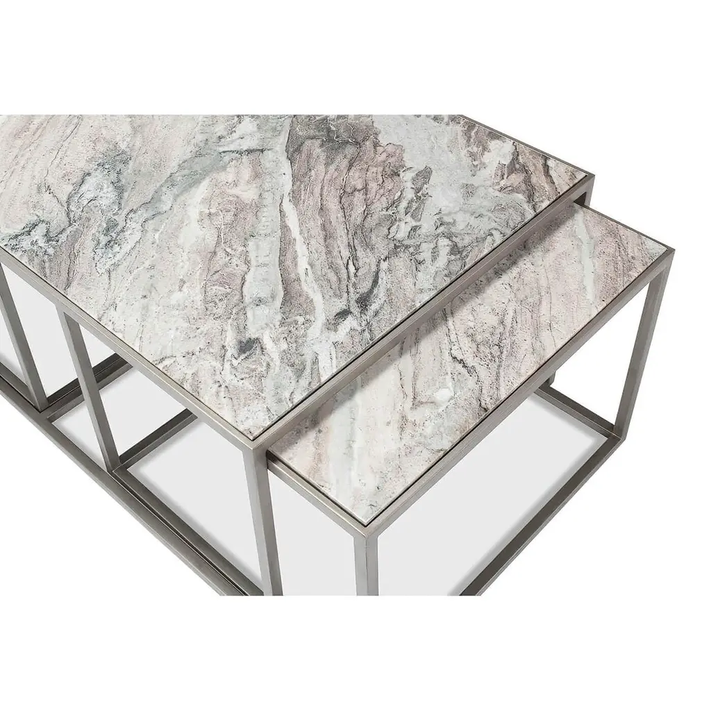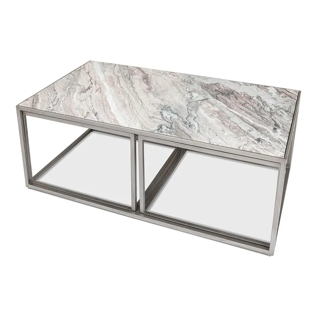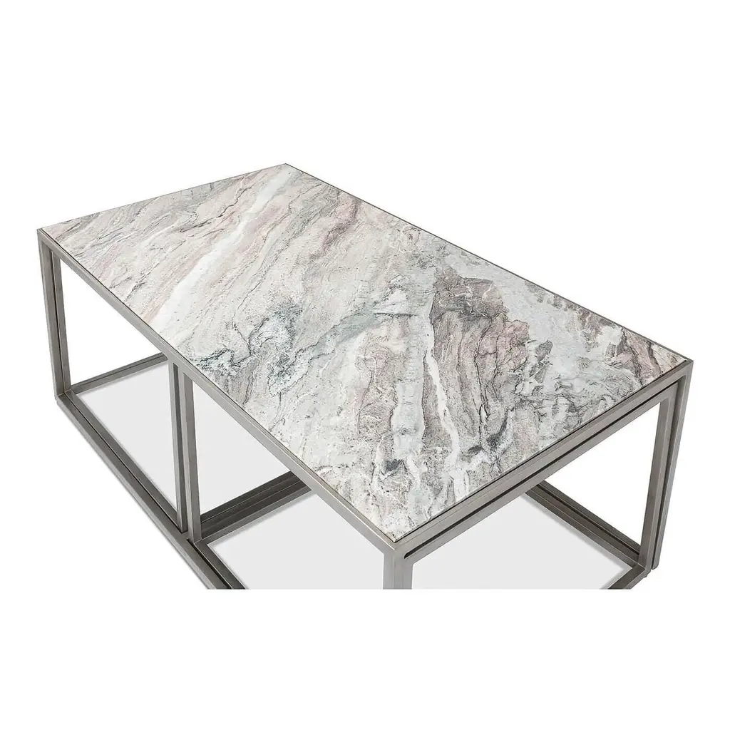 Modern marble 3 piece coffee table set. An elegant marble top sits on a metal base in an antique silver finish. The classic nesting table design includes a longer coffee table with two smaller tables that can slide in and out of the frame.When the smaller tables are pulled out of the frame they can easily be used for extra surface space and can even double as small end tables. The small tables slide into the frame when not in use, and transform this piece into a smaller classic rectangular coffee table shape.The marble top has a beautiful grey/taupe color. Color variations are normal and acceptable when working with natural stone. Dimensions: L 49" W x 28" D x 19" HSquare tables: 24" W x 26" D x 17.5" H.