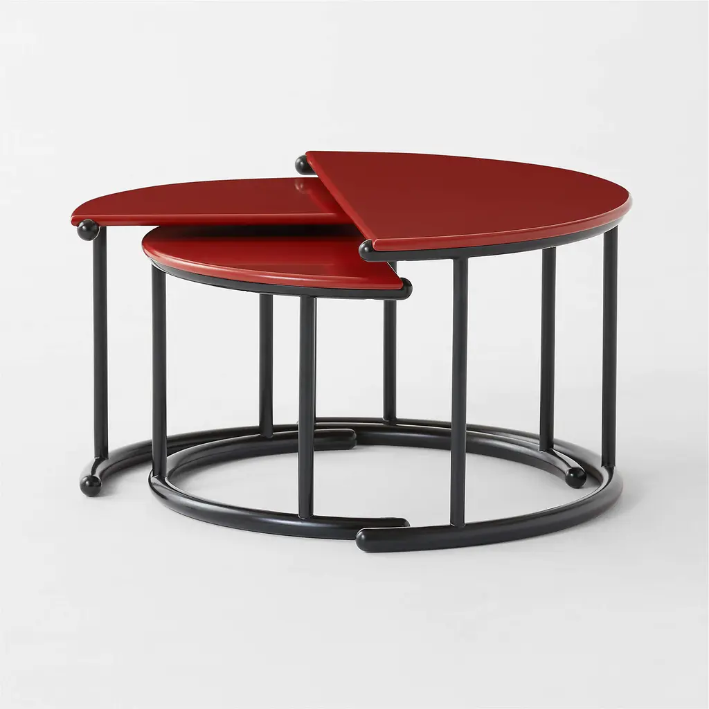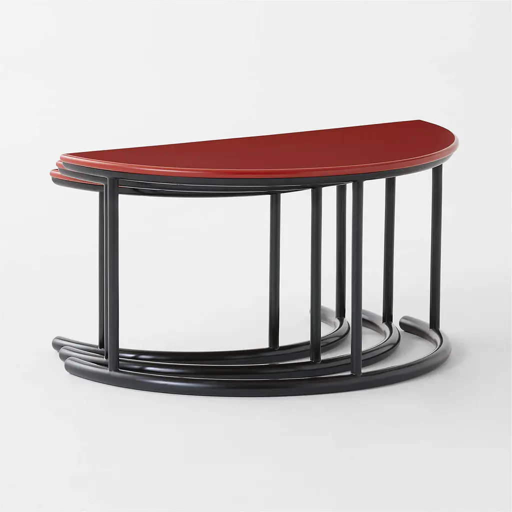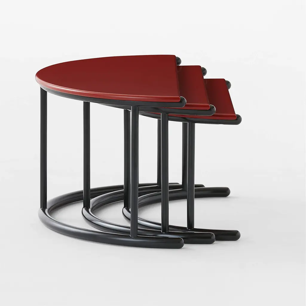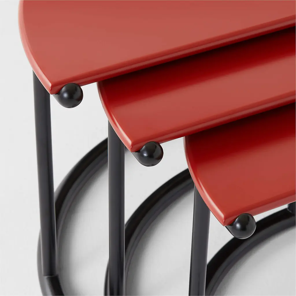 The legacy of Italian designer Gianfranco Frattini includes his variety of nesting tables—a space-maximizing, eye-catching concept that feels as fresh today as it did when he designed them in the 1980s. Paying homage to the original, this set of three tables encompasses postmodernism at its finest. Each table features a semi-circular tabletop lacquered in candy-apple red, set atop a curved base. Crafted with beech wood certified sustainable by the Forest Stewardship Council ® (FSC), the nesting tables create a playful and cohesive aesthetic with impressive functionality. Arrange them in a cascading pattern or create a multi-tiered circle; either way, the result is pure style. CB2 exclusive.