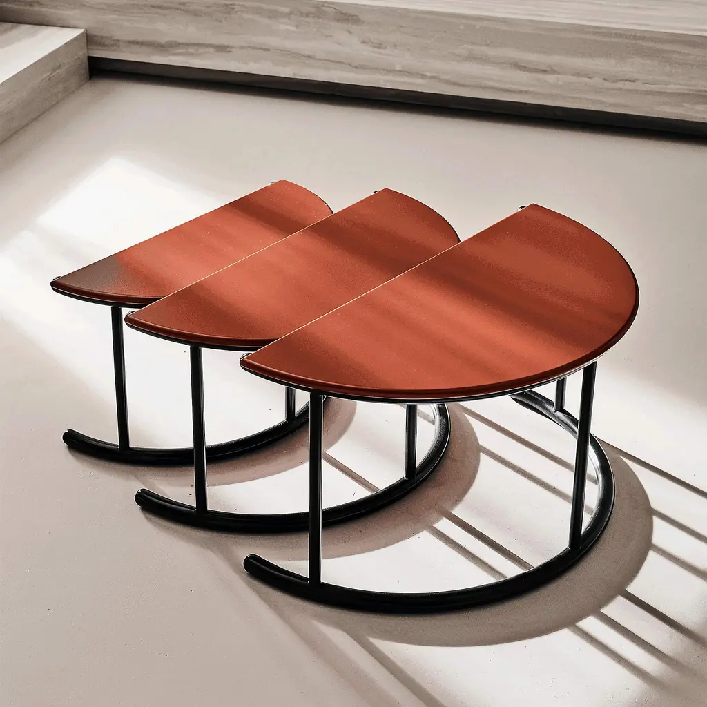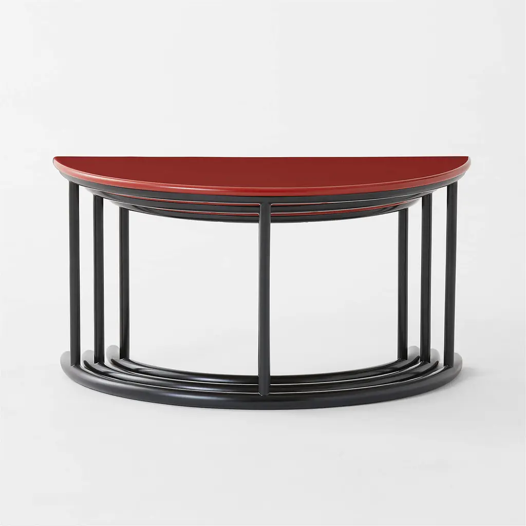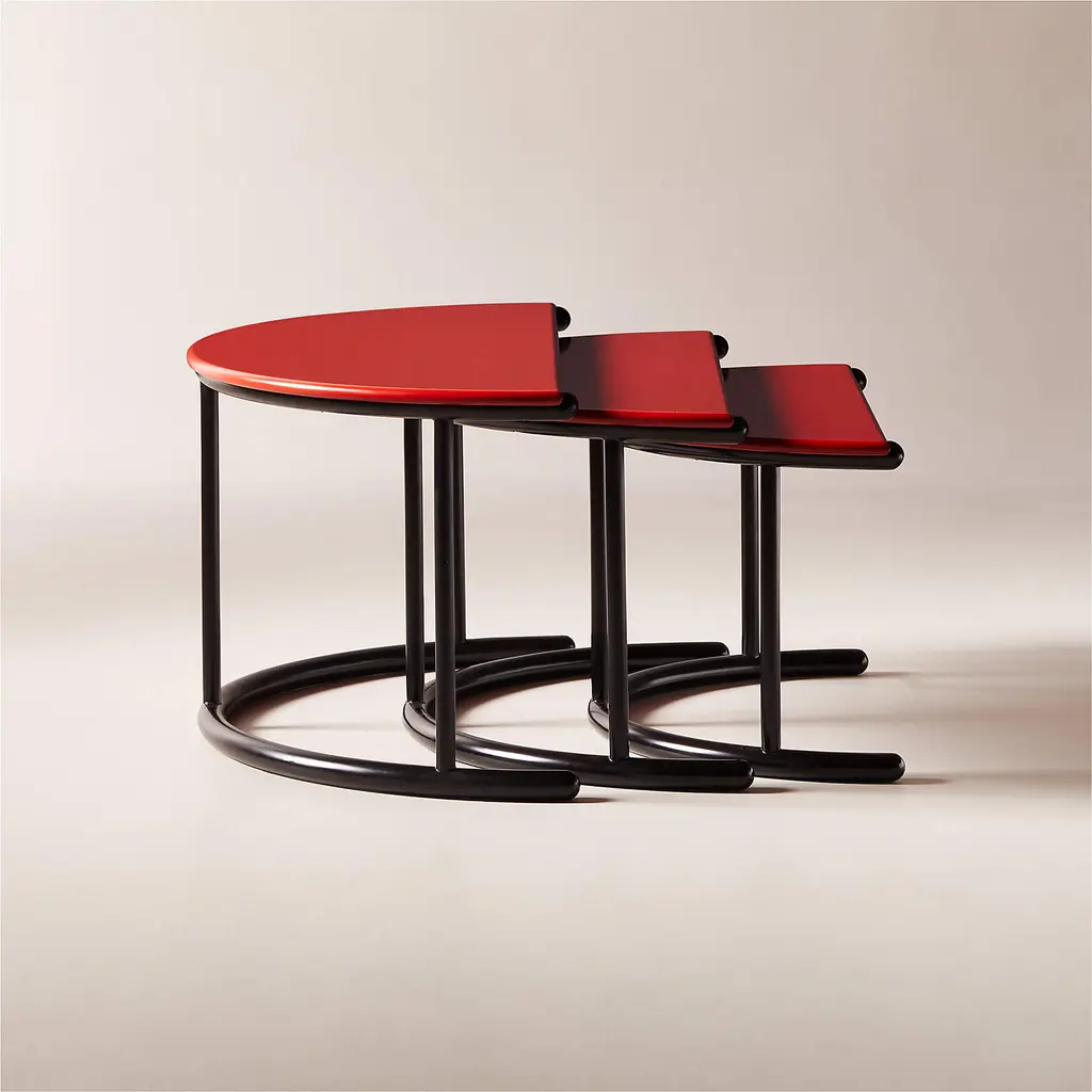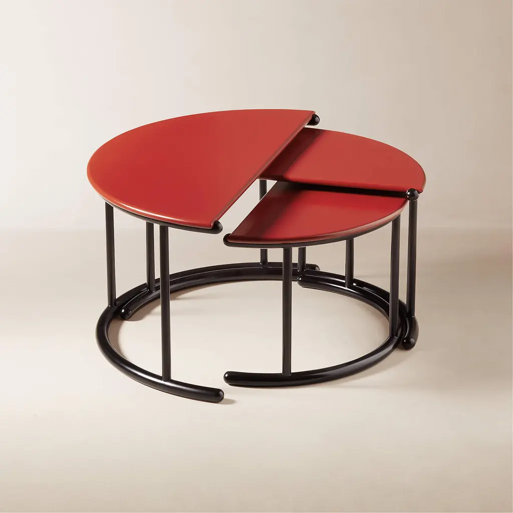 The legacy of Italian designer Gianfranco Frattini includes his variety of nesting tables—a space-maximizing, eye-catching concept that feels as fresh today as it did when he designed them in the 1980s. Paying homage to the original, this set of three tables encompasses postmodernism at its finest. Each table features a semi-circular tabletop lacquered in candy-apple red, set atop a curved base. Crafted with beech wood certified sustainable by the Forest Stewardship Council ® (FSC), the nesting tables create a playful and cohesive aesthetic with impressive functionality. Arrange them in a cascading pattern or create a multi-tiered circle; either way, the result is pure style. CB2 exclusive.