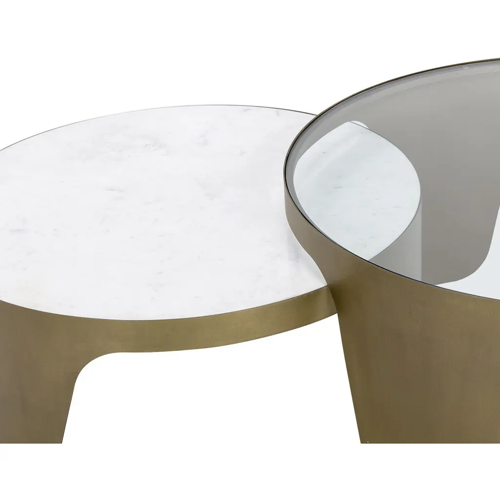Make a statement with the modern and sculptural design of the Mysaria Nesting Coffee Tables. Features one clear glass top and one white marble top. Finished with an antique brass iron base. As marble is a natural material, unique veining, pitting, fissures, micro-cracks and colour variations are all characteristics that add to the uniqueness and beauty of each piece. Made in India. With refined craftsmanship, this design was brought to life by skilled local artisans. Due to the nature of handcraftsmanship, unique imperfections such as fissures, markings and variations in colour and shape are welcomed and appreciated characteristics for a truly one-of-a-kind piece.
