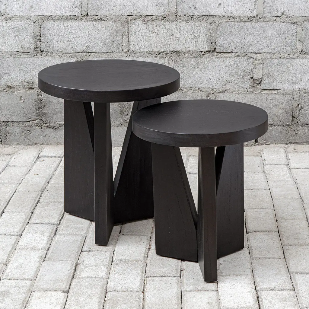 Modern And Sophisticated, This Set Of Two Nesting Tables Features Strong Angular Lines And Is Layered In Dark Espresso Finished Mindi Veneer. Sizes: Sm-16x19x16, Lg-18x22x18