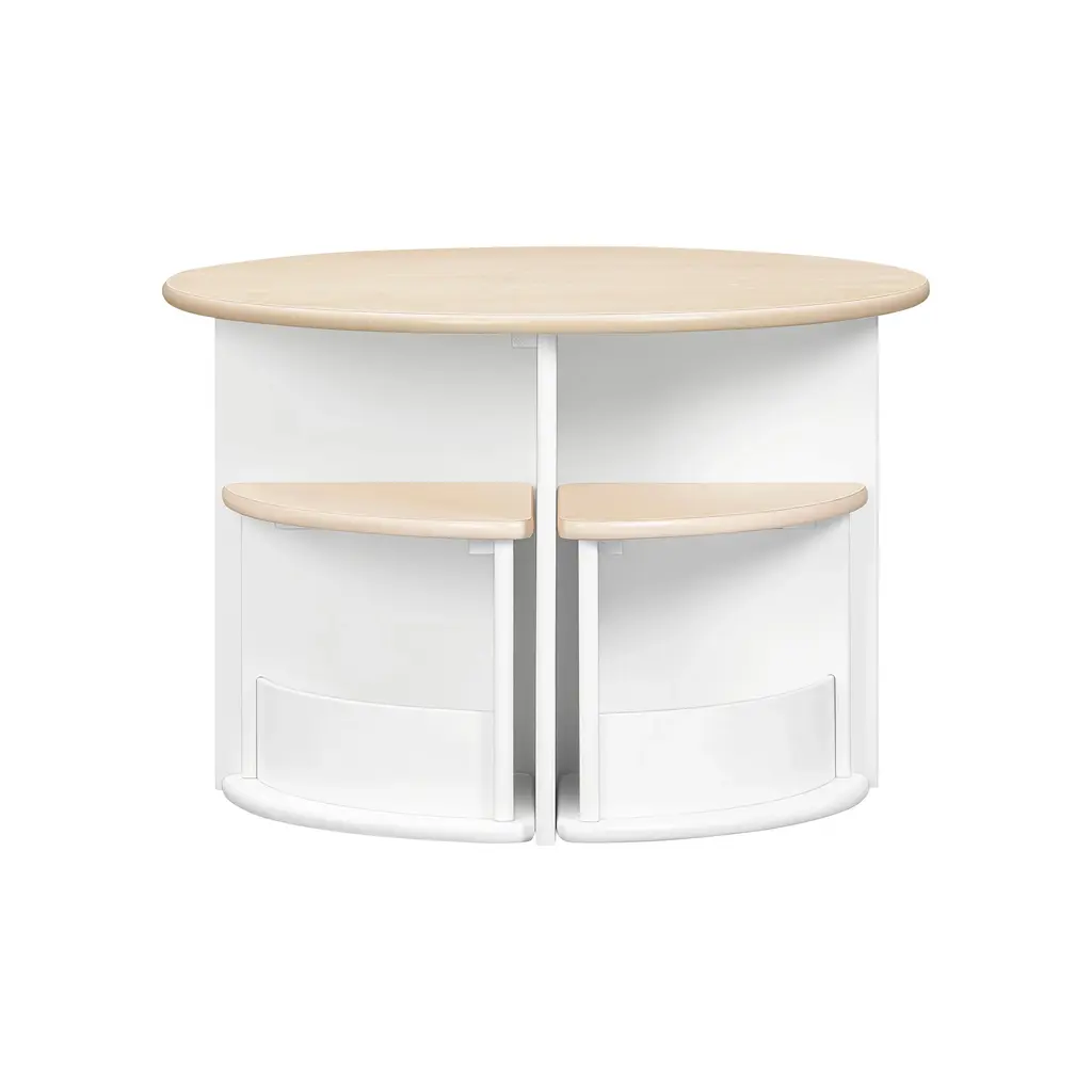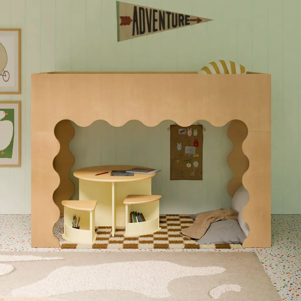 A delightful blend of function and fun for the playroom, the Nessa Nesting Play Table from Babyletto is a modern, space-saving essential. This clever set includes a low-profile table and four perfectly proportioned chairs that tuck seamlessly underneath to keep your space tidy. Each chair features a built-in cubby for stashing books or art supplies, keeping essentials off the floor and within easy reach. A fusion of thoughtful function and modern style, it’s the perfect spot for little creators. Highlights: