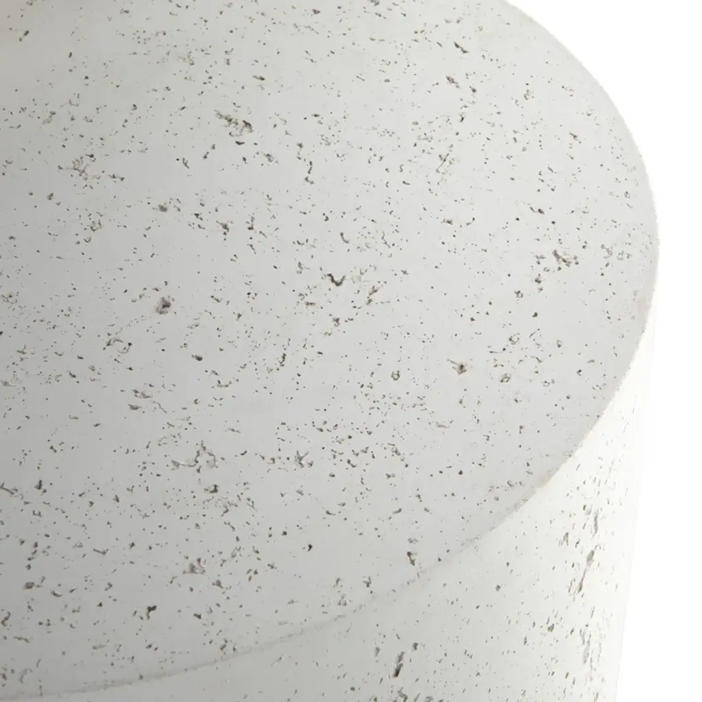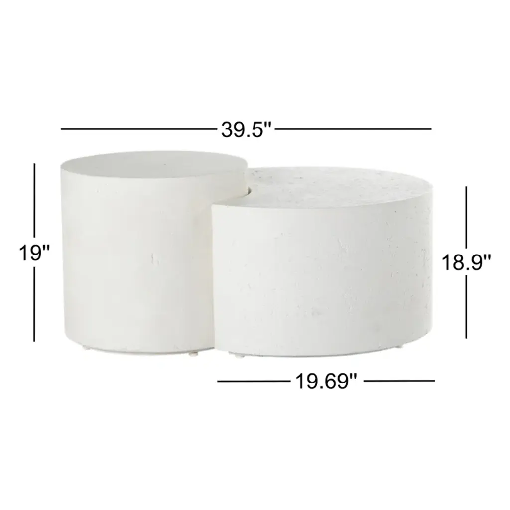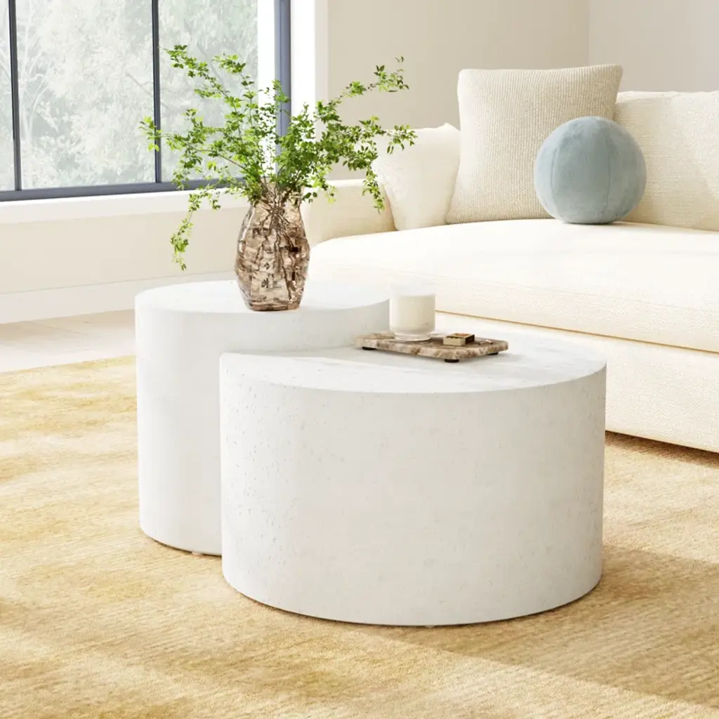 Made from white-finished concrete with deep, textured pitting inspired by mid-century coral décor, a nesting coffee table features two tiers for a layered look with modernity. Indoors or out; cover or store inside during inclement weather and when not in use.