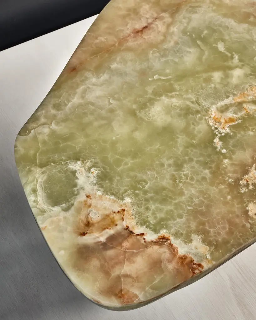 An organic shaped nesting table made of Green Onyx and Brushed Aluminum, this coffee table set allows for various configurations.The larger table is 15"H and the smaller table is 13"H - a beautiful nesting of precious stone that allows for a larger or smaller footprint. The larger table is 50" x 36" while the smaller table is 42" x 24". Sizes can be customized. The Green Onyx top is elegantly supported by a brush-finished and hand-waxed aluminum base and playfully asymmetric legs that explore harmony and balance through proportions. The Oni Nesting Coffee Tables are a timeless blend of ephemerality and enduring craftsmanship and a perfect addition to any space.The tables can be customized in various colors and metal options, such as brushed brass or blackened brass or steel.